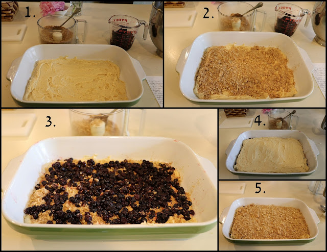 This coffee cake is light and fluffy. I decreased the sugar from the original recipe by half a cup and still think it is sweet enough. You can use cubed fresh pears in this recipe instead of blueberries. You can also use pecans instead of walnuts in the topping. This would be nice for brunch along side a savory dish.