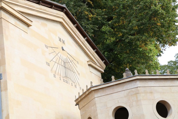 We were at the Holywell Cemetery before we made our way to Magdalen along Longwall St. and we noticed this sundial. The dial is formed from metal lines and characters attached to the south facing stone wall of the Grove Auditorium. Upright hour numerals are VII – XII – VI, and hour and half-hour lines run each to their own unmarked circular arc around the gnomon root. The gnomon is a thin un-supported rod springing from a small disc on the wall. Above the dial is ‘M M’ for both Mary Magdalen and the year 2000. On with our journey to the entrance to Magdalen college on High St.