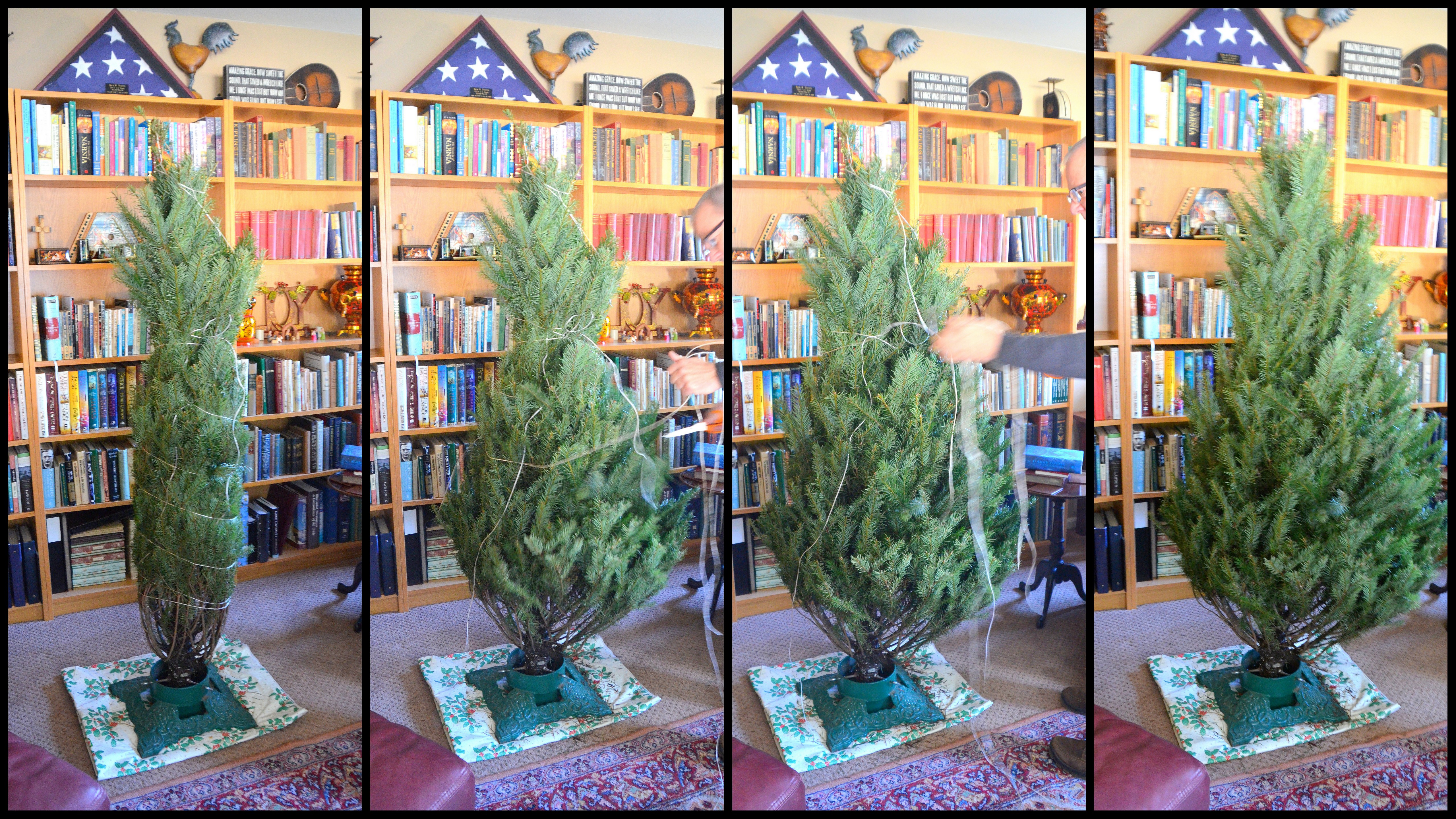 This year while I was having fun downtown with our oldest, Dear did the honors of picking out the mystery tree and bringing it home. He set it up in it’s designated spot this year and waited for me to come home from gallivanting and to cut the string while I watched the reveal. Another stress free tree that will serve our purposes well.