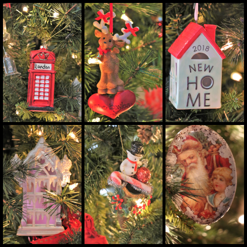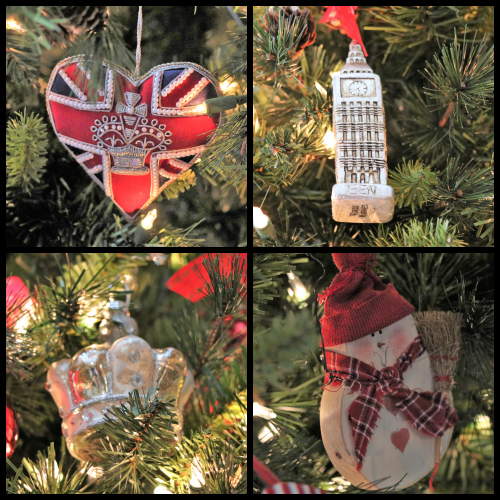 The ornaments on the tree have no overall theme. Some are from travels to Great Britain.