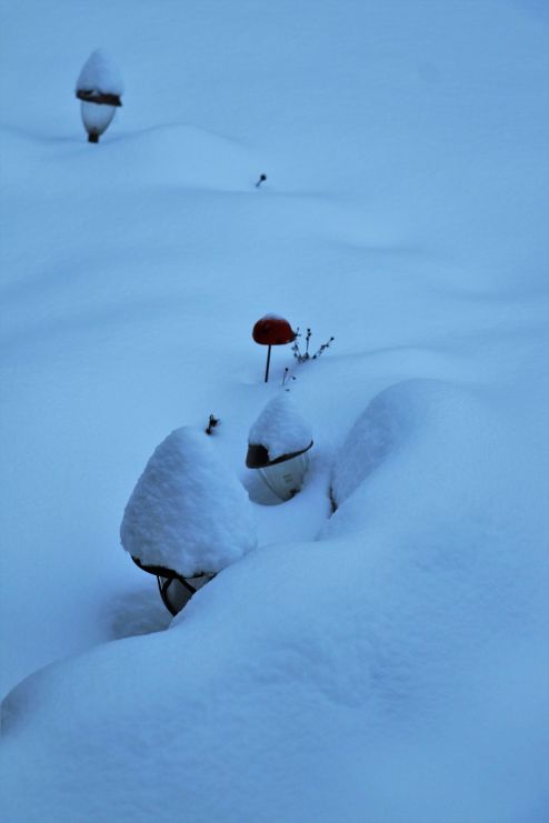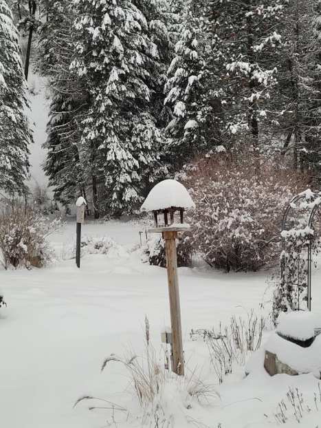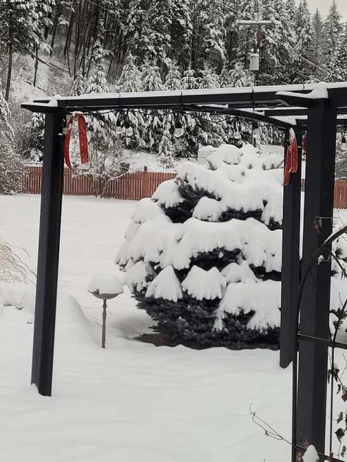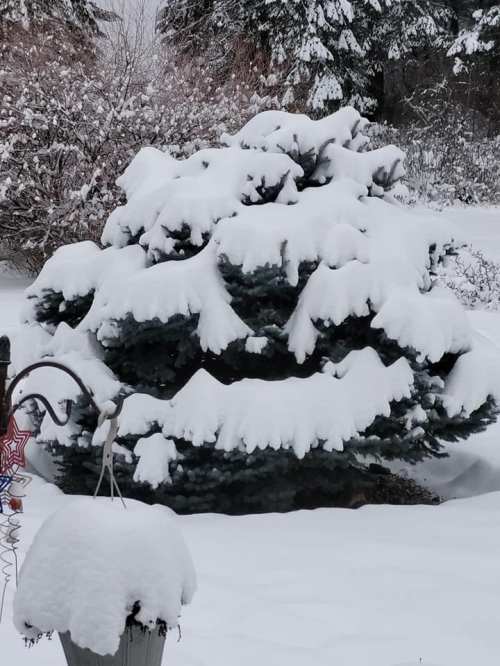 Our round of snow early in the morning of the 22nd created an interesting layering. On our Global Blue Spruce it looks like someone placed kitchen towels out to dry. Or maybe white skirts with scalloped bottoms. Or a layer of Fondant Frosting. 🙂