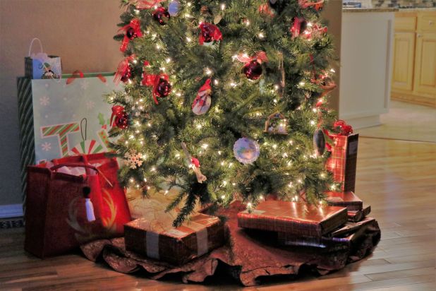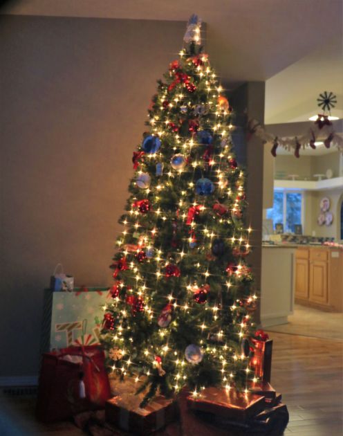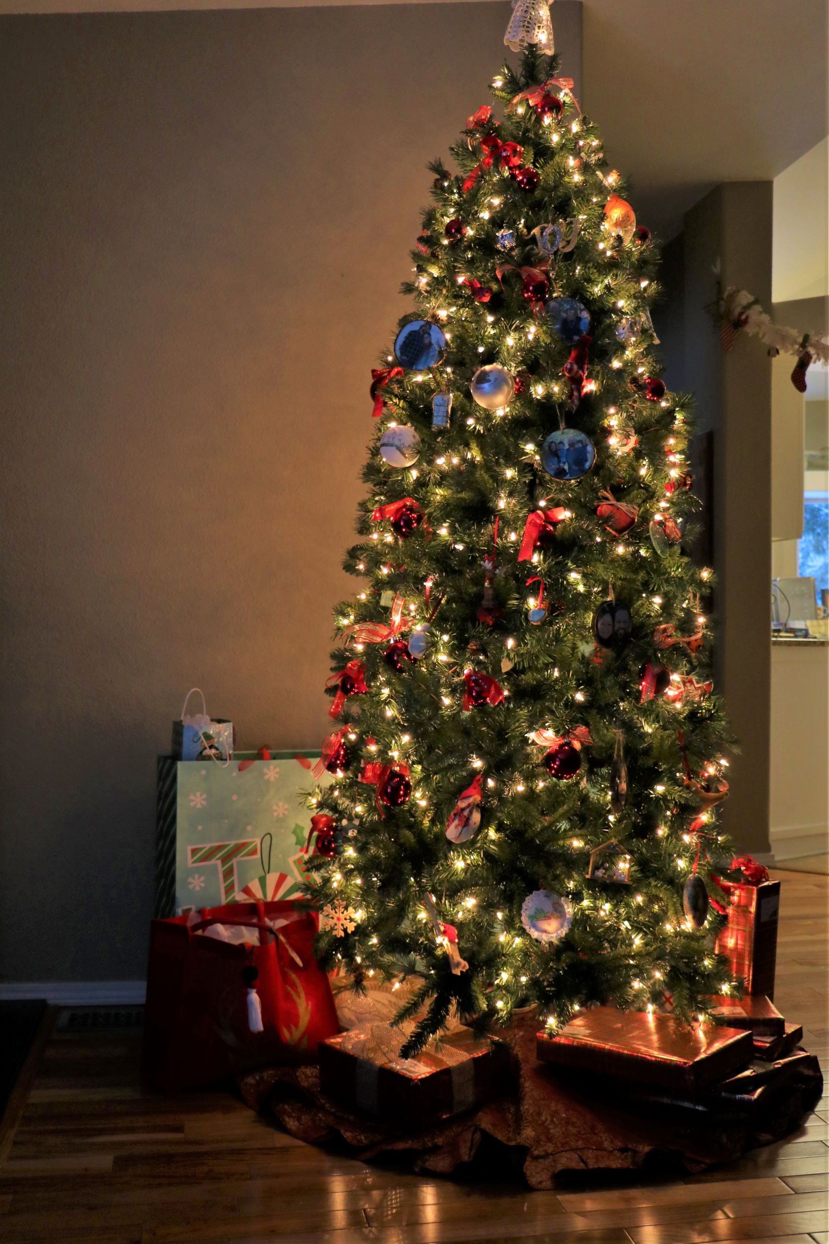 We go to the nearest big box store and look for a tree in a certain height with a straight trunk and grab it with it’s string or netting in tack. This year the 6-7ft. trees in the Douglas Fir variety were about $25.00. We throw the tree in the back of the truck and head home wondering what it might look like once we cut away all the string.