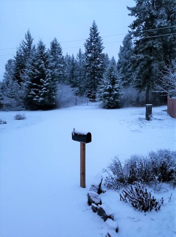We are having our first December snow that will linger and I’ll be driving in it for the first time since we moved. Our road is a 50mph road and I’m watching cars and trucks going slower then usual. They’ll not enjoy driving behind me because I’ll be going real slow and steady. I’m a wimp in the snow. Our motion sensor light above our garage was on this morning because of the snow falling. The little birds were flying under Dear’s parked truck and congregating there. Where do little birds go ?