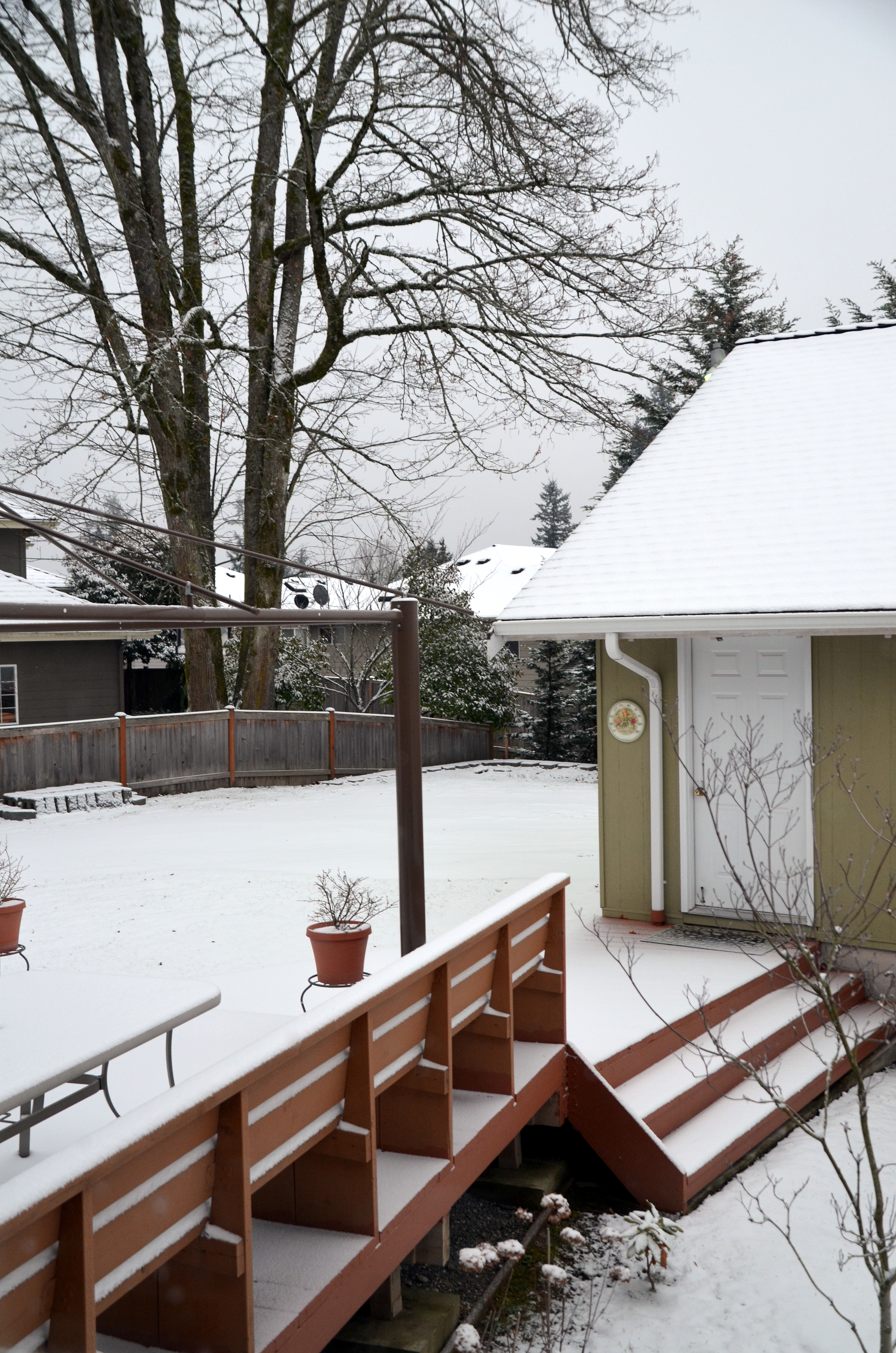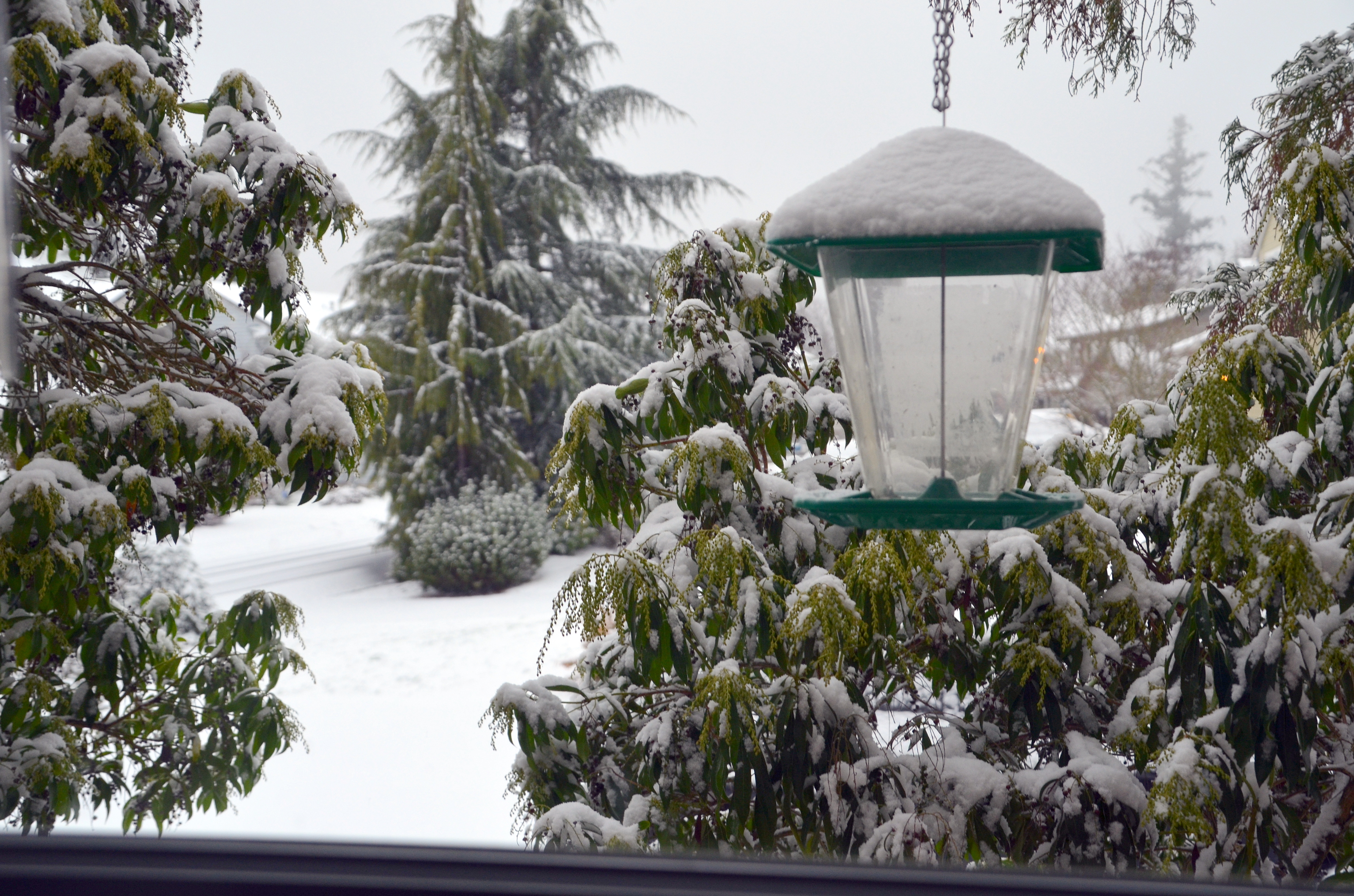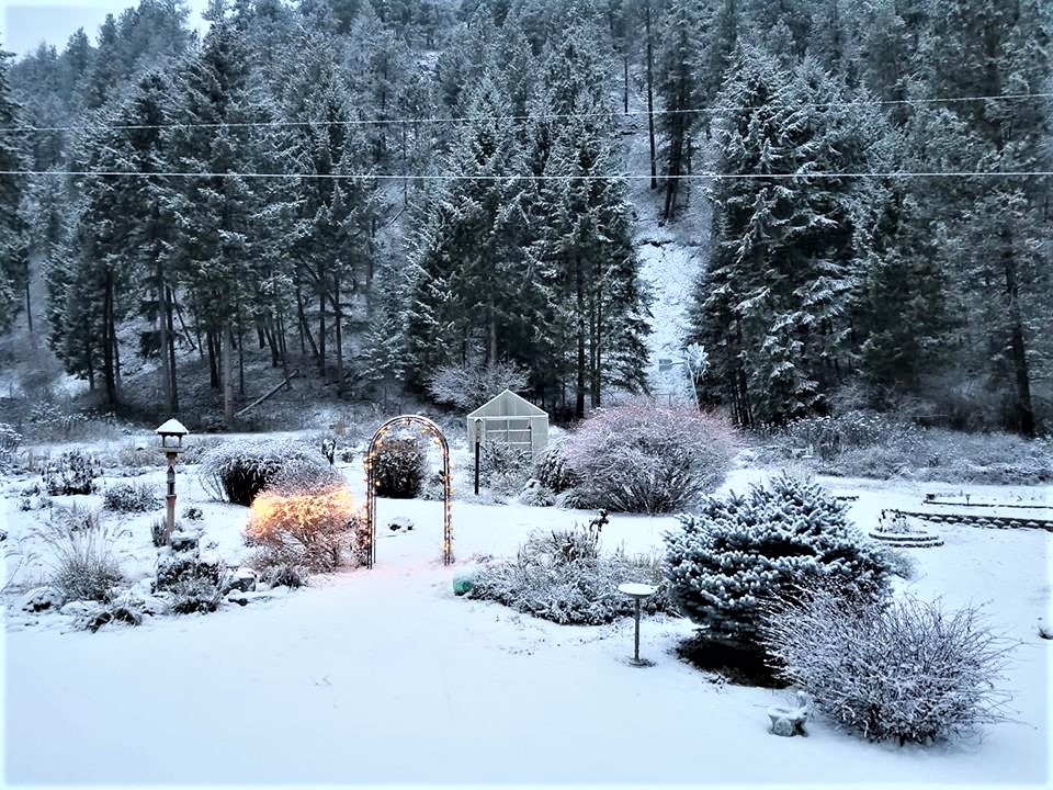 We are having our first December snow that will linger and I’ll be driving in it for the first time since we moved. Our road is a 50mph road and I’m watching cars and trucks going slower then usual. They’ll not enjoy driving behind me because I’ll be going real slow and steady. I’m a wimp in the snow. Our motion sensor light above our garage was on this morning because of the snow falling. The little birds were flying under Dear’s parked truck and congregating there. Where do little birds go ?