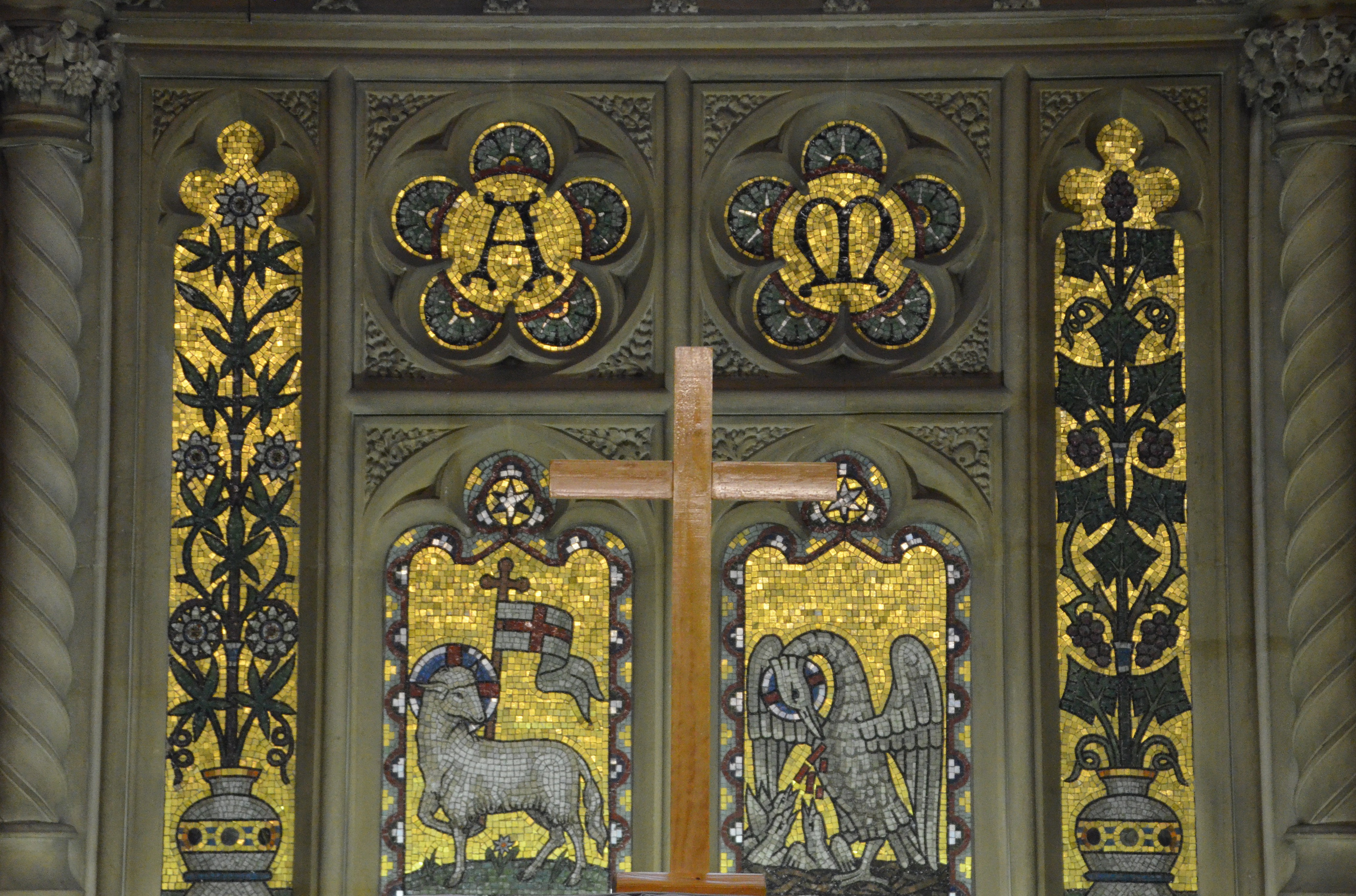 The Thames 100 - Copy - Copy In my reading about this church after the fact I found that this and the next mosaics were by Antonio Salviati (1816-1890), who adorned The Altar of Westminster Abbey. Adoring Angels flank the Lamb with flag, and a pelican feeding its young, symbols of Humility and Sacrifice. Here are the adoring Angels.