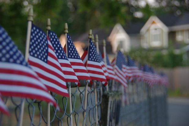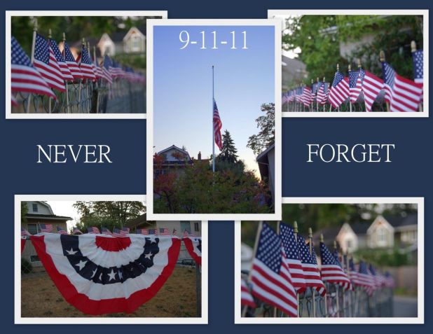 This photo was taken 9-11-11. Whoever was alive that day in 2001 will never forget that day and all the evil that unfolded. The collage below was also from the 10 year anniversary. All the little flags in the collage came from the Sounders game we attended during the 10 year anniversary. A flag had been placed at every seat in the stadium. Josh and I gathered up a 100 little flags that were left behind when the game ended. I displayed them all on our chain link fence at the 10 year anniversary.