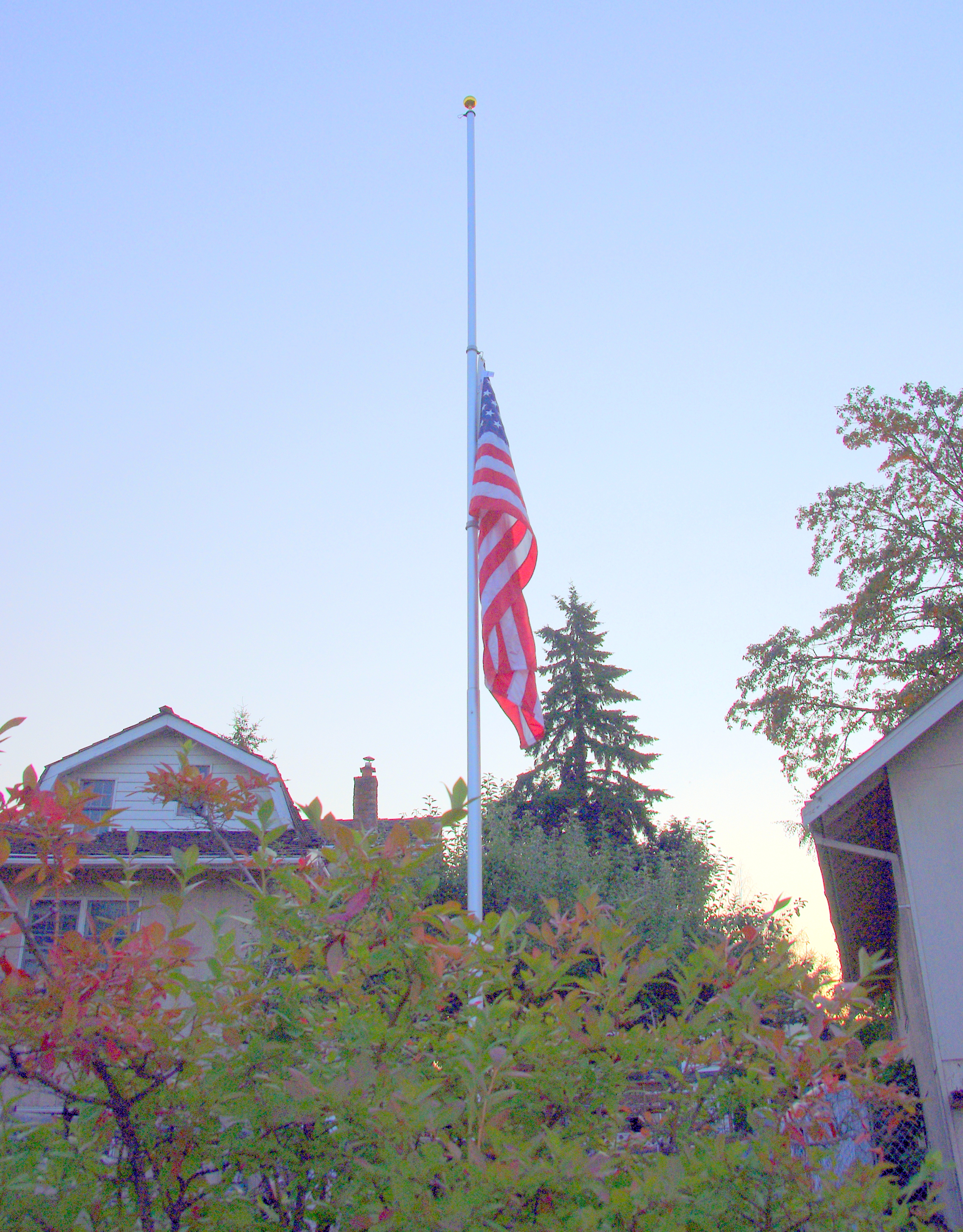 This flag that I unfurled out the window of our daughter’s room in 2001 is the flag that was presented to my mother-in-law, Verna, at Dear’s father Rex’s funeral in 1985. He served in the U.S. Army during WWII. This window is on the street side of our home. Things have changed on this side of the house but the memories are the same. This flag is folded and in a special flag case now.