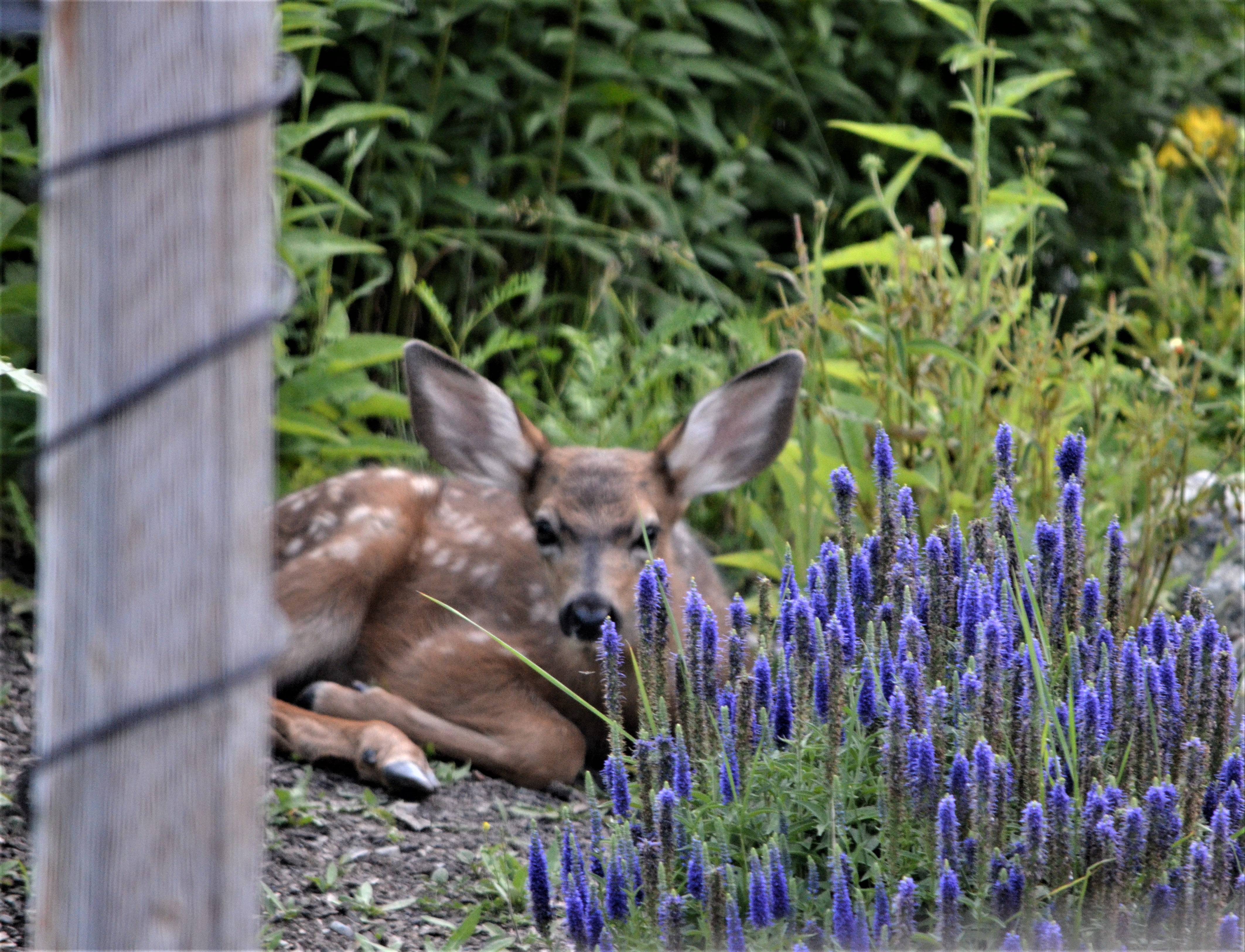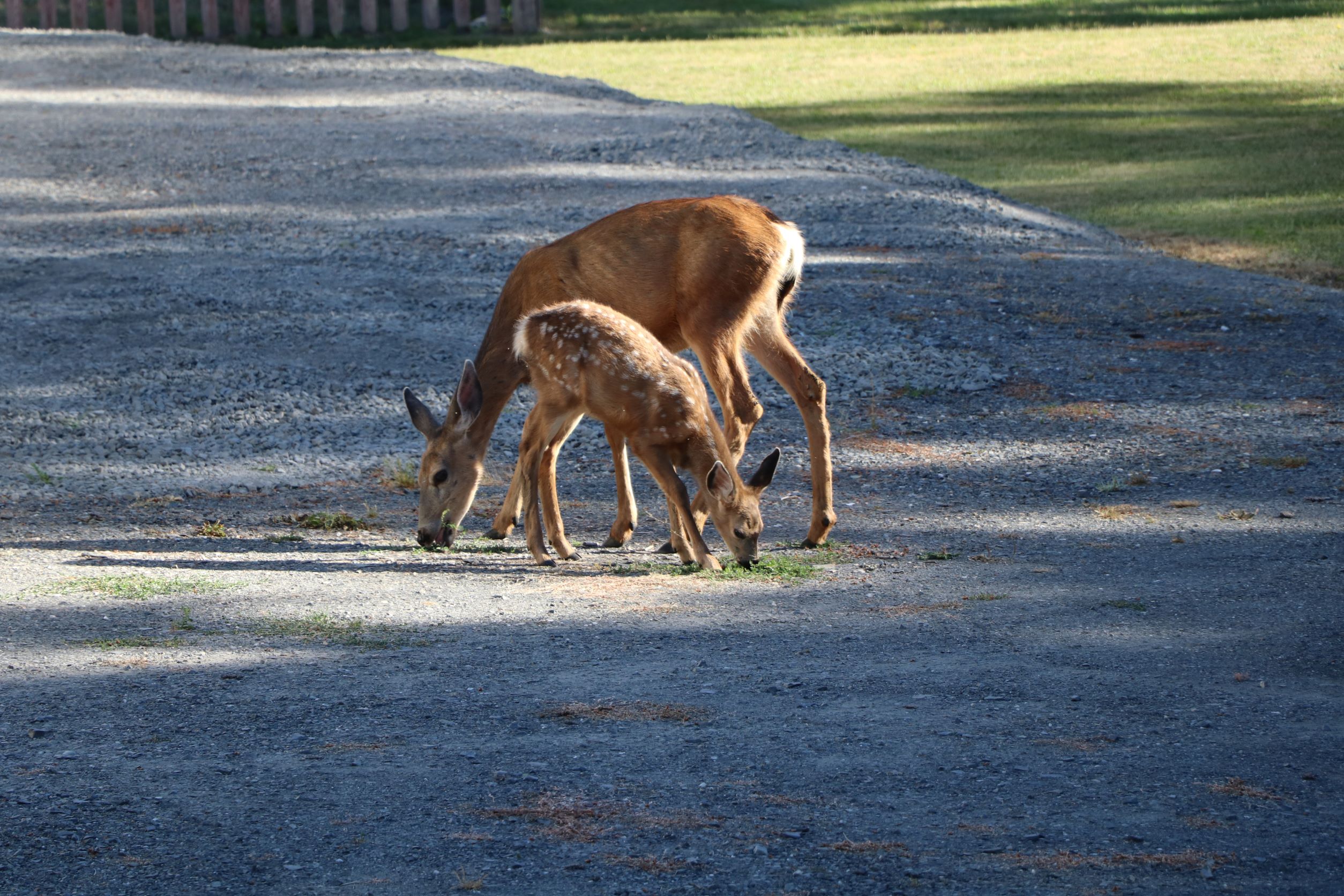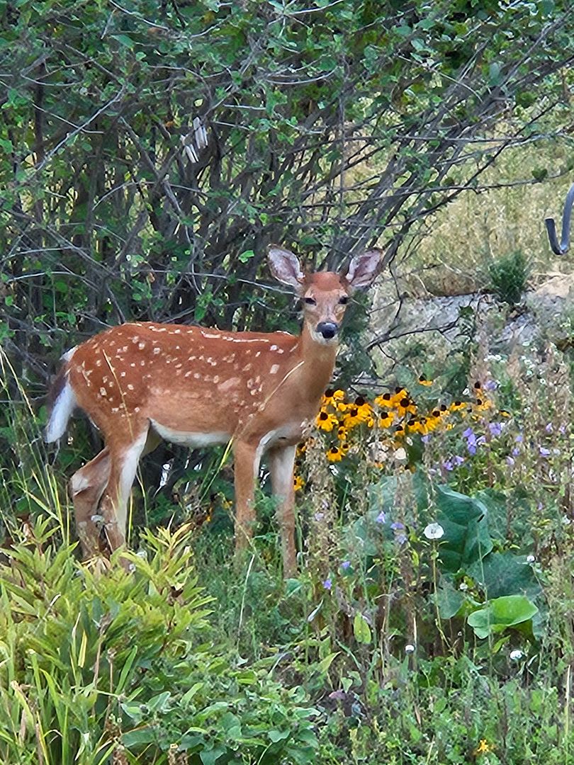 This mama deer comes to forage in our yard but leaves her fawn in a neighboring area to our property.