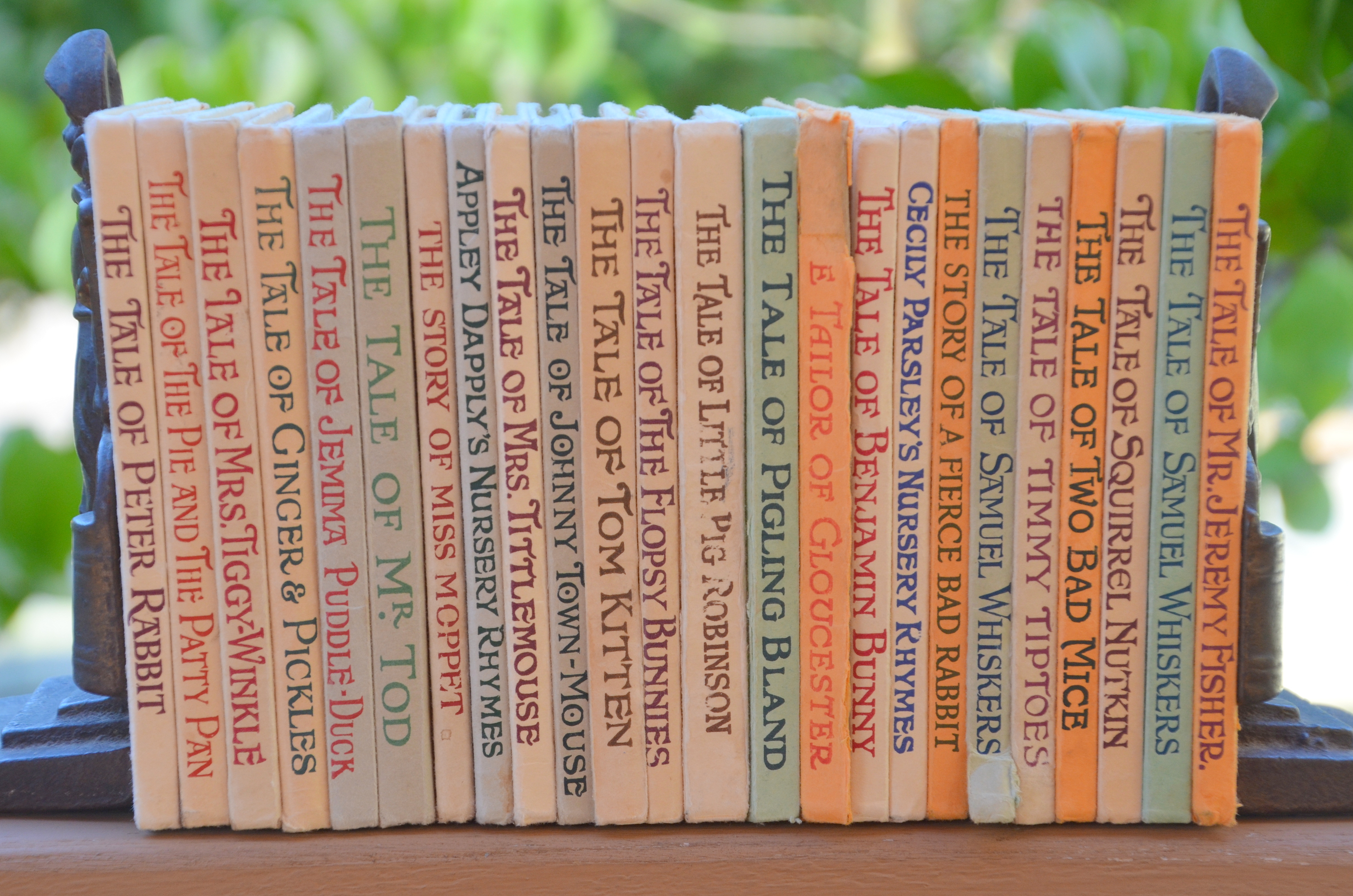 Dear and I bought two full sets of Beatrix Potter Story Collection at Foyle’s in London and had them shipped home to us. One set for us and one set for our first niece born in 1973, Jenna. I suppose technically she wasn’t my niece until Dear and I were married in December of 1974. You can see our set is well used and loved.