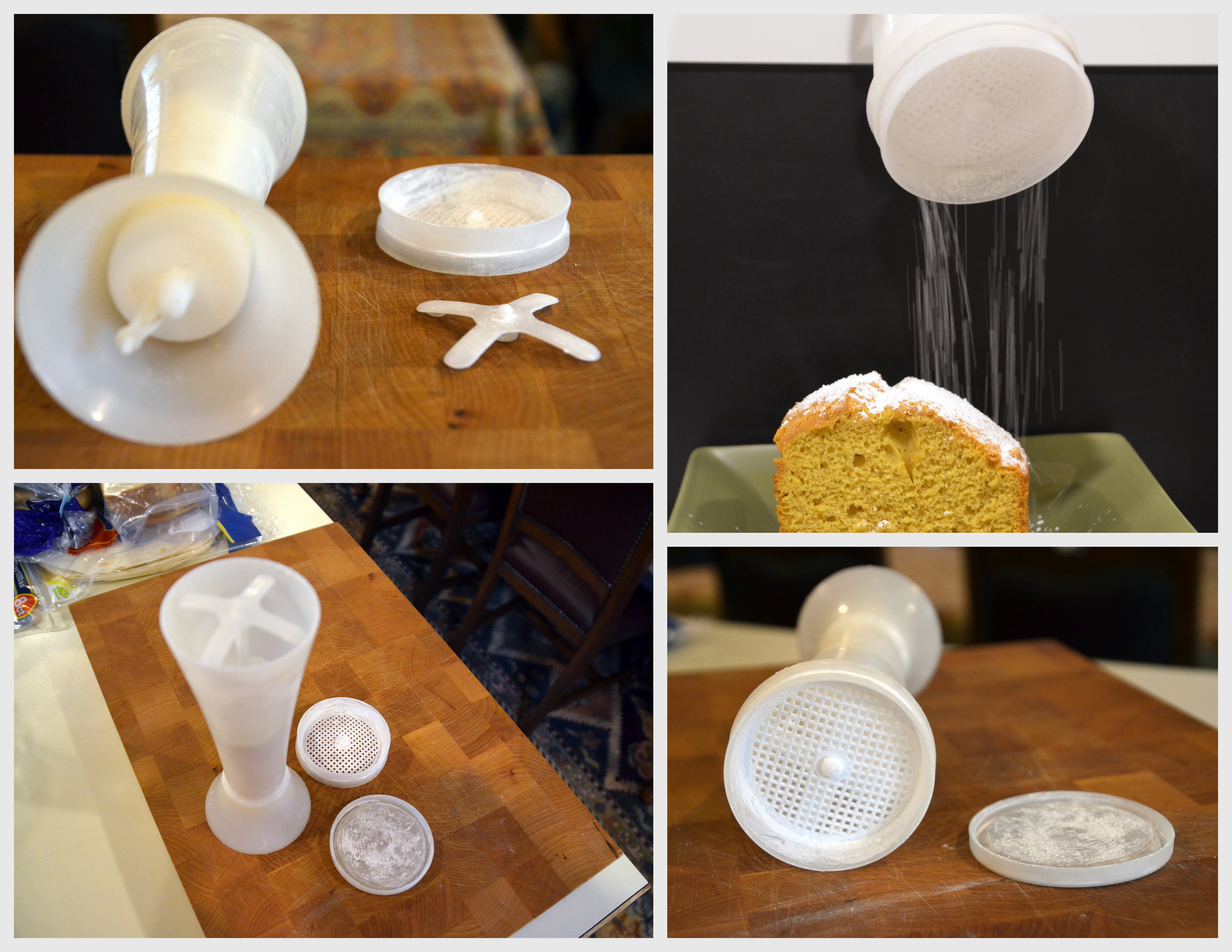 In tandem with my cake above is this collage. Do you have a Jiffi-Sift? We’ve never given ours a name but everyone in the family knows what to grab when you want to lightly dust powdered sugar on anything like French Toast and Spice Cake. I have a post about my Tupperware Jiffi-Sift here. Some of you call powdered sugar icing sugar.