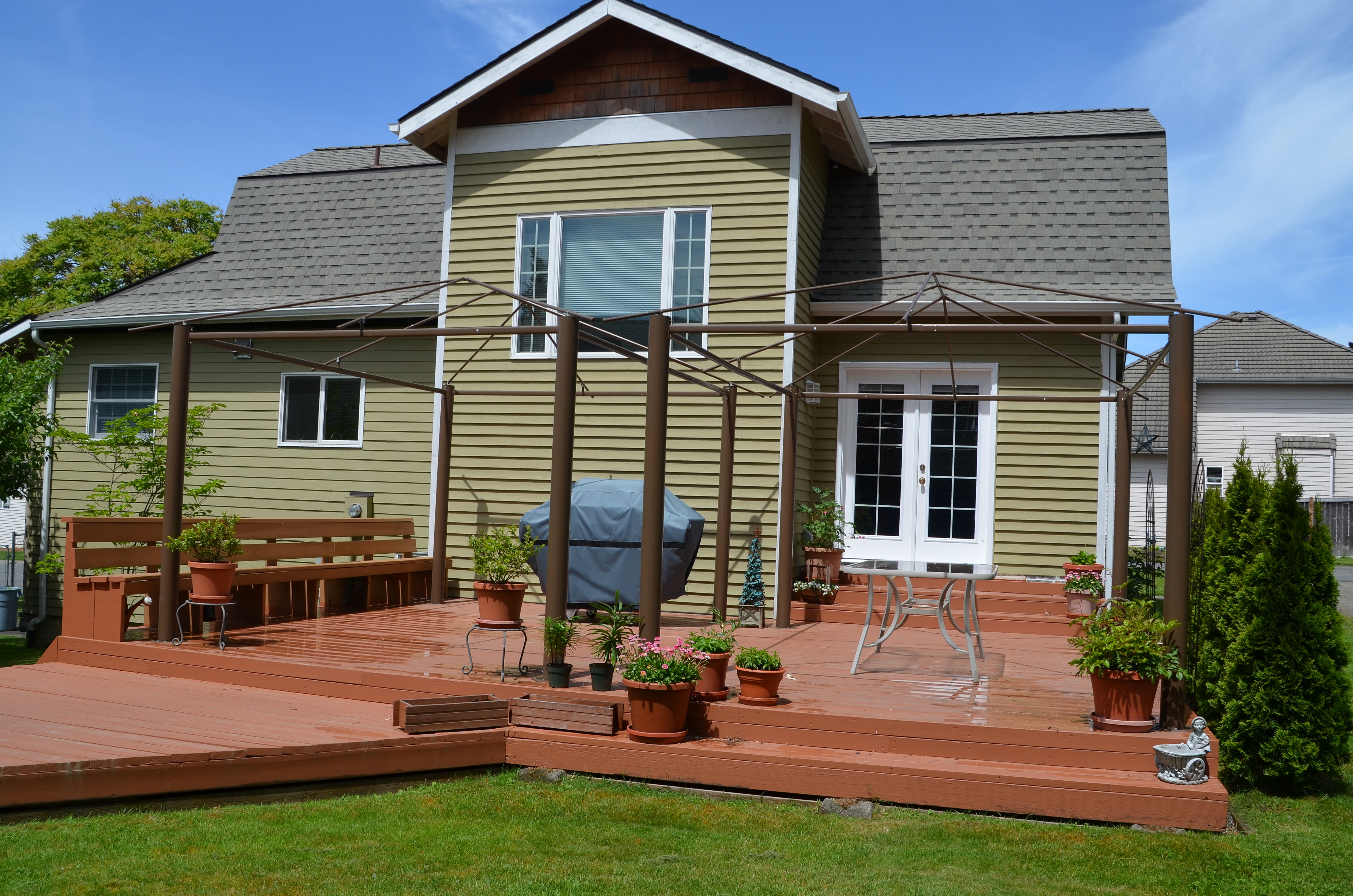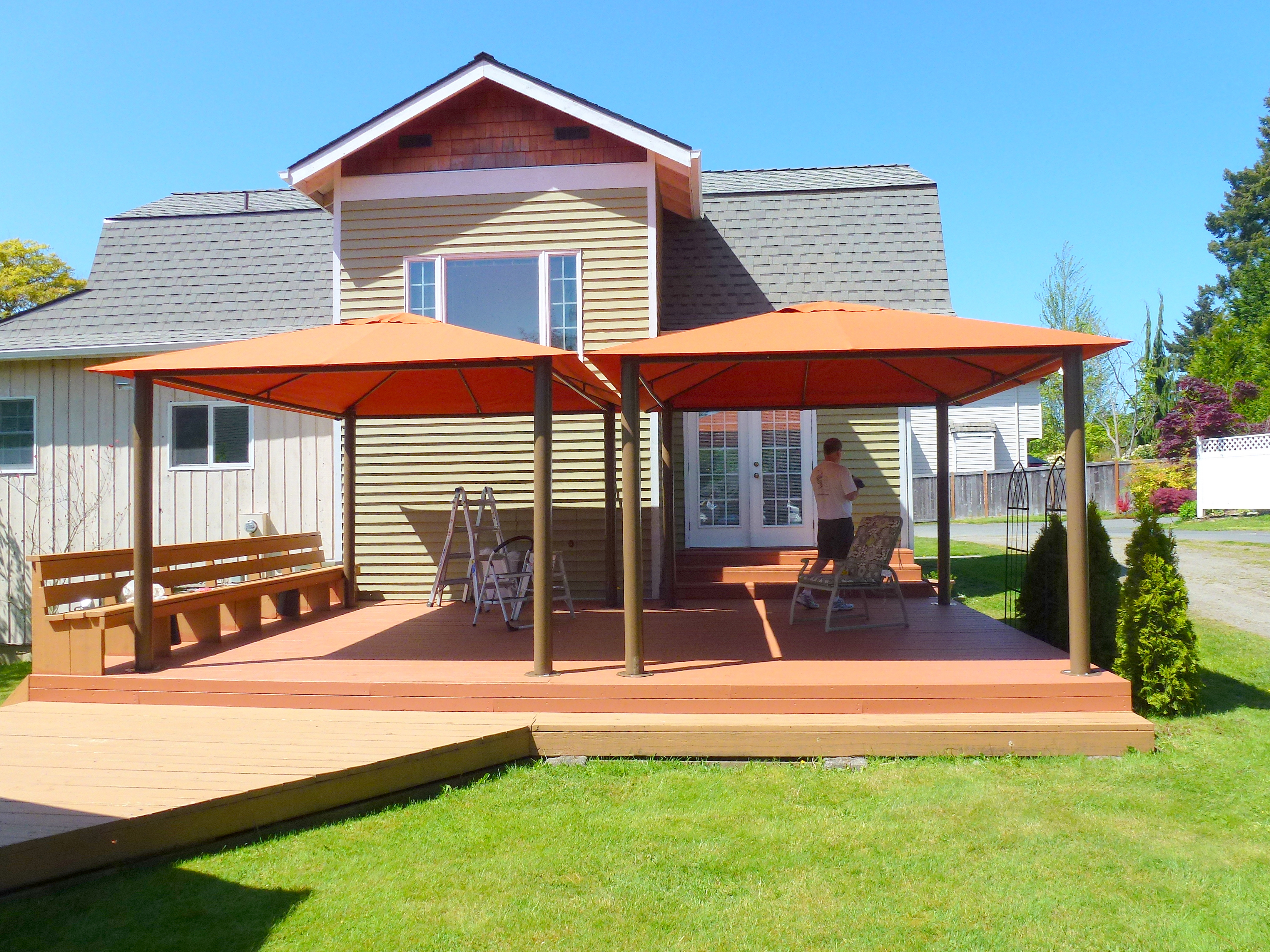 Our deck covers changed over the years, too. These two are serving us very well currently. This photo shows the extended deck and the difference between the horizontal siding and vertical siding to the left of the deck.