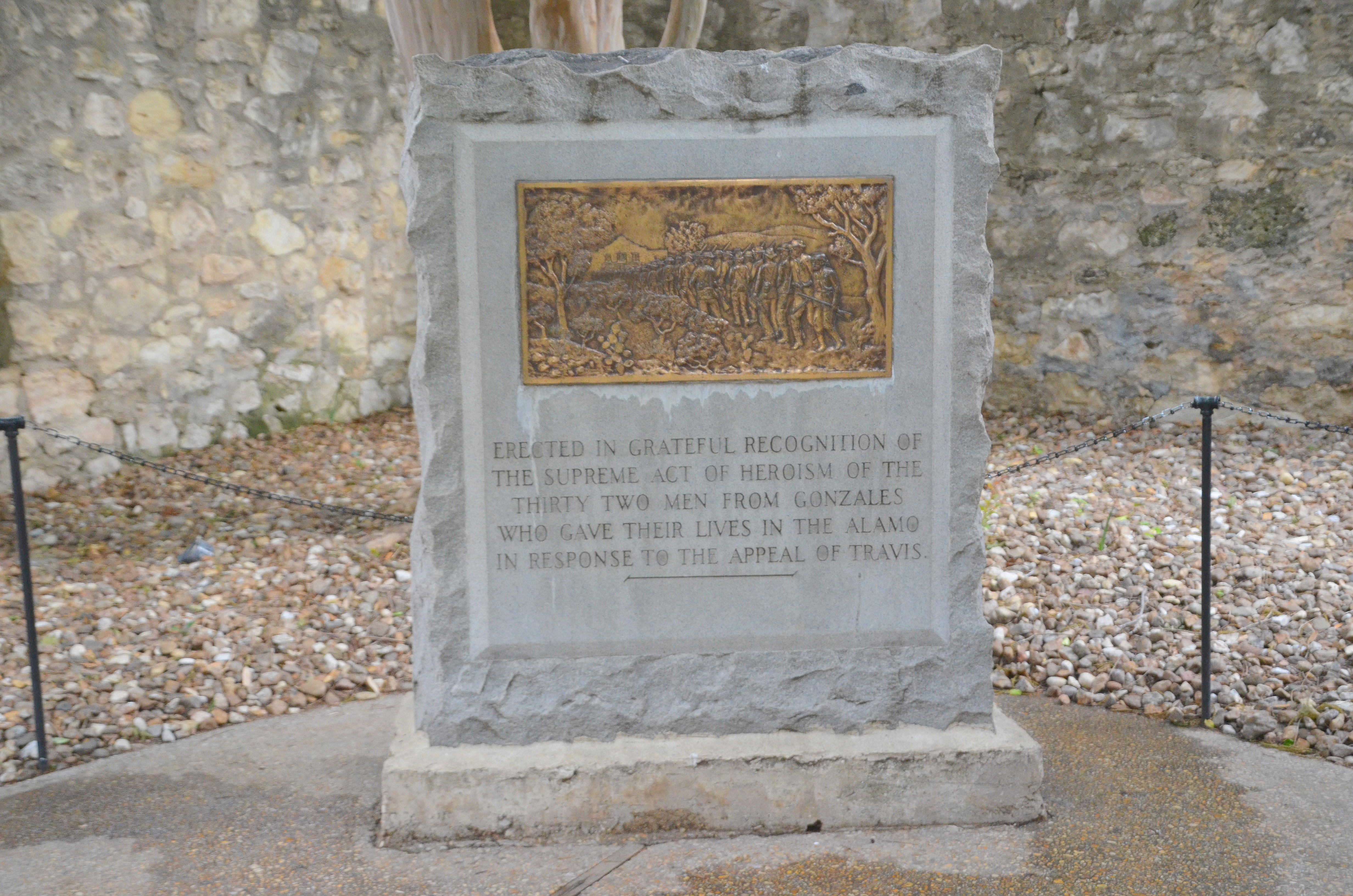 Erected in grateful recognition of the supreme acct of heroism of the thirty two men from Gonzales who gave their lives in the Alamo in response to the appeal of Travis.trolley tour 001