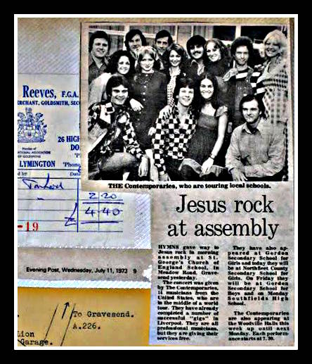 “Hymns give way to Jesus Rock in morning assembly at St. George’s Church of England School, in Meadow Road, Gravesend yesterday. The concert was given by the Contemporaries, 14 musicians from the United States who are in the middle of a world tour. They have already completed a number of successful “gigs” in Liverpool. They are all professional musicians but they are giving their services free”…