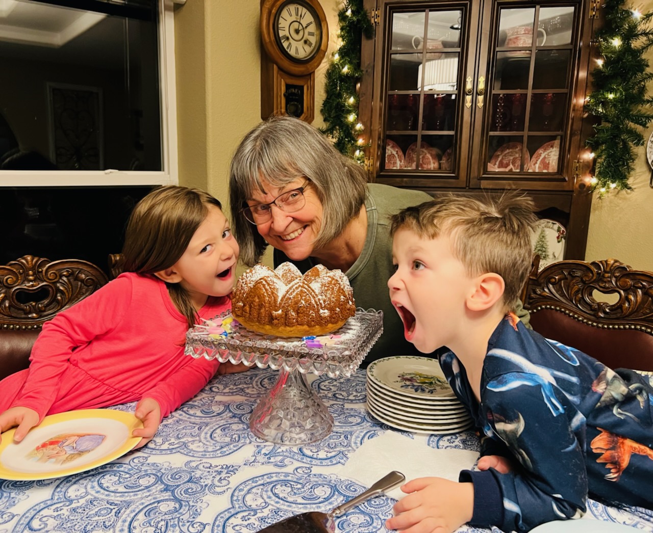 The grands arrived later in the morning and helped me mix up Katie’s birthday cake, Applesauce Spice Cake. Into the oven and time for some piano interludes with Auntie Katie.