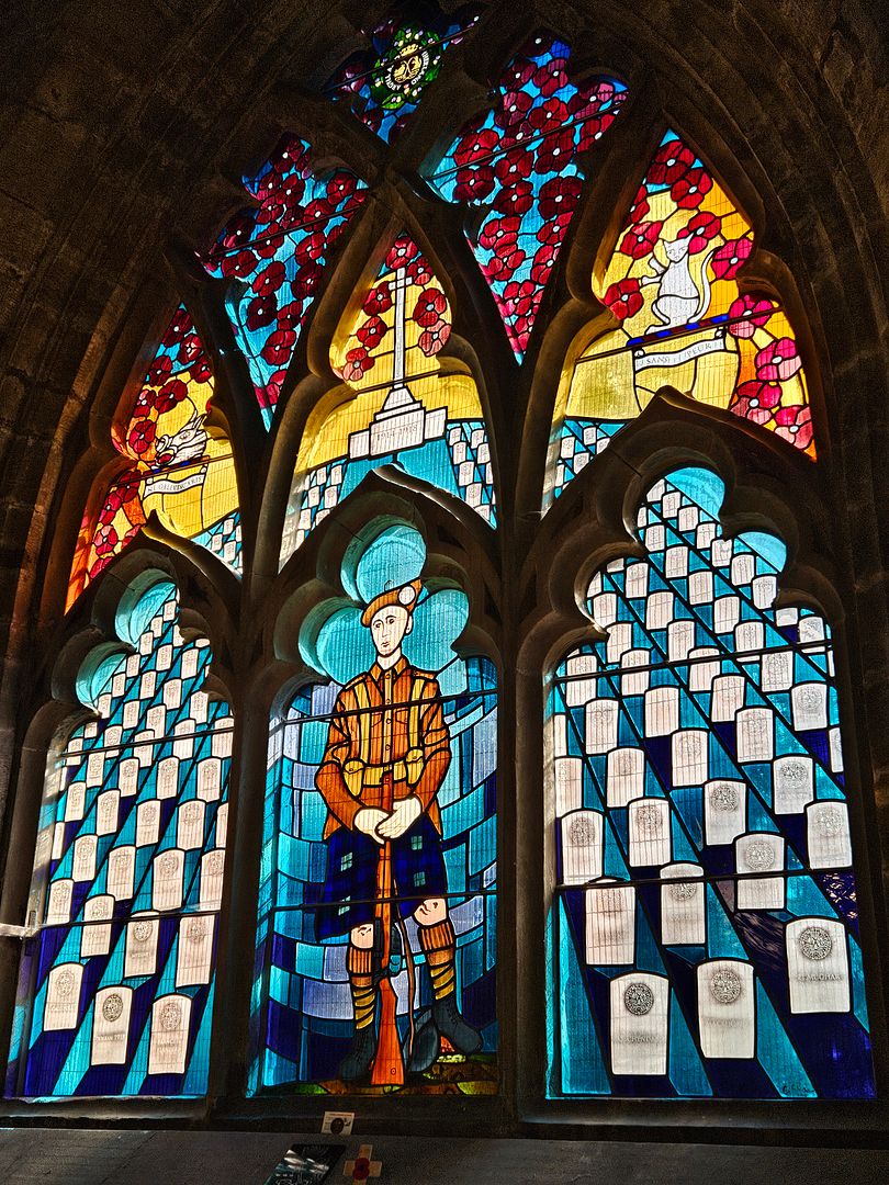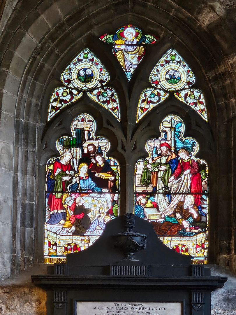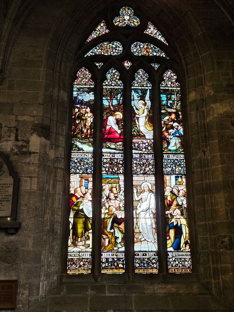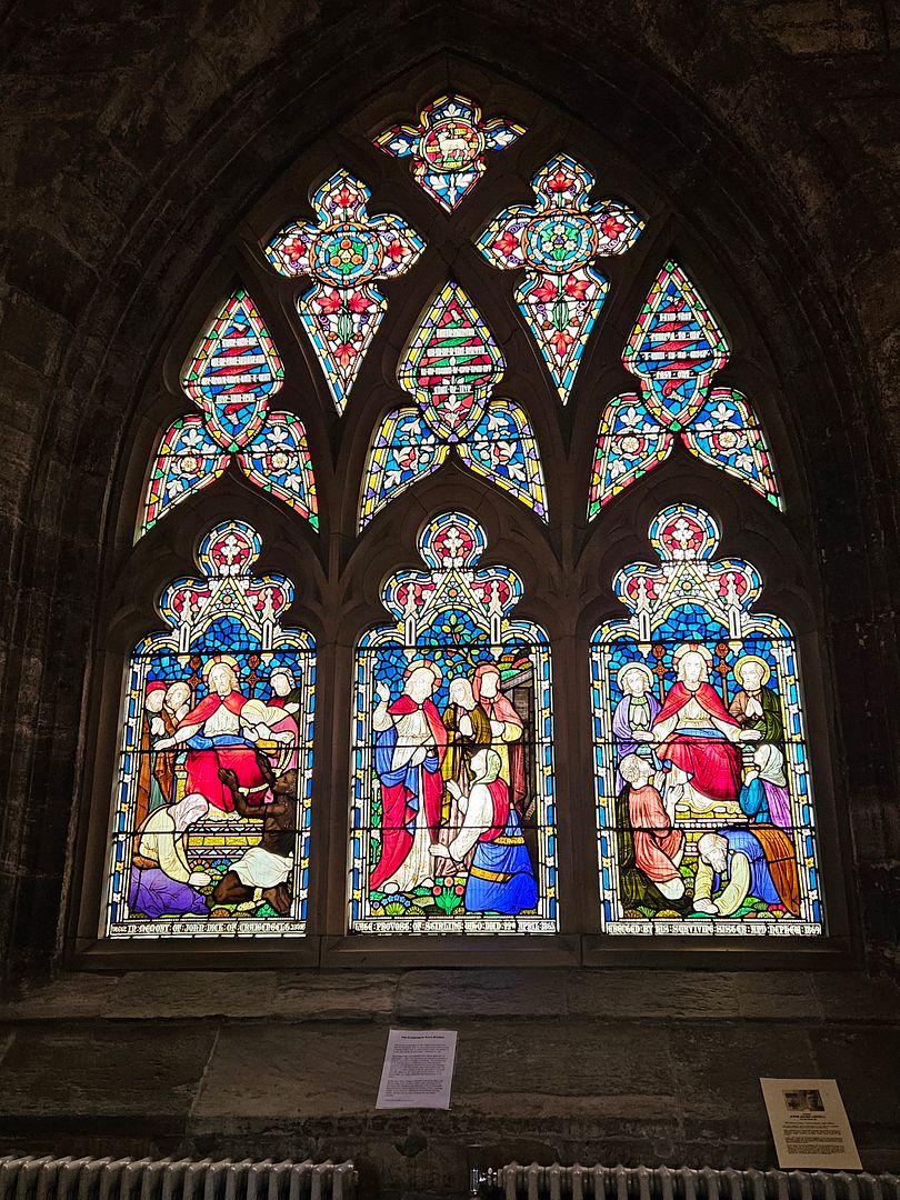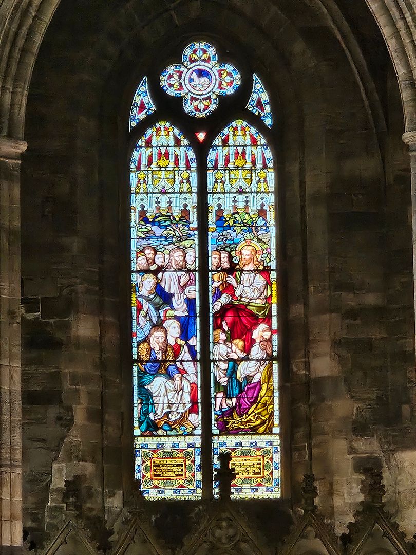 The McLaren Window – Dunfermline Abbey, featuring scenes from the Last Supper and the Resurrection. This stained glass window was erected in 1904 to honour two local brothers William and John McLaren, who stipulated that their own faces should be reproduced among the disciples. Below the Last Supper Window a quote states, ‘This cup is the New Testament in my Blood.’