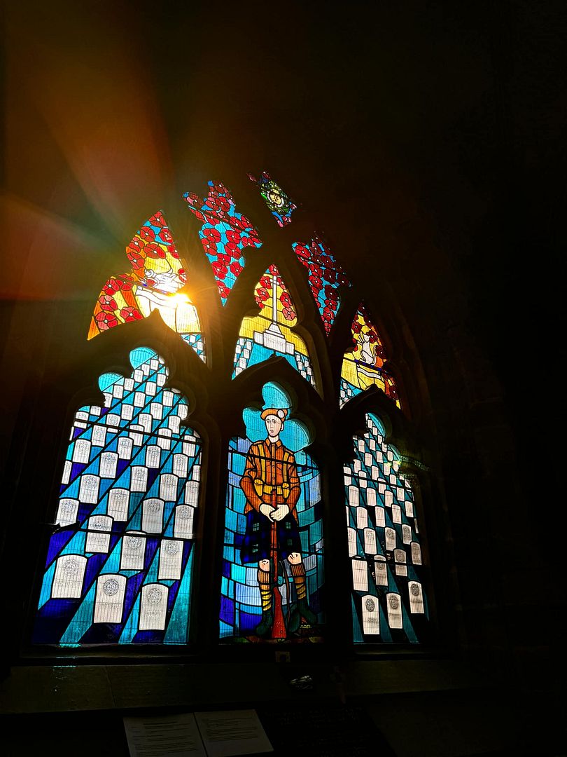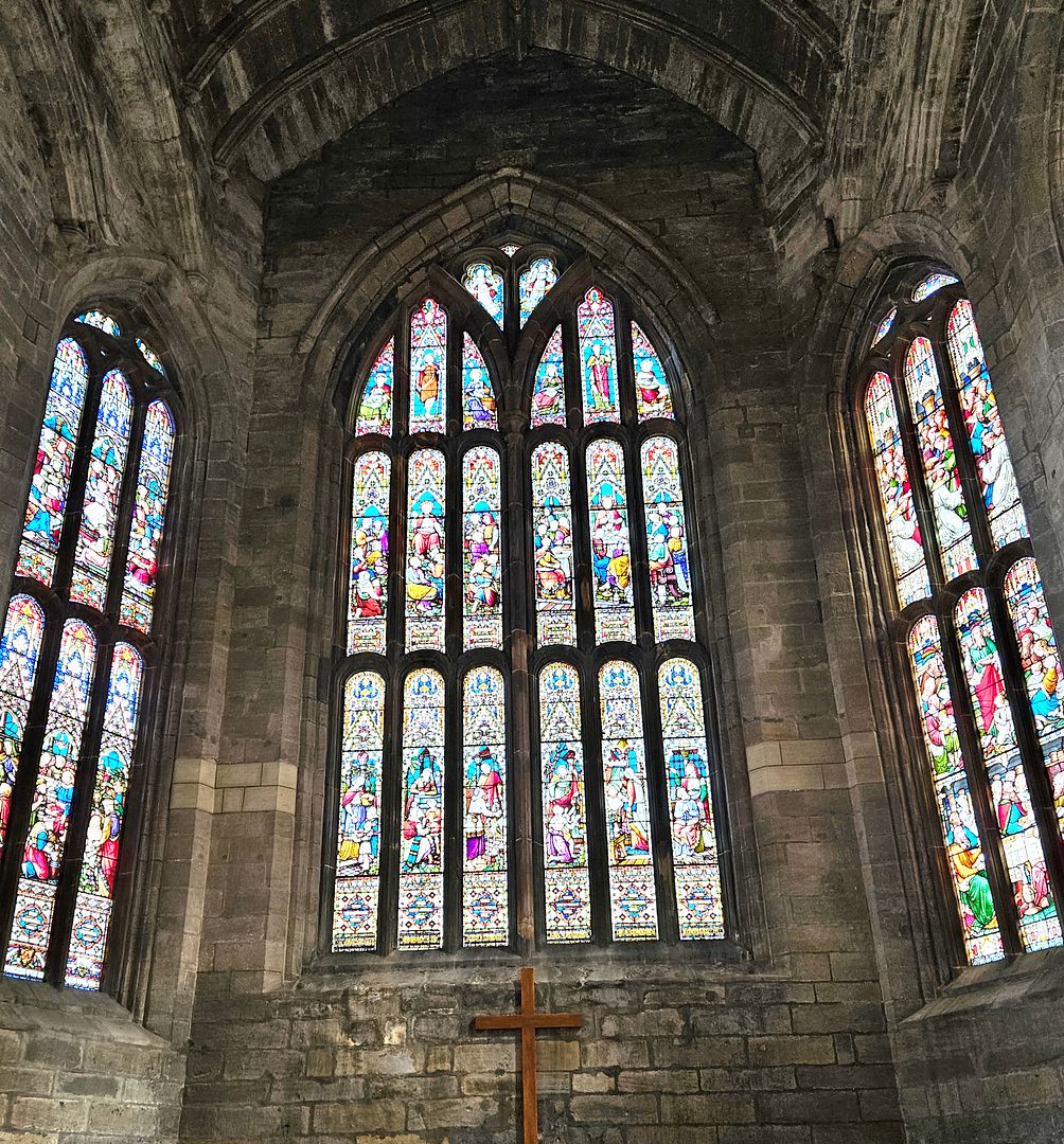 In the Resurrection Window, Mary Magdalene can be seen kneeling alongside the two Mary’s above a quote that states: ‘He is not here, for he is risen.’ To the right of Mary Magdalene are weapons and armour belonging to a Roman Soldier, including what appears to be the ‘Holy Lance’ otherwise known as the ‘Spear of Destiny…’