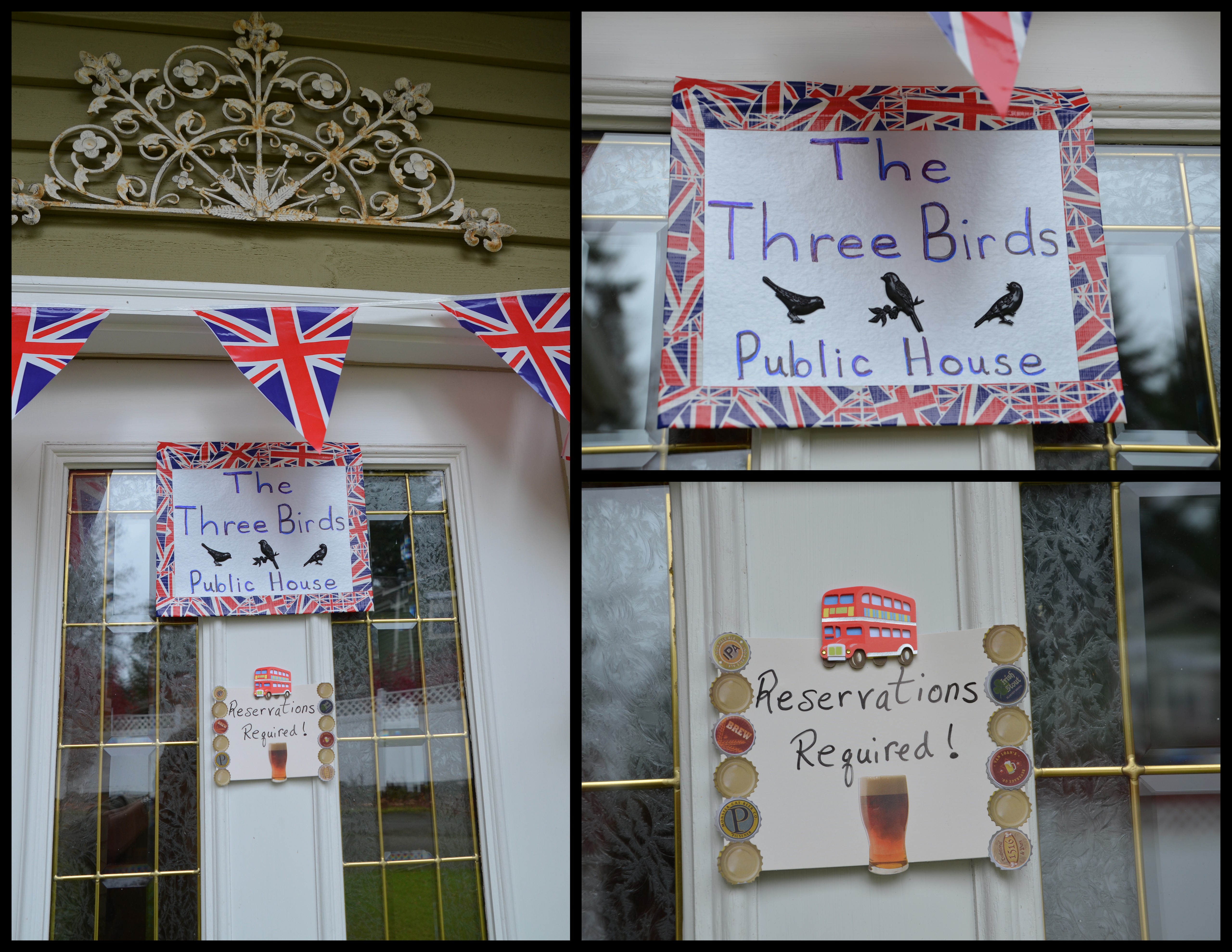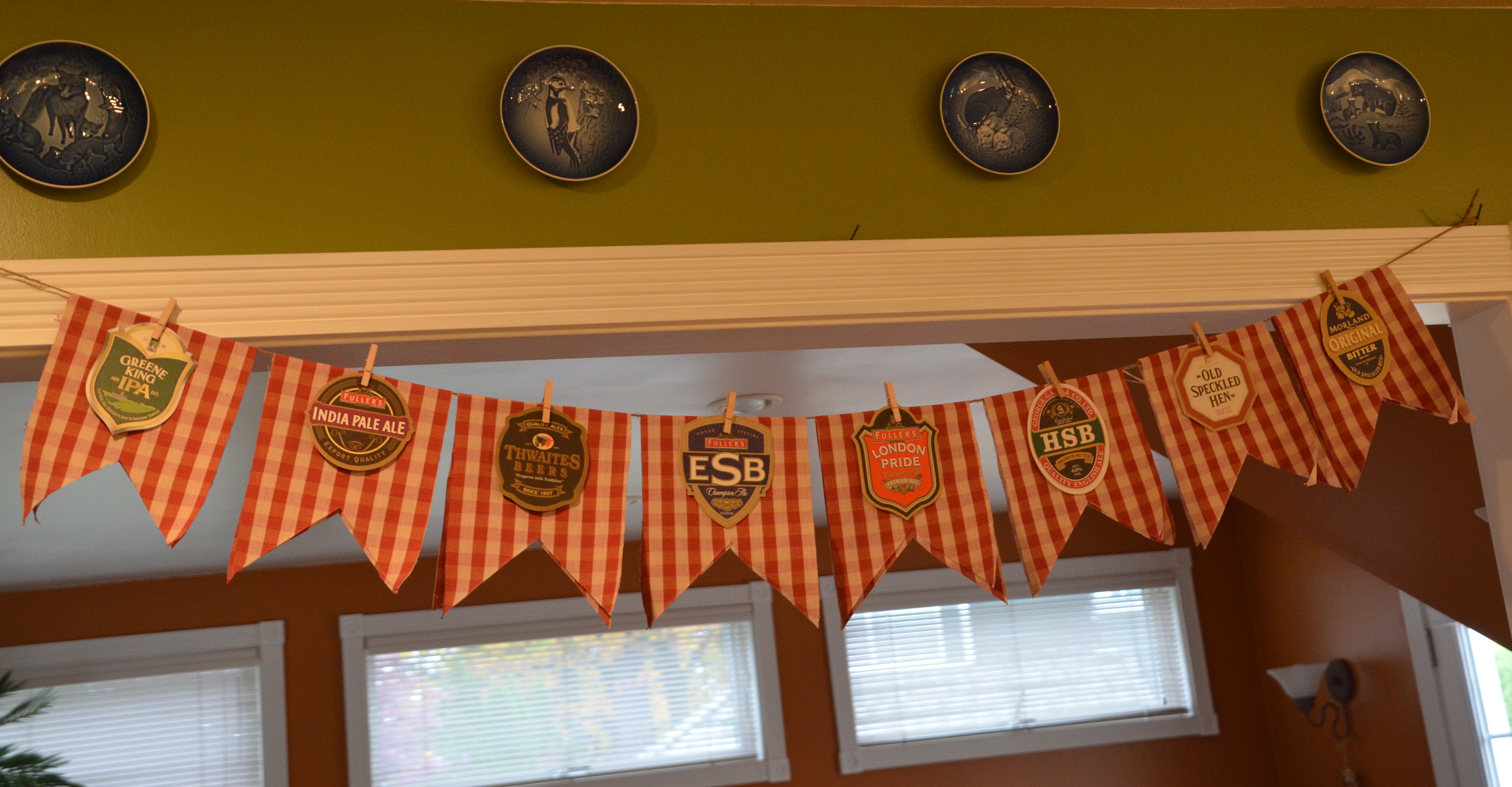 These banners were some of my sewing experiments. The front banner is just a short twine tied between our island pen lights with 3 of the 12 napkins I made for the table. There were only 9 of us at the table so I used these 3 to fill in the air space in our kitchen/eating area trying to cozy things up to look more like a pub. I’ll be brave and show more close up detail on my sewing efforts at the end of the post.