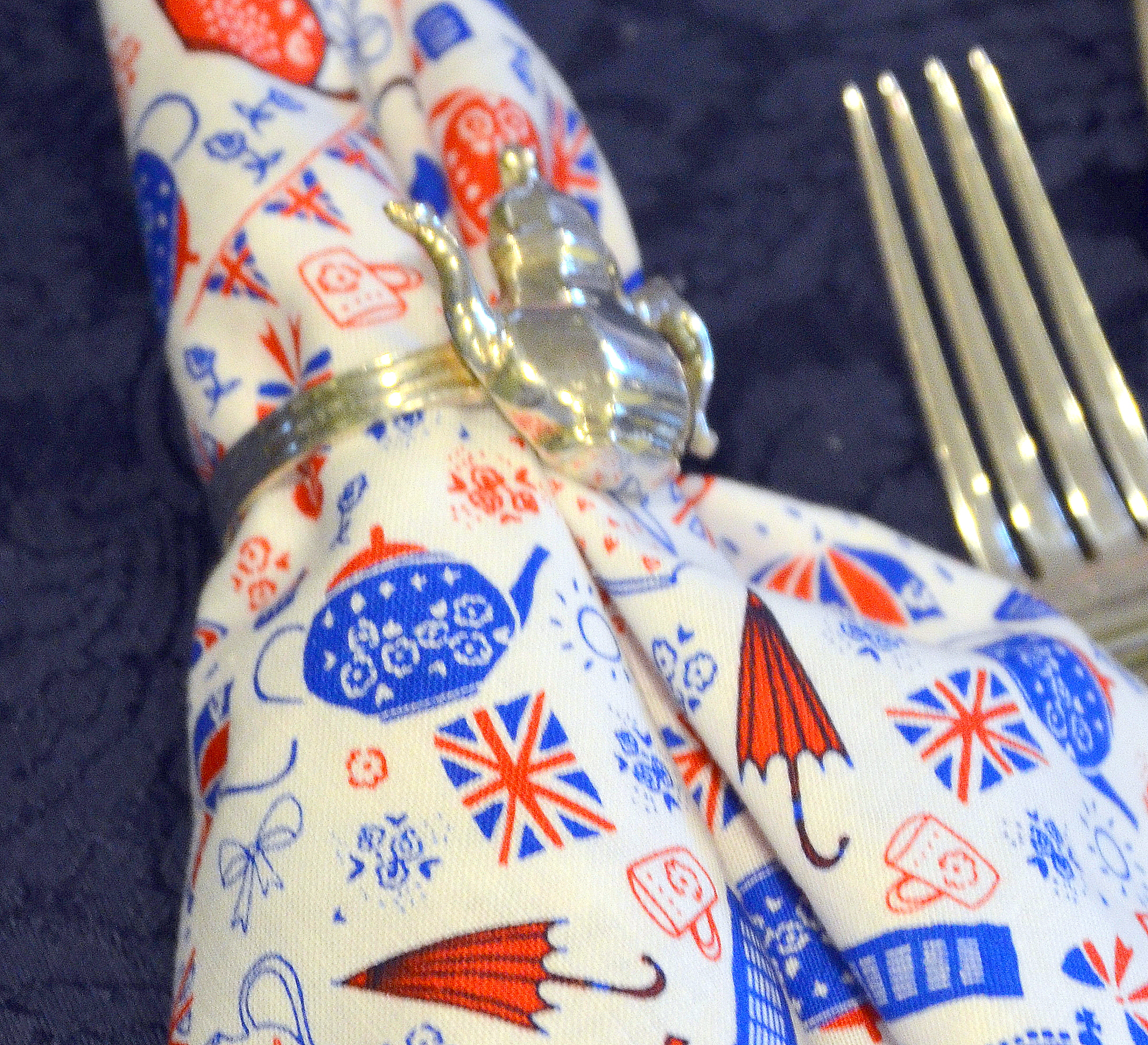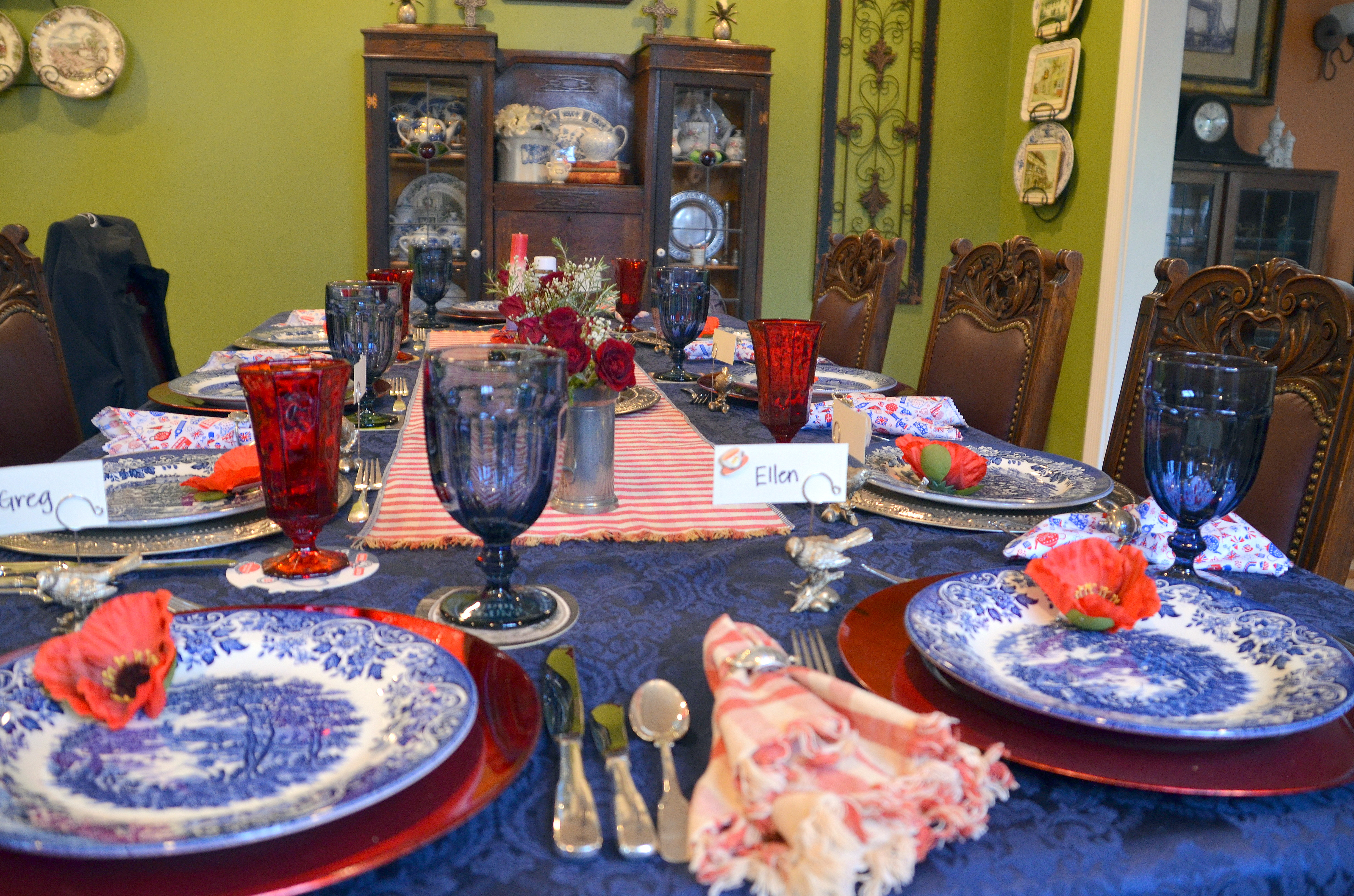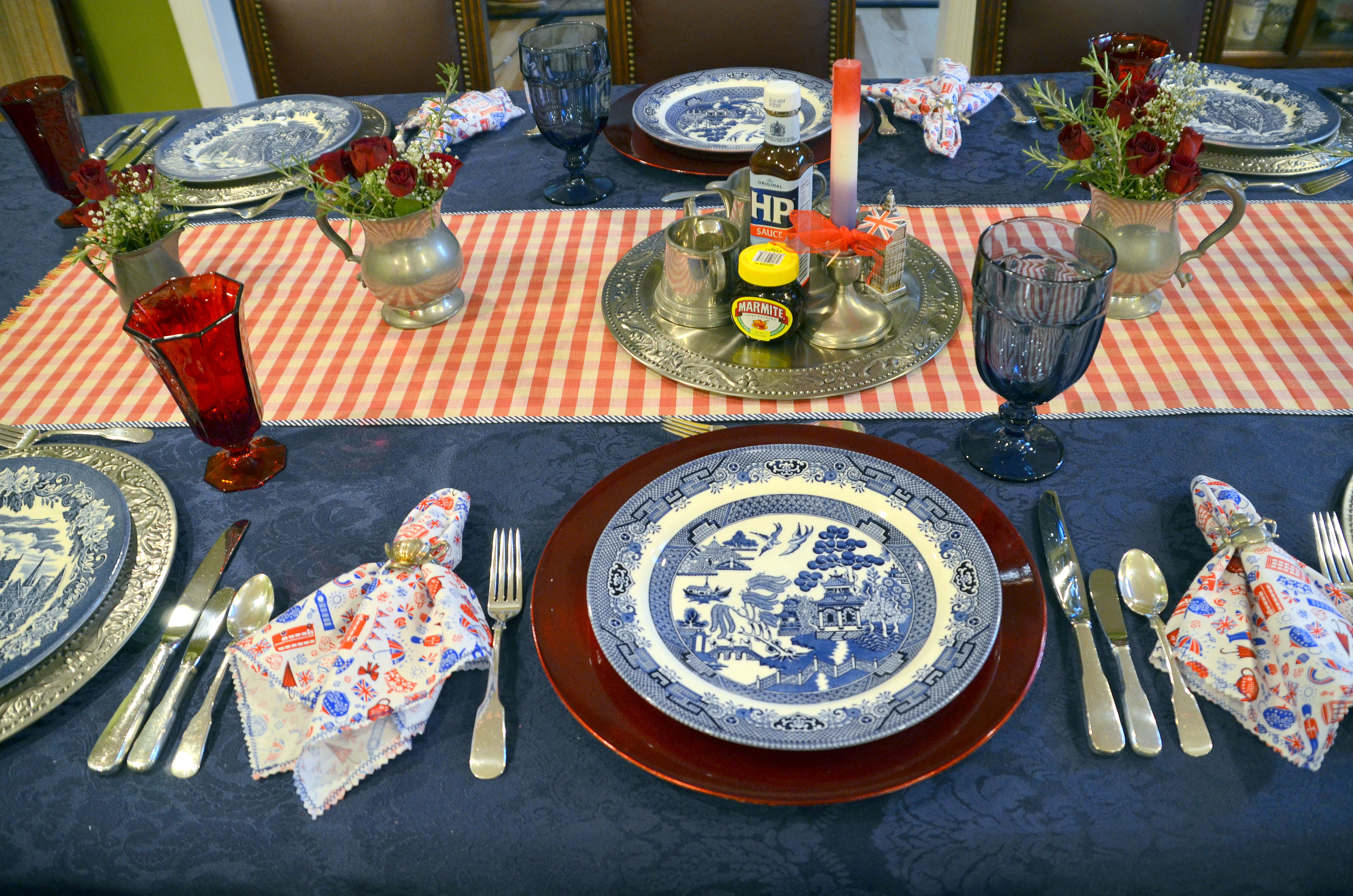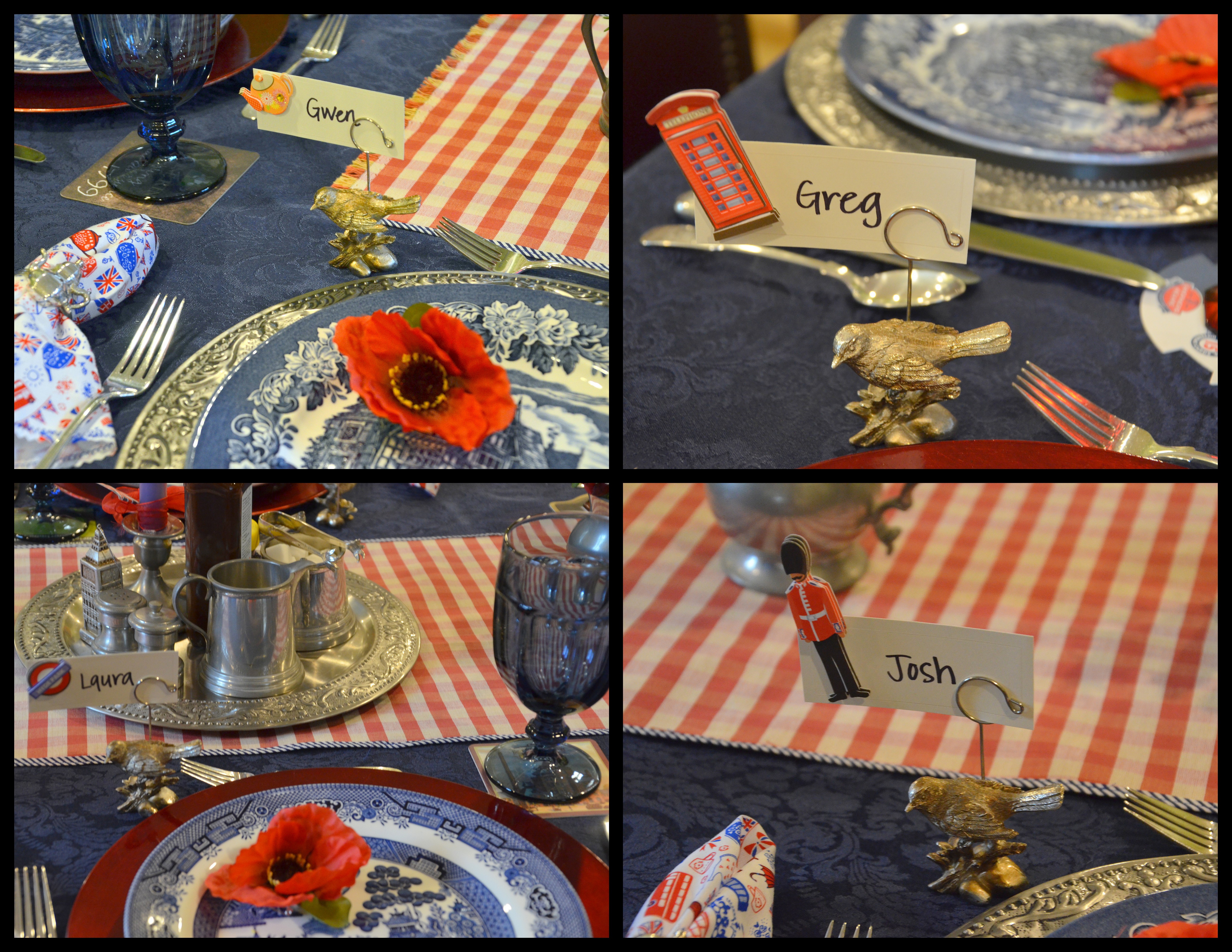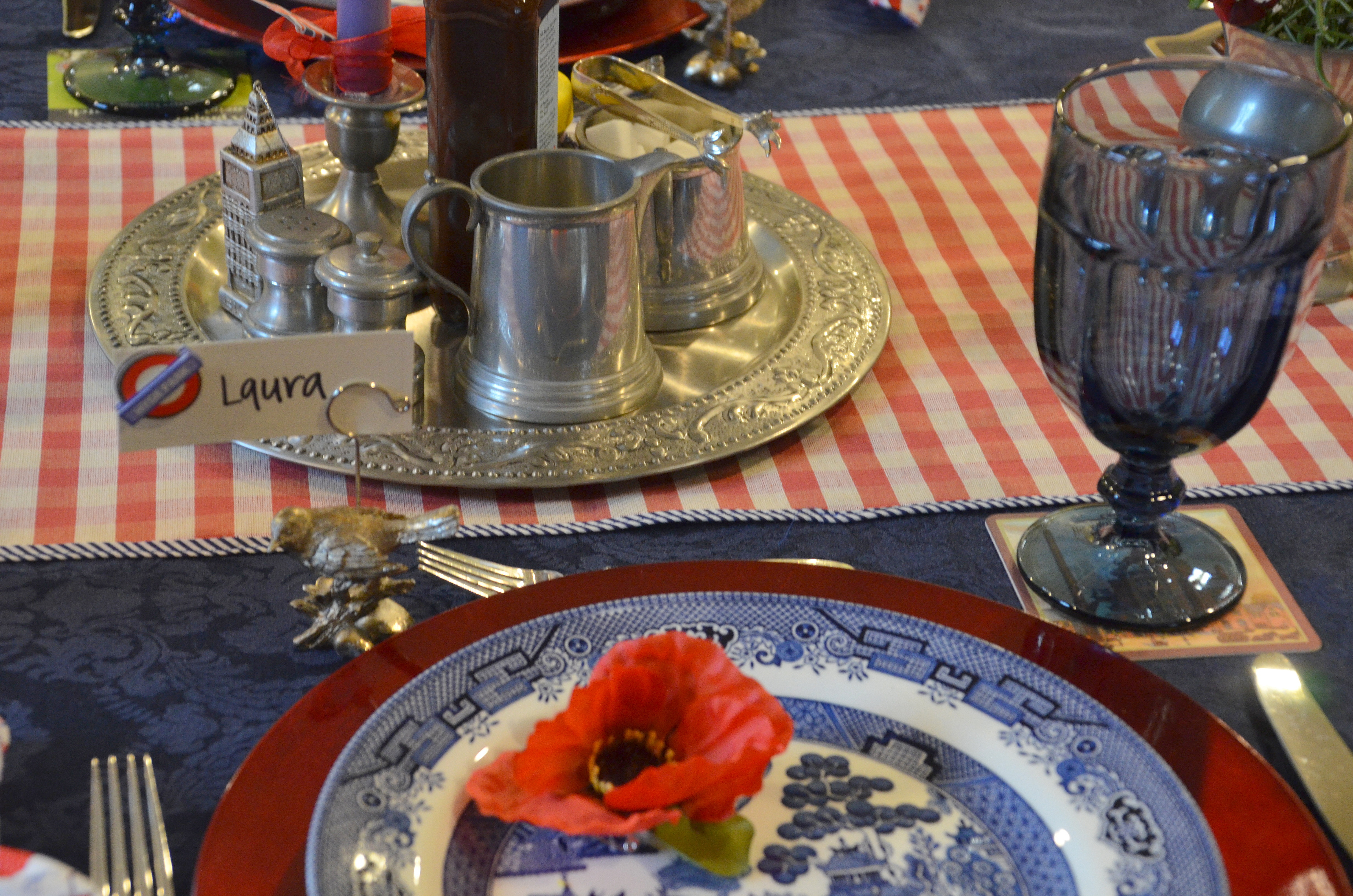 The napkin rings were silver tea pots. All the plates were made in England. I used a combination of three different blue and white transferware.