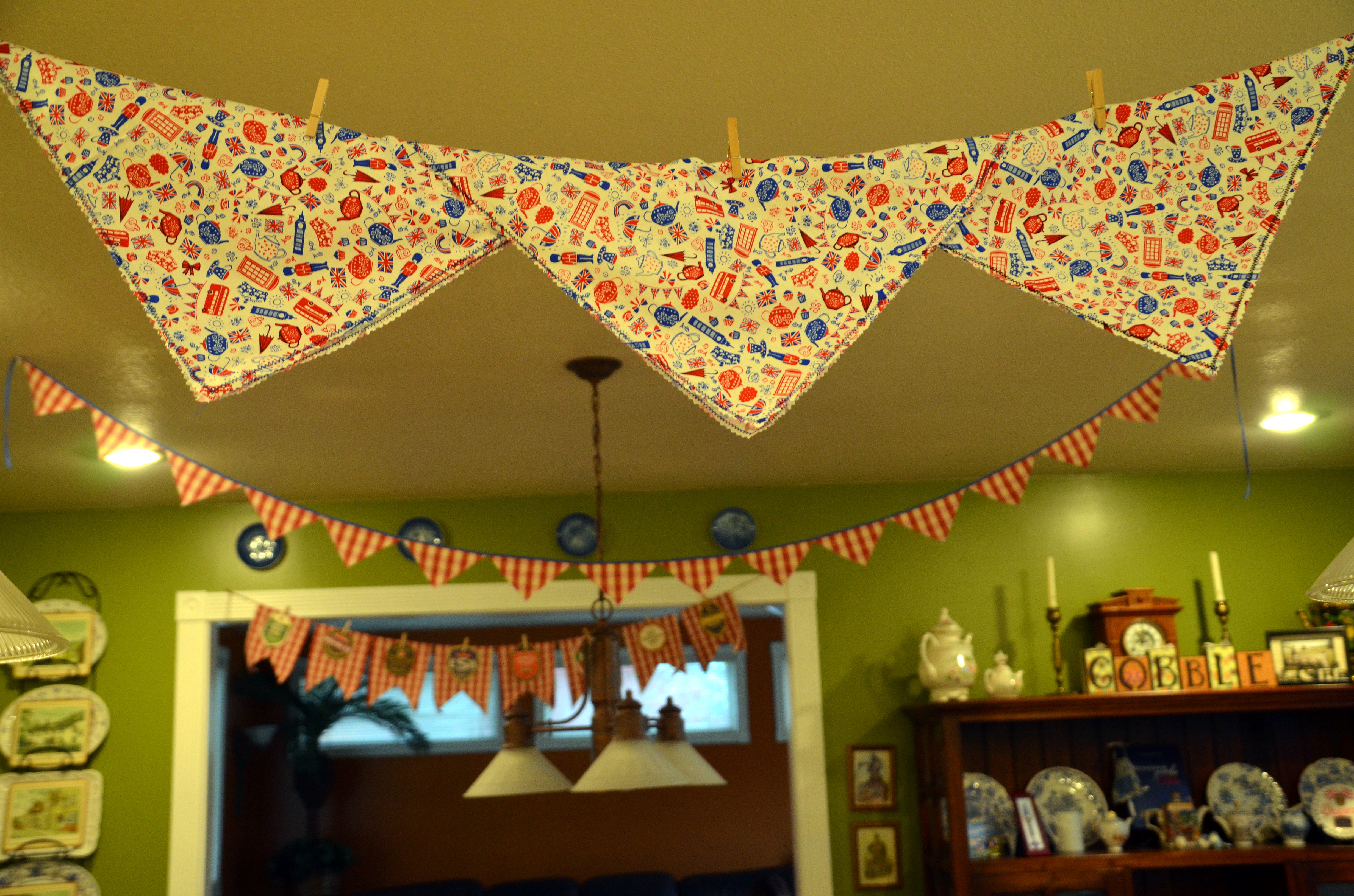 These are the rough cut napkins that I made from a yard and a half of British themed fabric. I was able to get 12 napkins from the yardage I bought. I trimmed the runner with some bias tape I found in my MIL’s old sewing box. I also used bias tape for the little triangle cut outs that were left over from my original Pub banner.