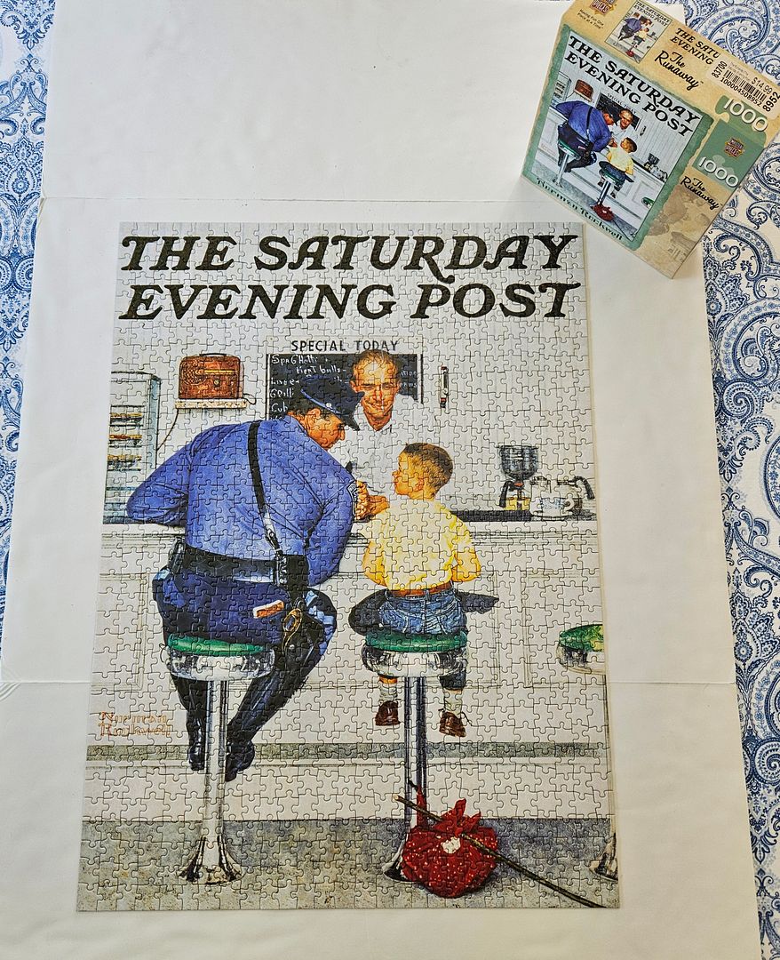 This Norman Rockwell one was tough with all the white. It helped to sort the pieces into shapes to make it easier. Someone dropped off a load of puzzles where our DIL works and she had a few for me to enjoy. This was one of those.