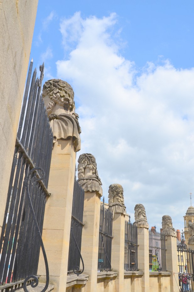We walked past the Sheldonian where on plinths between the railings are a series of Emperor heads, representing Roman emperors, or philosophers. Each one has a different beard. Christopher Wren is the architect of the Sheldonian and other buildings in Oxford. These heads were installed when the theater was built and then remodeled in 1868 and again in 1970’s. One of the heads has a wren chiseled in its hair in honor of Christopher Wren.