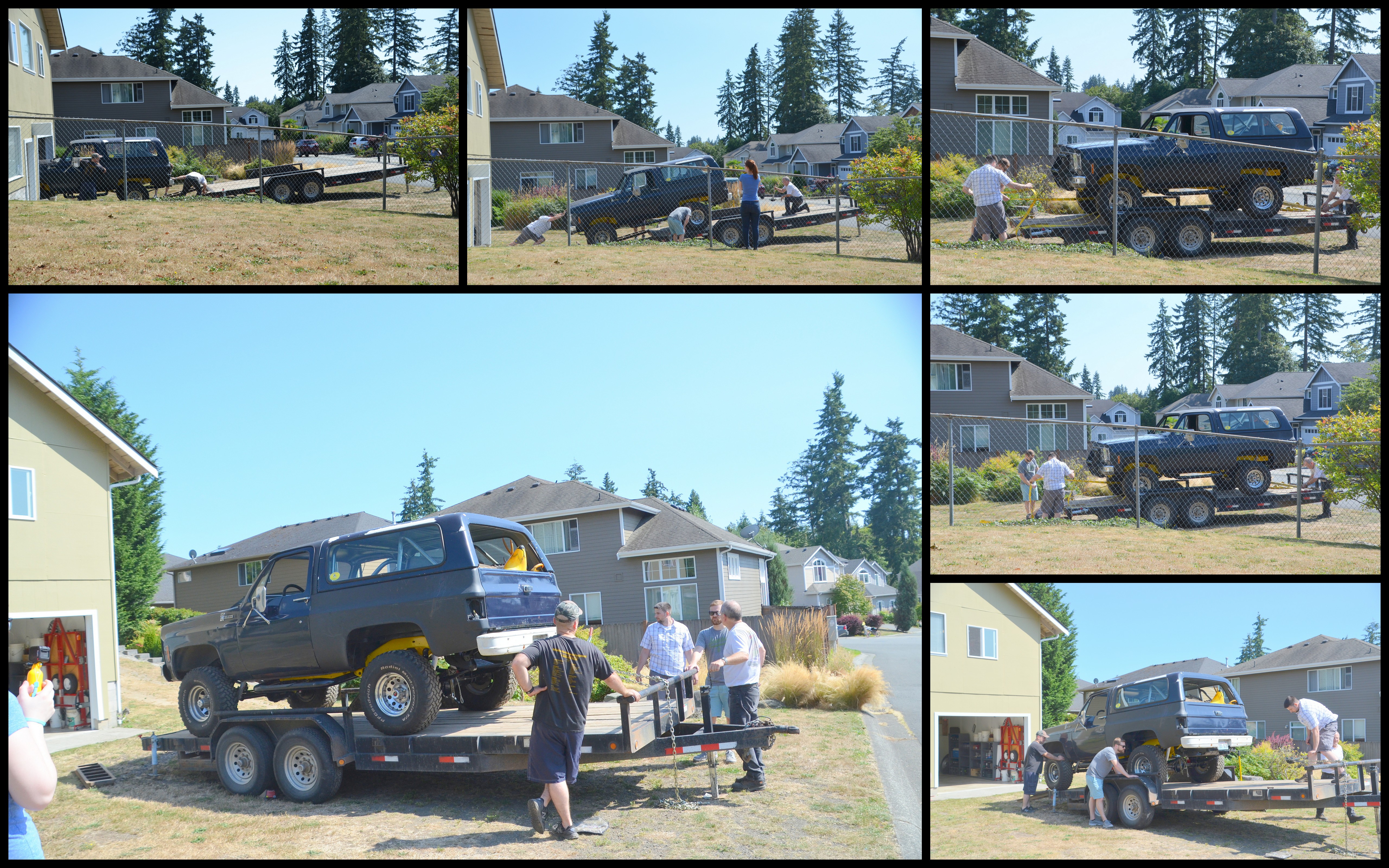 Our kids from the east arrived shortly after 2 pm and we had a snack of Pishkey-Russian Fry bread or (Rollkuchen-Mennonite Version) and watermelon. Next up was getting our son Dan’s Blazer on a car carrier so he could take it back to his own shop in Eastern Washington. Lots of discussion went on amongst the 4 men on the best way to do things. The ladies sat on patio chairs far away from the danger and kept Reyna (Dan and Jamie’s dog) entertained. Katie ventured over to the danger to take a GoPro video of the action.