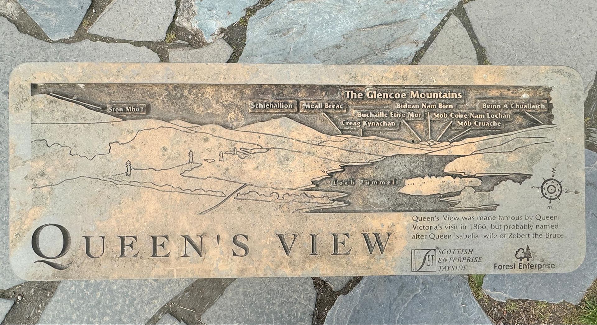 A short drive from Pitlochry, along a winding tree-lined road, hugging the River Tummel, lies the Queen’ s View. This famous vantage point looks out over one of the most iconic panoramas in Scotland, directly to the west along Loch Tummel from where, on a clear day, you can sometimes see the mountains surrounding Glencoe by the West Coast. A popular destination since Victorian times, it is often thought that the location was named after Queen Victoria who did, in fact, visit in 1866 . However, it is more widely believed to have been named after Queen Isabella the 14th century wife of Robert the Bruce who used the spot as a resting place on her travels