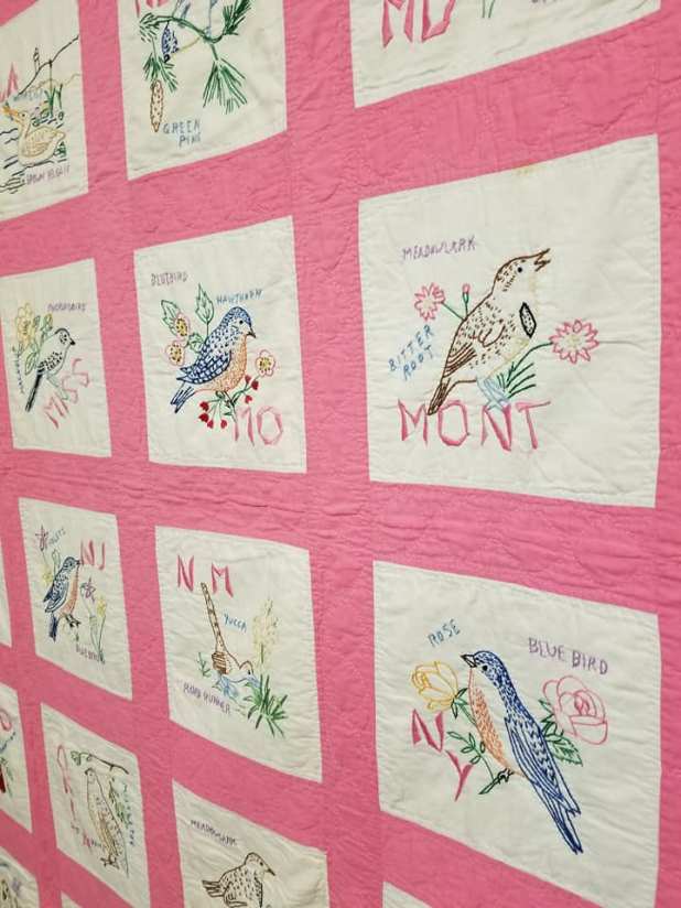 A California Quail on a Quilt square from a Quilt that Greg’s mother, Verna, embroidered and quilted when we just had 48 states in the U.S.A. There are 48 squares with each of the states represented in the year she quilted it.