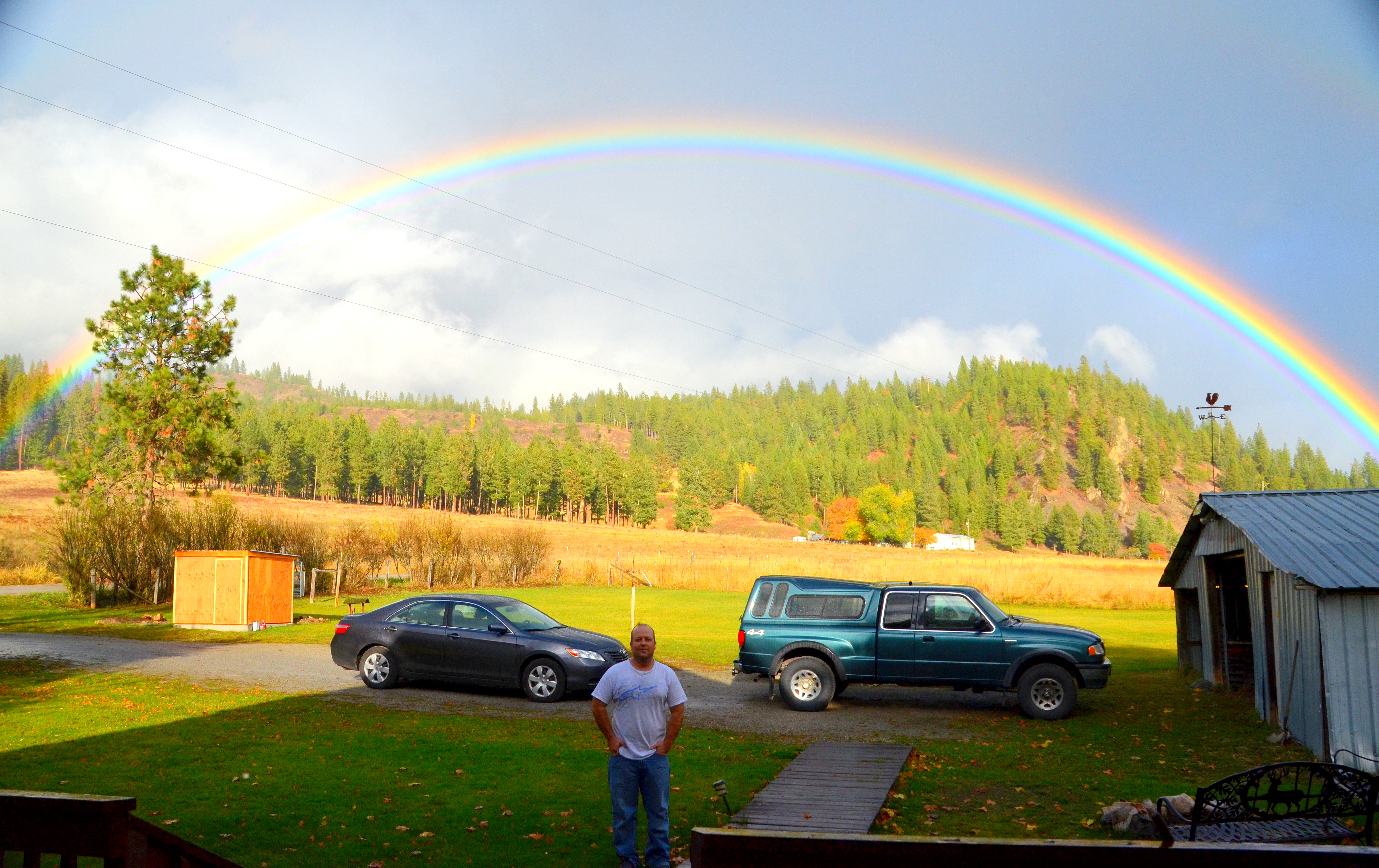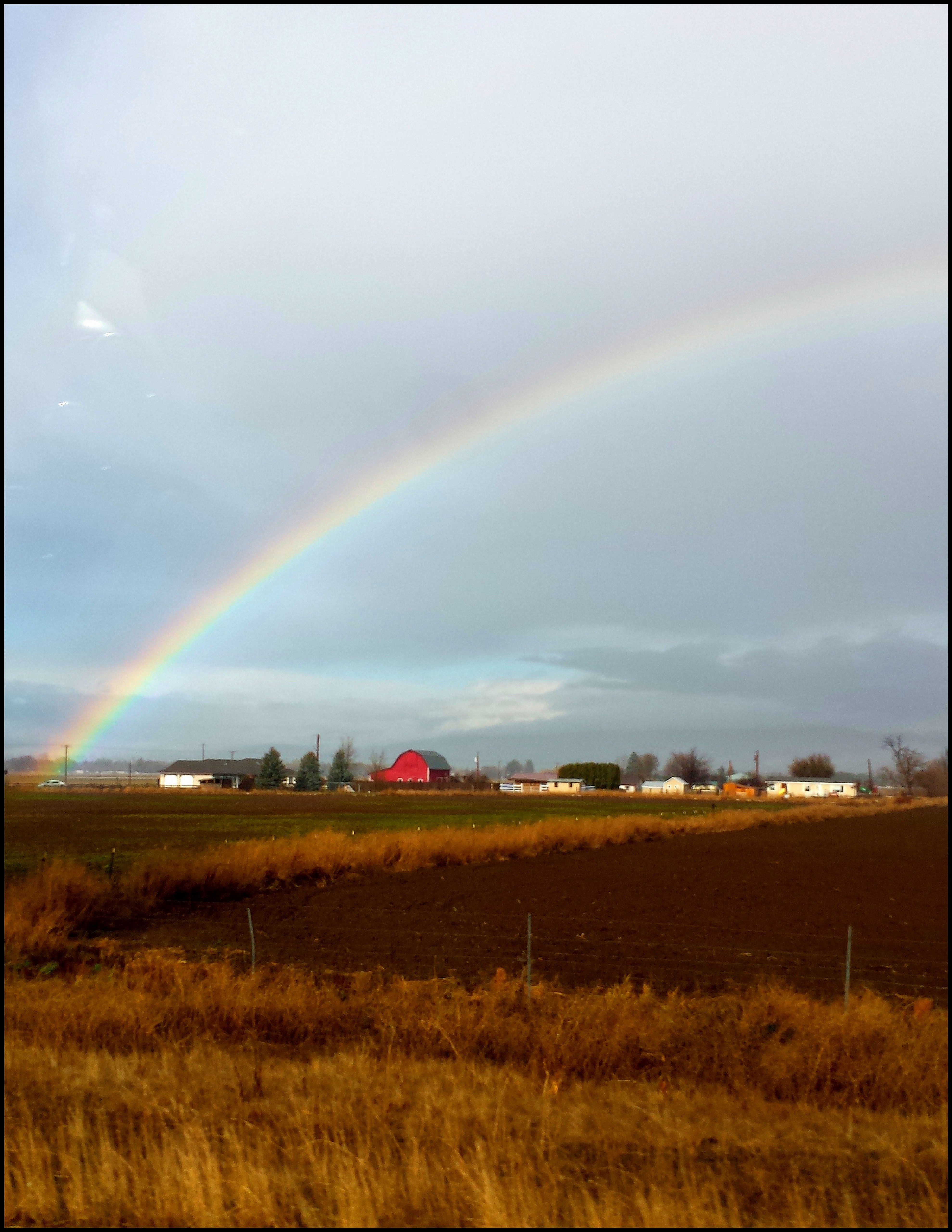 On our way home from Colville on November 20th we saw a few rainbows and this one happens to be over the nice red barn in the distance. I took this one with my cell phone.