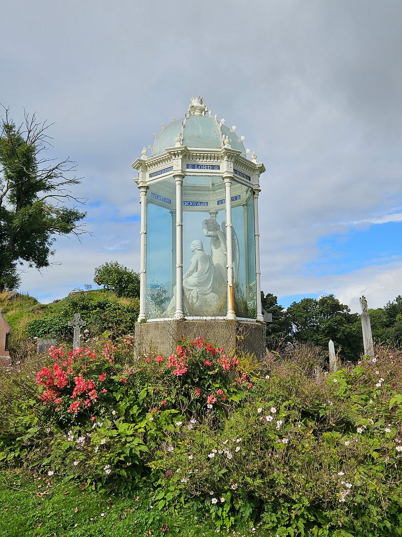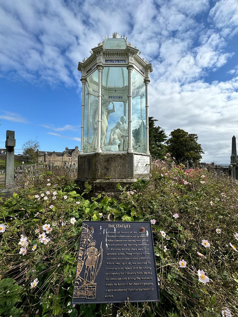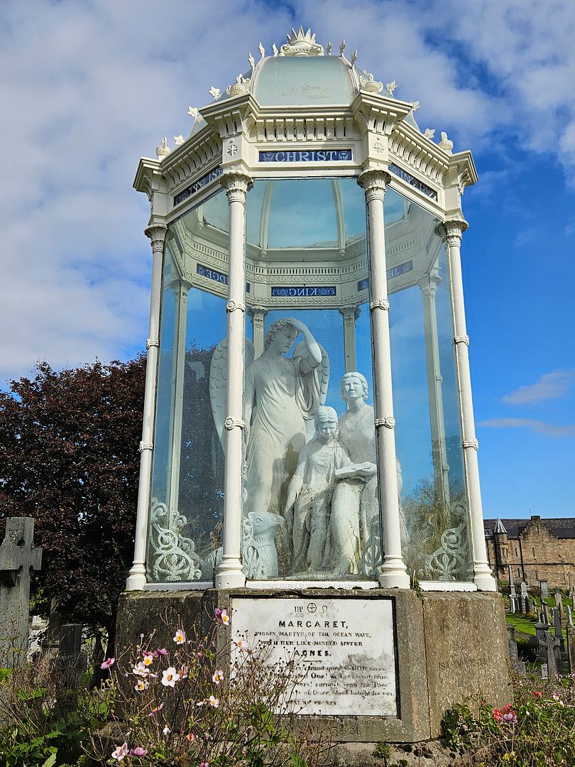 A large and ornate memorial to Margaret Wilson, one of the Wigtown Martyrs, is located on the shoulder of Ladies’ Rock in the Mar Place Cemetery. The statue shows the martyr in the act of reading the Scriptures, with her younger sister Agnes by her side. A lamb rests at their feet, and over both is a guardian angel. The statue is covered with an ornate cupola and glazing. The statue was erected in 1859 and was the work of Handyside Ritchie. Originally, the statue was open to the elements, but in 1867 an ornate cast iron frame and glass cupola was raised over it, making it one of the most distinctive monuments in Stirling, if not the whole of Scotland. The cupola was designed by John Thomas Rochead (1814-1878), who is better known for his design for the Wallace Monument on Abbey Craig. The frame was cast at the Sun Foundry in Glasgow, and when it was added, a marble lamb that lay at the feet of Margaret, had to be removed. The cost of the monument was financed by William Drummond, of the Drummond Tract Enterprise. Margaret Wilson was one of the Wigtown martyrs, two women who were drowned in the rising Solway Tide on 11 May 1685. They were both Covenanters, and the other martyr, Margaret MacLachlan, was a woman in her sixties. Drummond had a great love of the Presbyterian martyrs, and erected other memorials to them and other ministers in Stirling, including statues of Rev James Renwick, Rev Ebenezer Erskine, Rev John Knox and the Star Pyramid.