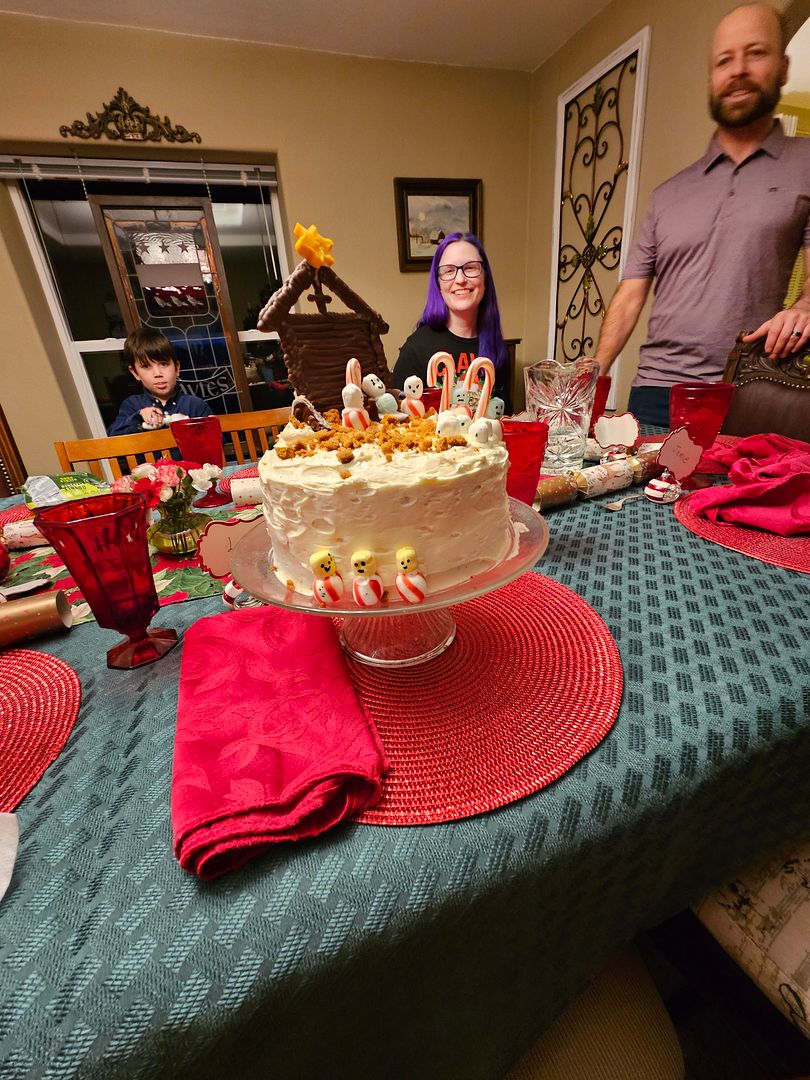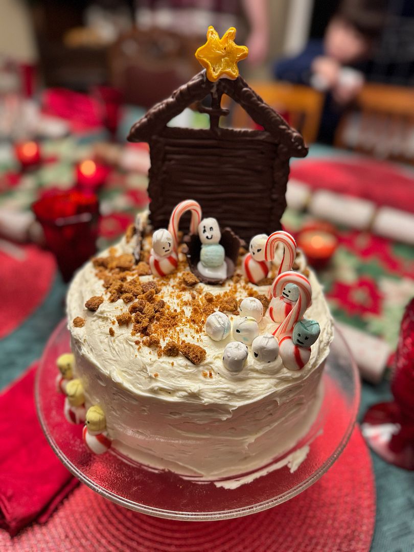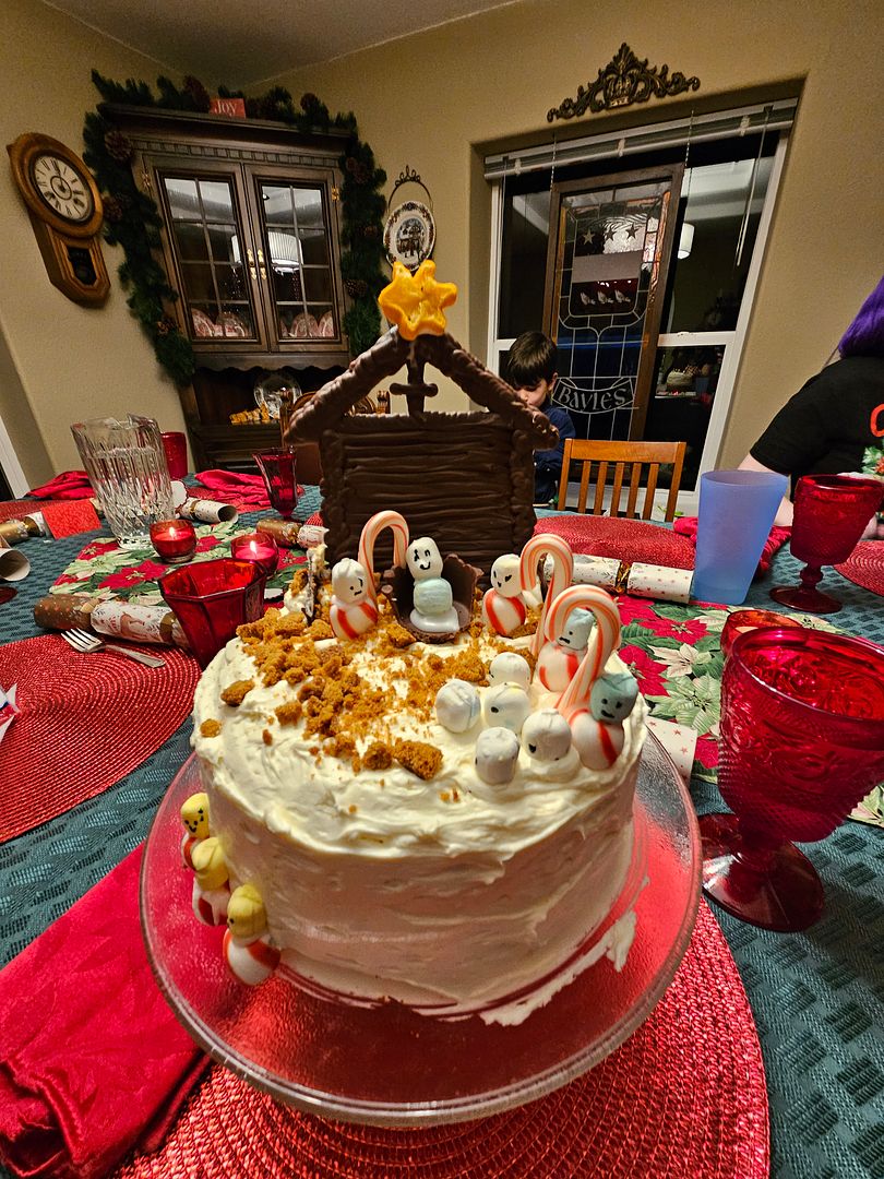 Jamie with some inspiration from Addy and JJ made a Happy Birthday Cake for Jesus with a chocolate creche and marshmallow and candy Mary, Joseph, Baby Jesus, Shepherd, sheep, shepherd crooks (candy canes), and the three wise men still on their journey.