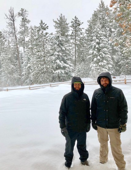 Our Sunday has started out cold with beautiful sun breaks and then some popcorn snow. Not enough snow here to cover anything. Some areas of Washington state are getting a lot. Our daughter-in-law sent us this photo of our son and son-in-law in the front yard of our middle son’s home in Northeastern Washington. They had a nice walk in the snow. All of our children are spending a weekend together in this winter wonderland. Praying for safe travels for them tomorrow.