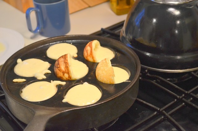 We first enjoyed these novel pancake balls when we visited the picturesque Danish village of Solvang, California. My husband bought his own pan to make them at home before we were married. We still have that pan.