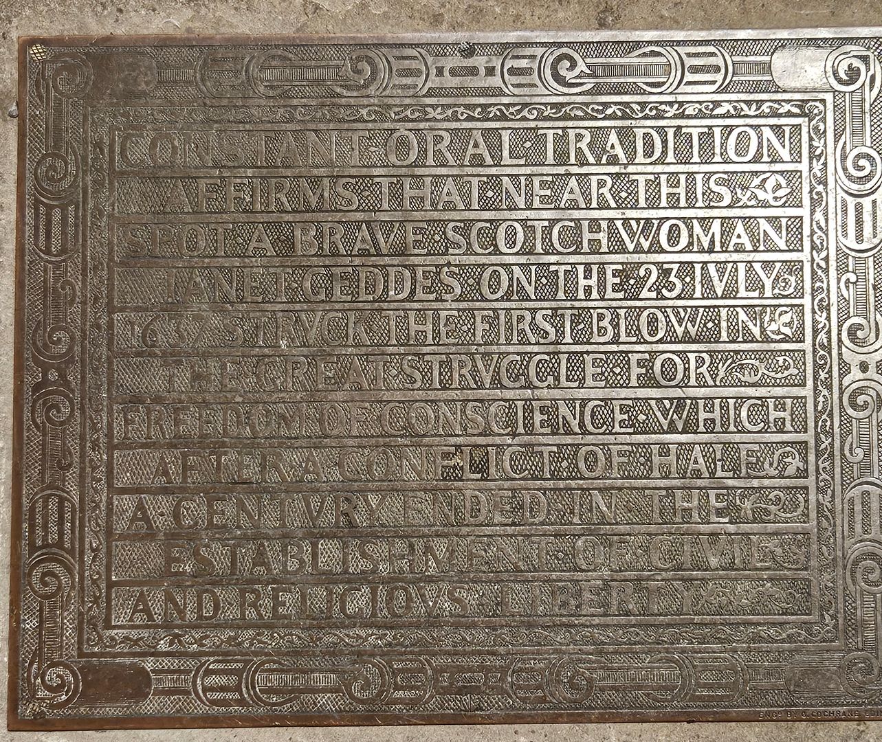 “Constant oral tradition affirms that near this spot a brave Scotch woman Janet Geddes on the 23 July 1637 struck the first blow in the great struggle for freedom of conscience which after a conflict of half a century ended in the establishment of civil and religious liberty.”