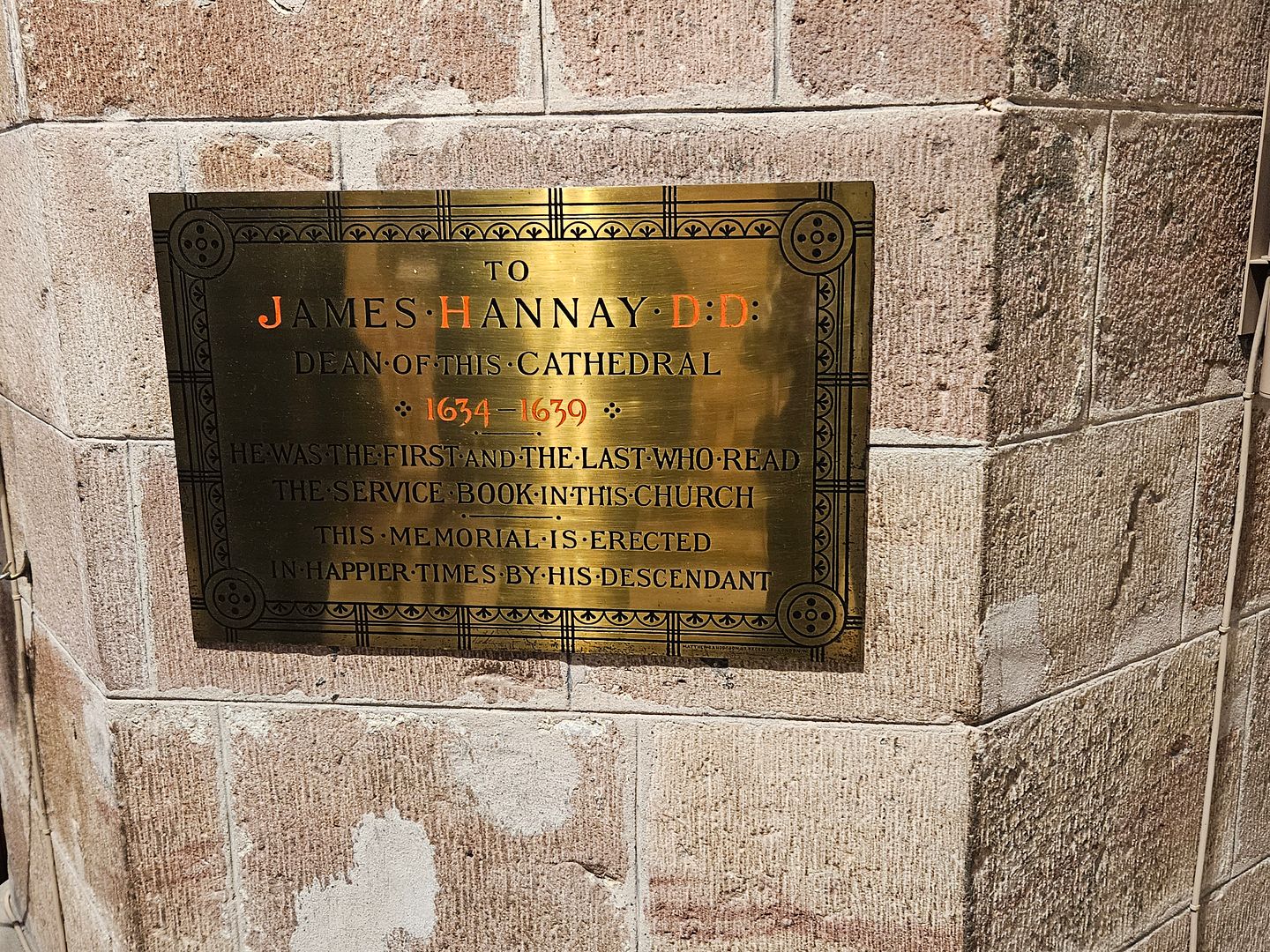 This plaque made me chuckle. James Hannay D.D. the Dean of this Cathedral, 1634-1639, He was the first and the last who read the service book in this church. This memorial is erected in happier times by his descendants.