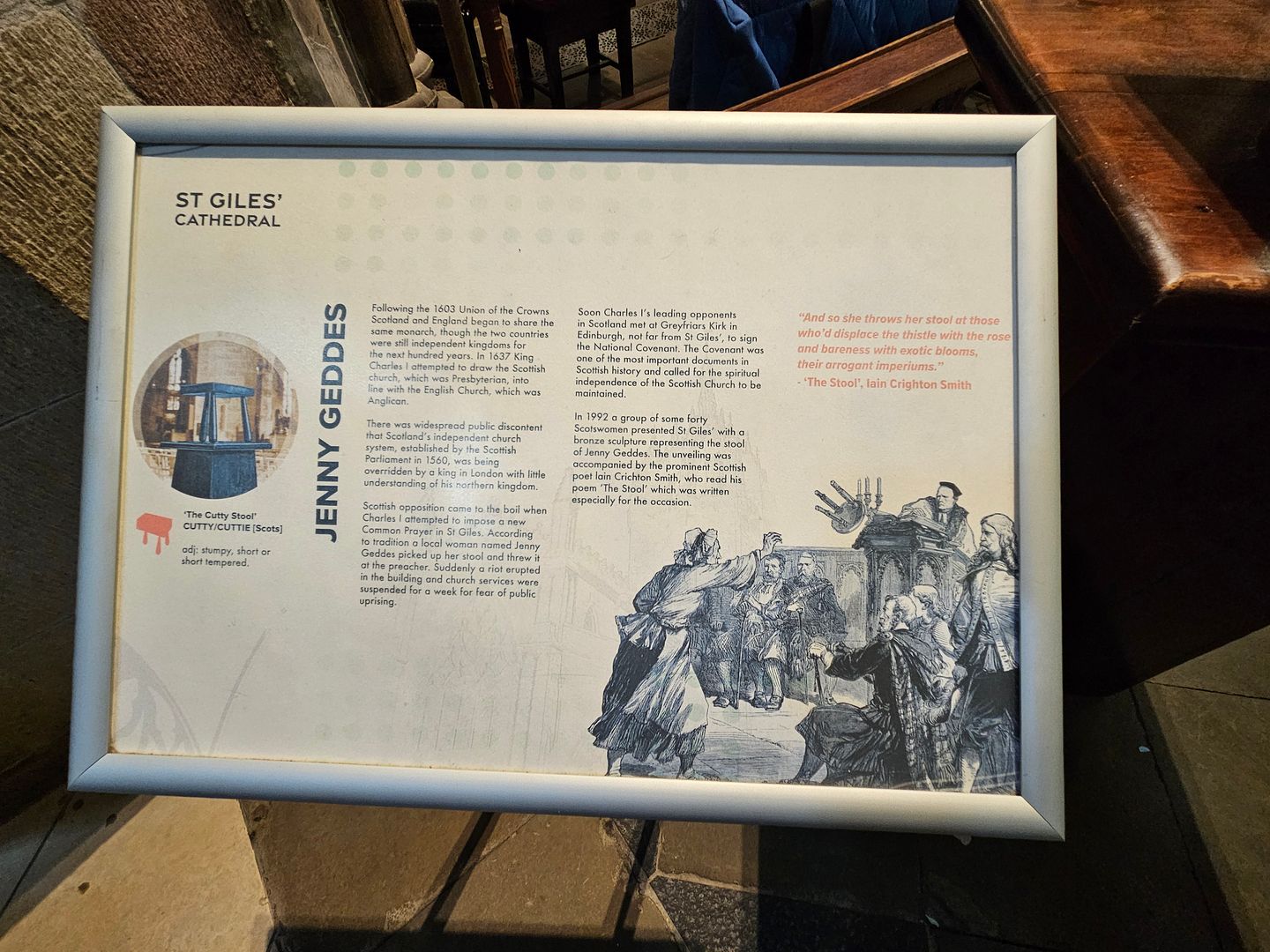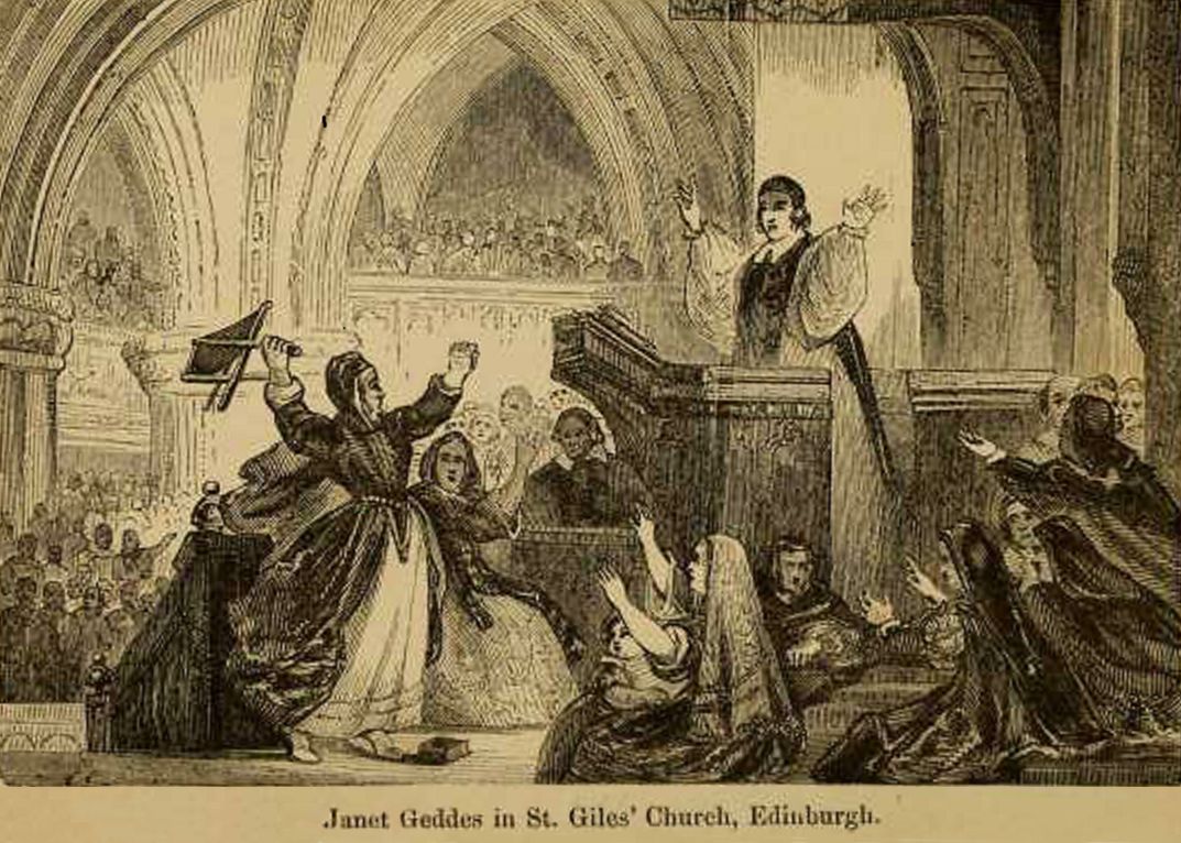 On 23 July, 1637 Dean Hannay rose to read the new liturgy in the High Church of Edinburgh, St. Giles. The liturgy had nineteen chapters within its forty-three pages “detailing how the church should be governed, from the King gaining his position from God, down to the renaming of ministers, kirk sessions, and presbyteries with terms taken from the Episcopal Church.” As the pastor began intoning from the prayer book, Jenny Geddes, allegedly a local street vendor, stood up and yelled, “Wha dur say mass in my lug!” (How dare you say the Mass in my ear) and flung her three-legged stool at the minister. Pandemonium broke out as others followed suit and the prelatical entourage fled the scene out a back door. The town guard had to rescue the bishop from the rioters. Similar scenes were enacted in other Scottish towns where the liturgy was read.
