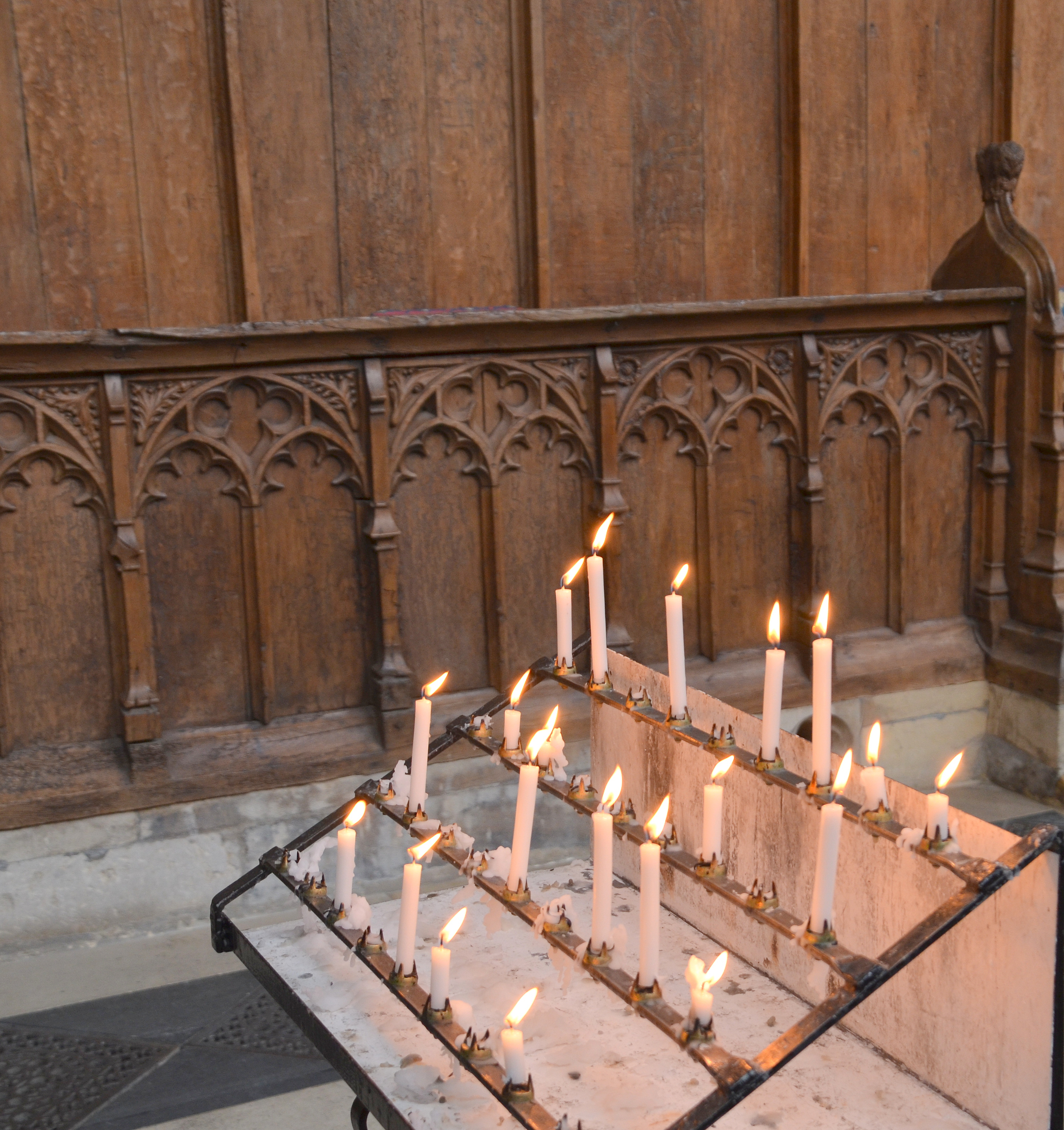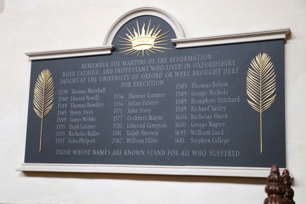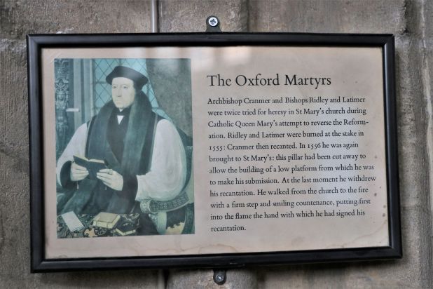 Archbishop Cranmer and Bishops Ridley and Latimer were twice tried for heresy in St. Mary’s church during Catholic Queen Mary’s attempt to reverse the Reformation. Ridley and Latimer were burned at the stake in 1555: Cranmer then recanted. In 1556 he was again brought to St. Mary’s: this pillar had been cut away to allow the building of a low platform from which he was to make his submission. At the last moment he withdrew his recantation. He walked away from the church to the fire with a firm step and smiling countenance, putting first into the flame the hand with which he had signed his recantation.
