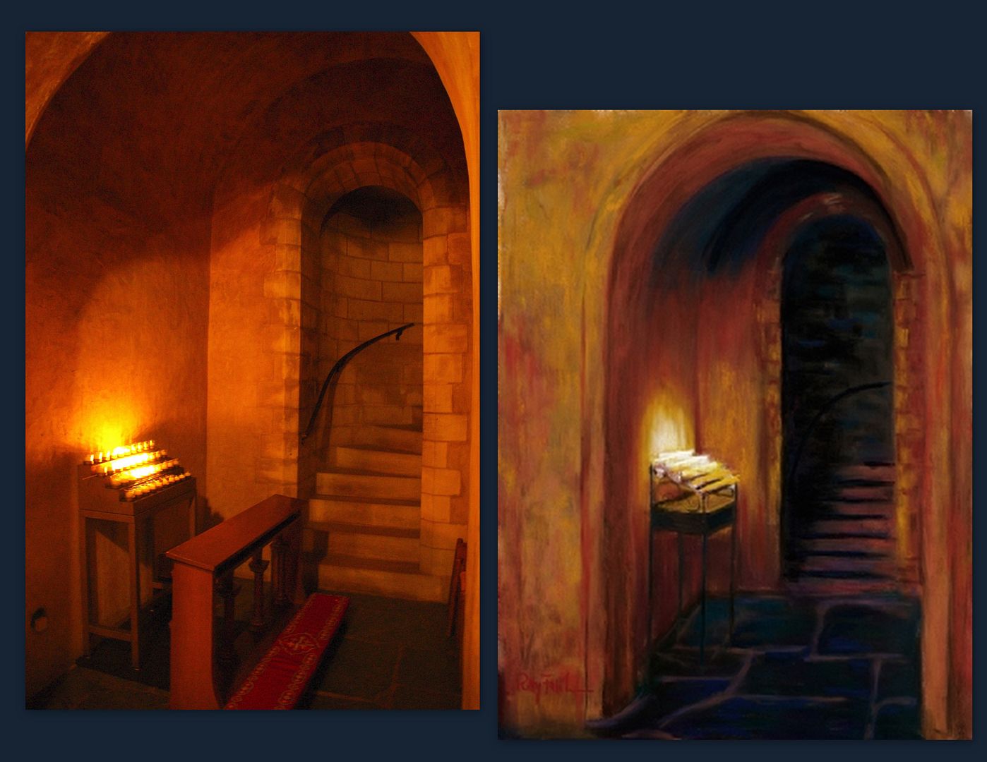 On the left is a tucked away staircase in the crypt of the National Cathedral in Washington D.C. On the right is a painting we own that was painted by a friend of ours. We knew she was inspired by this scene and when we visited the cathedral we were on a quest to find it. It was a joy to see the original. It makes us enjoy our painting even more.