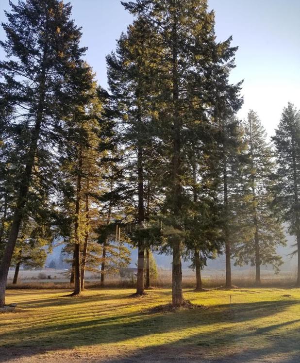 The trees in our front yard in the morning sunshine.