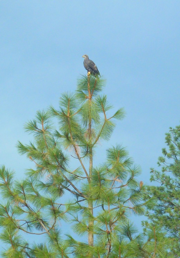 Perched a’Top the tall tree hanging on with it’s talons.