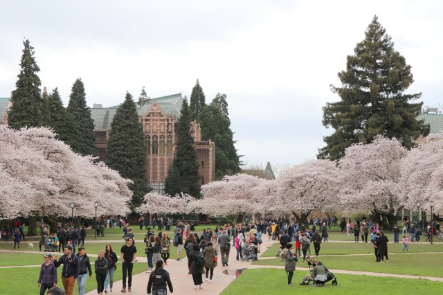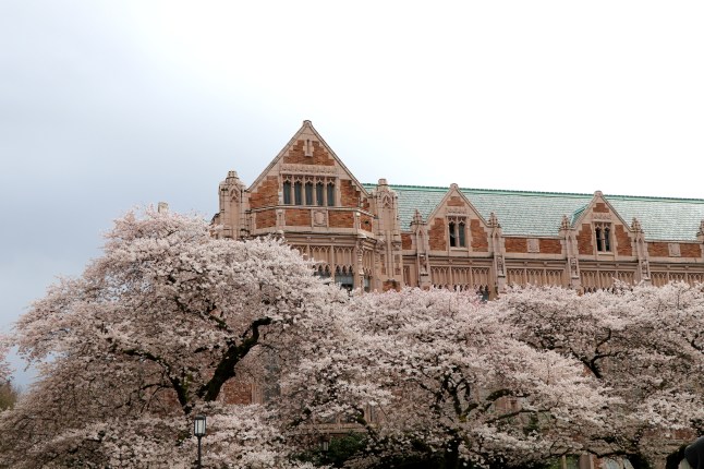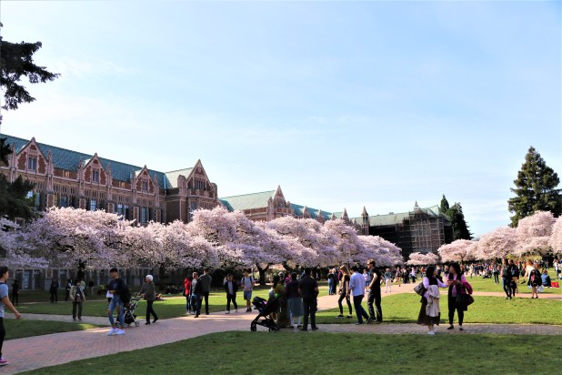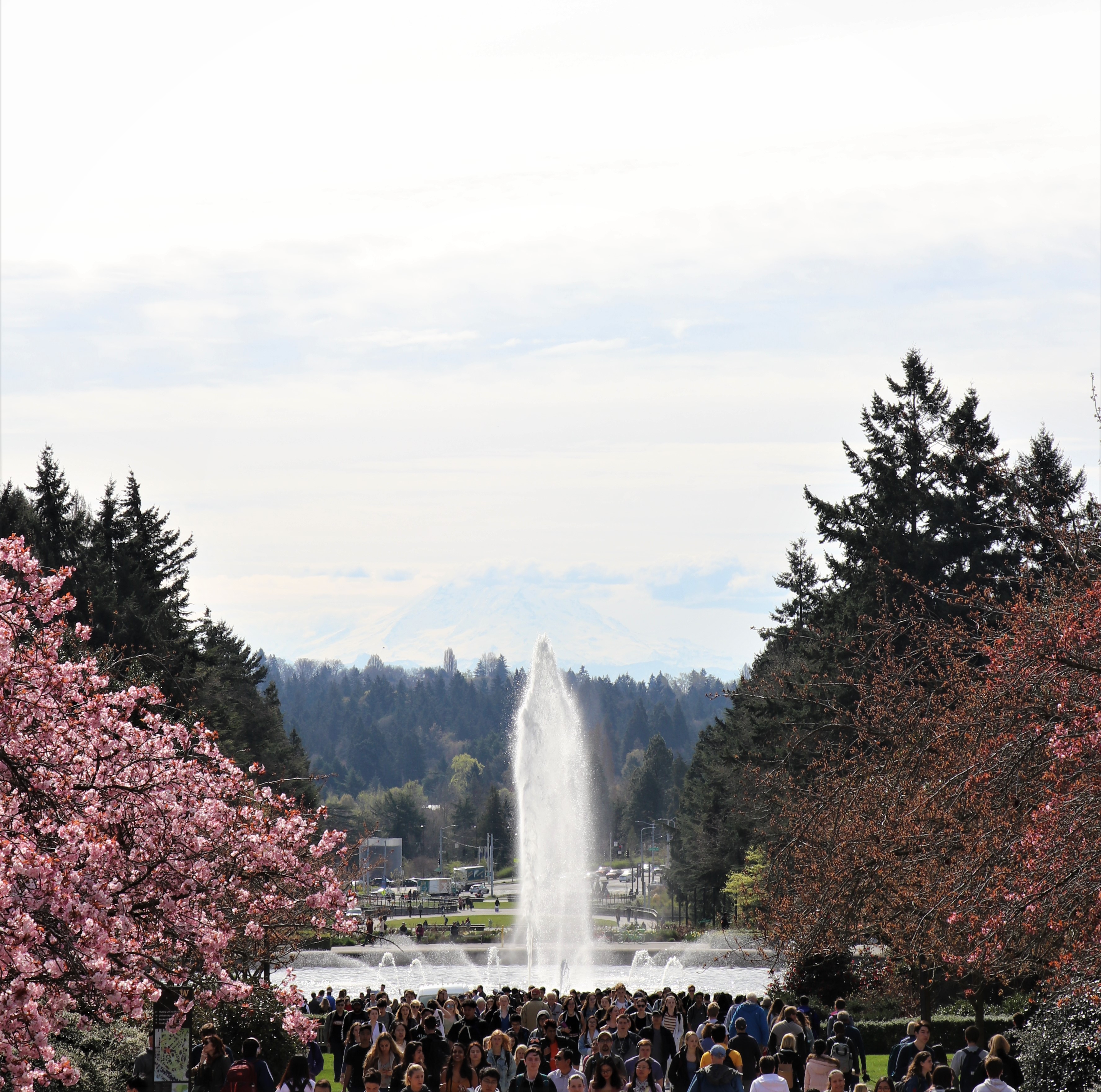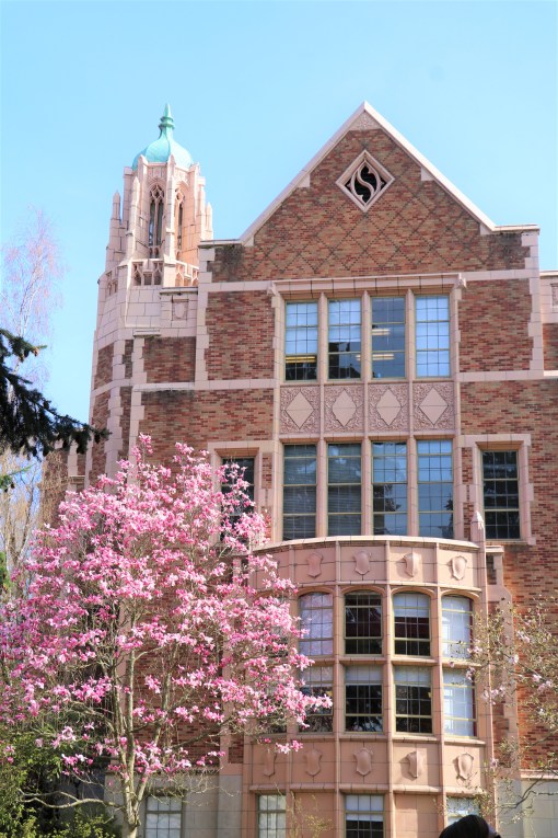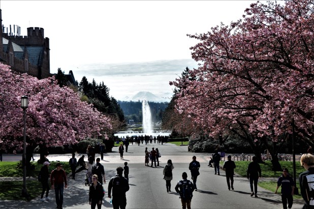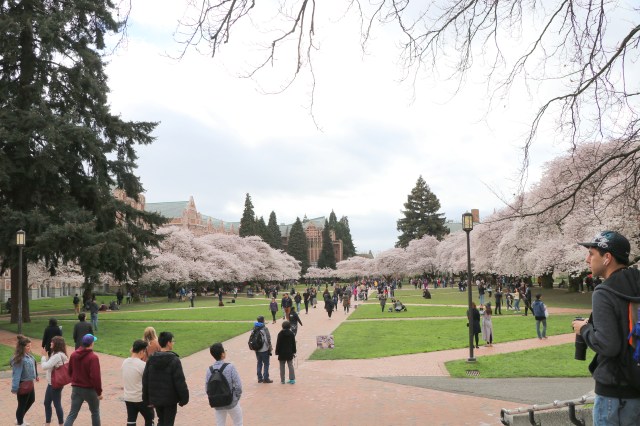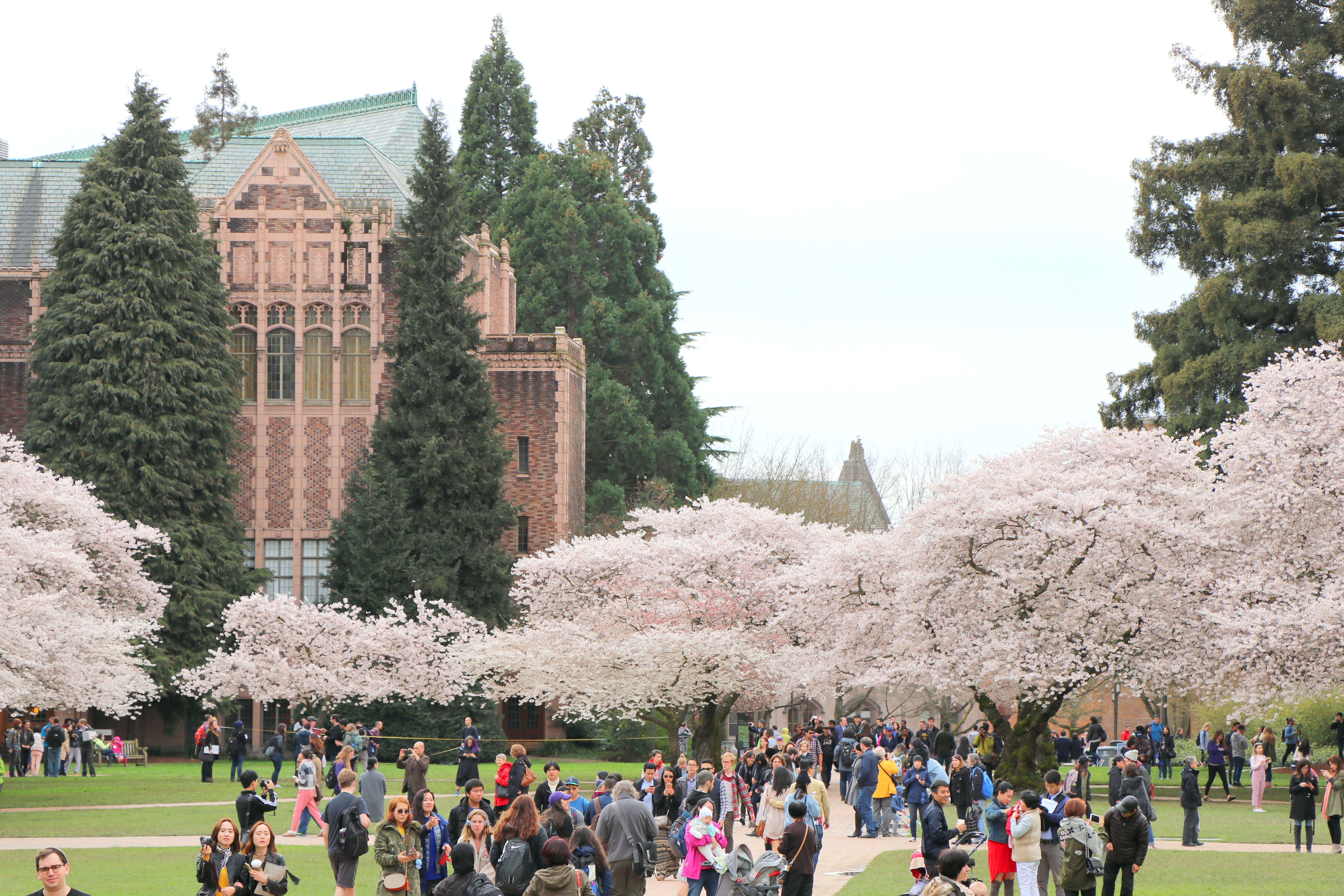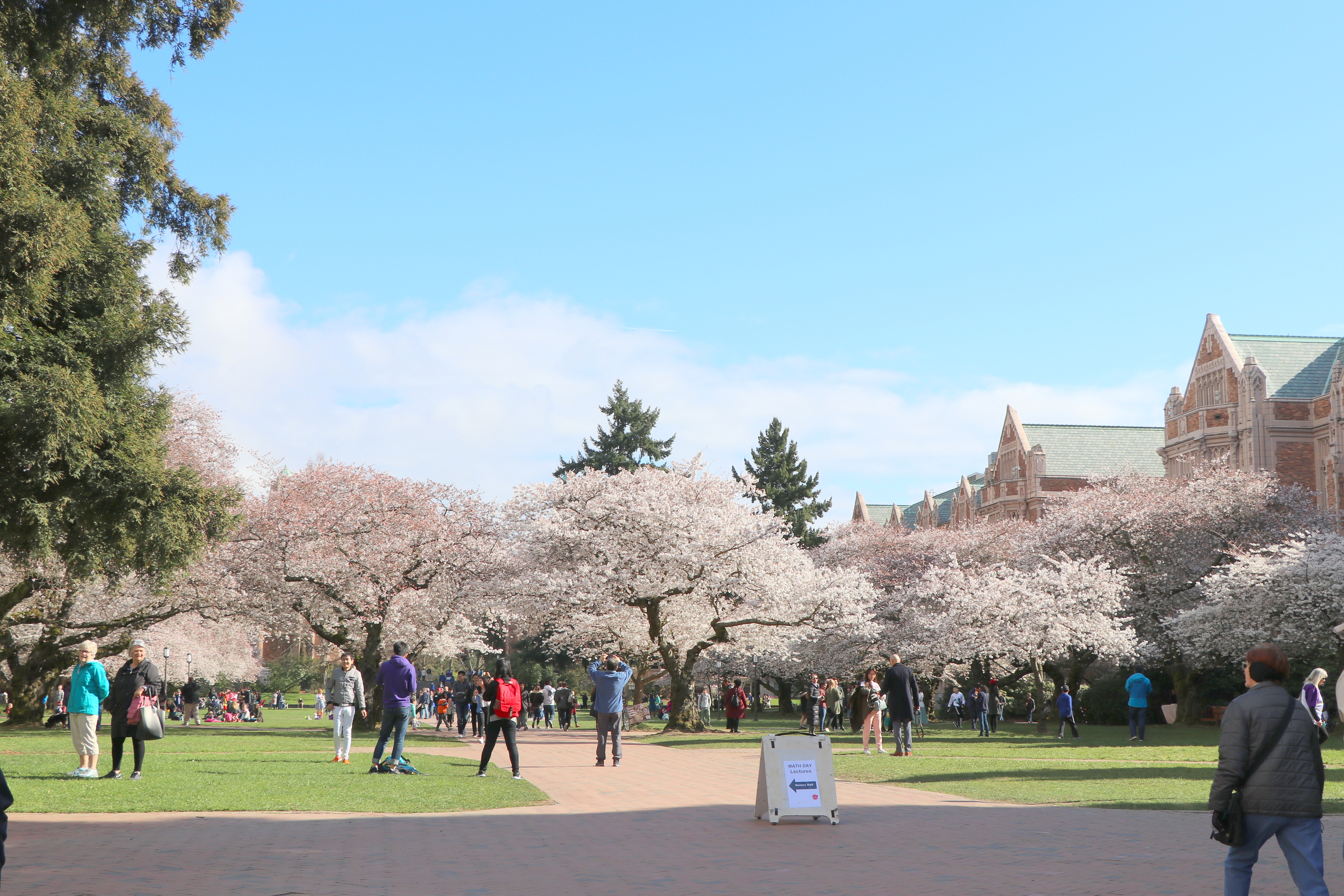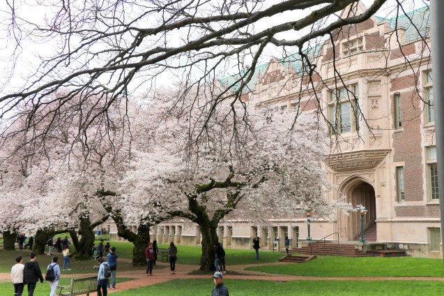 When we were done with the blossoms and headed back to the parking garage, Rainier was hiding but all the students were out in full force! I took a couple more photos on the way to the parking garage.