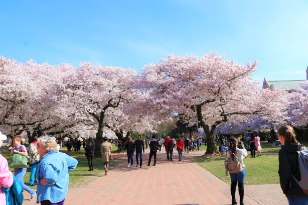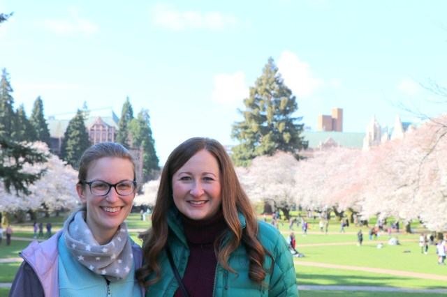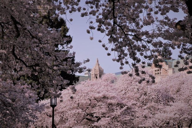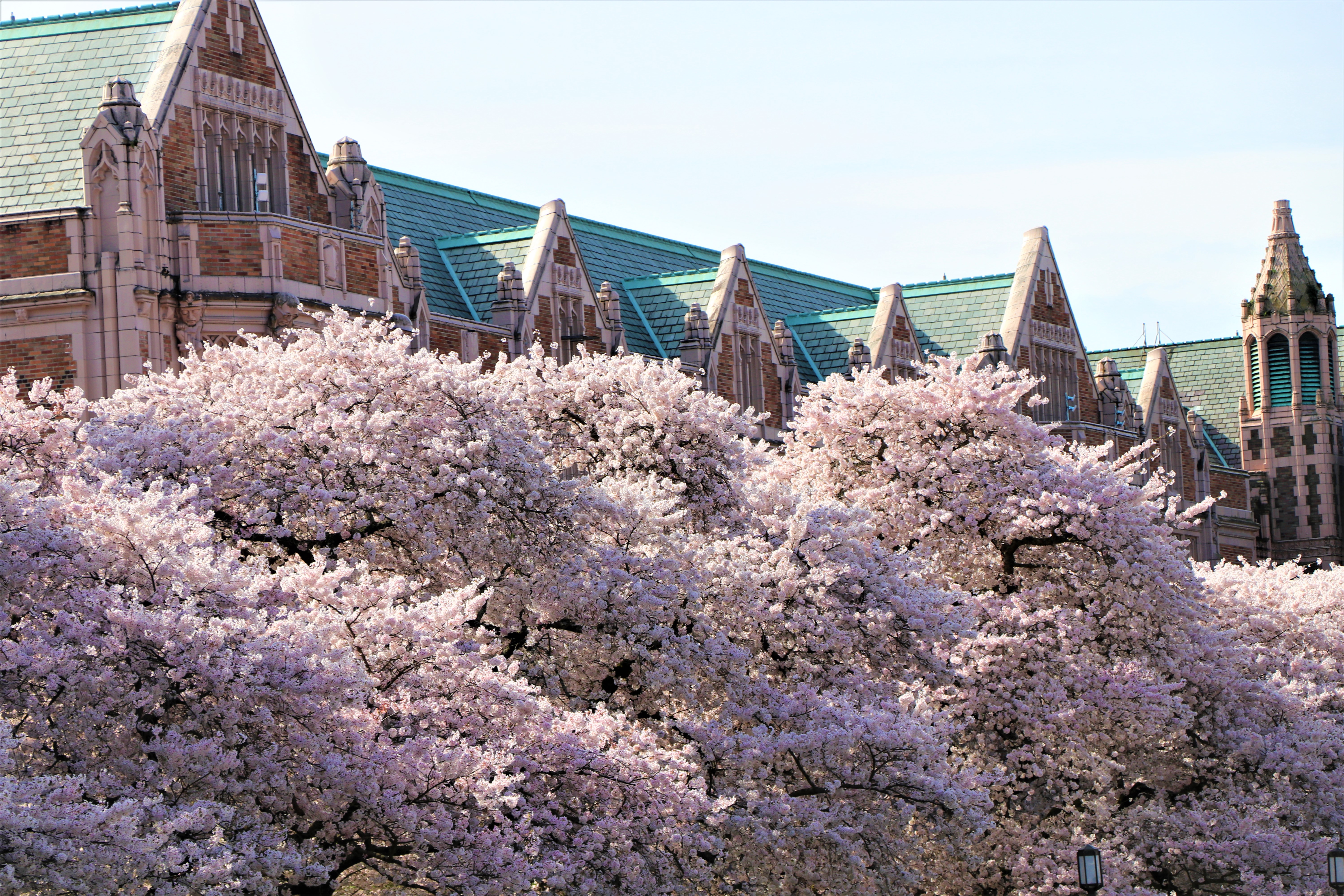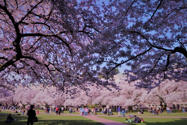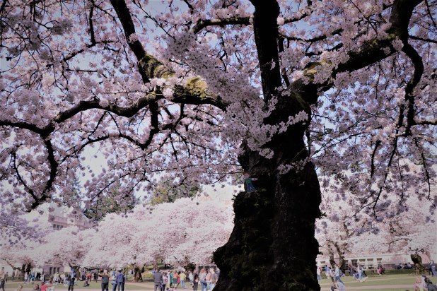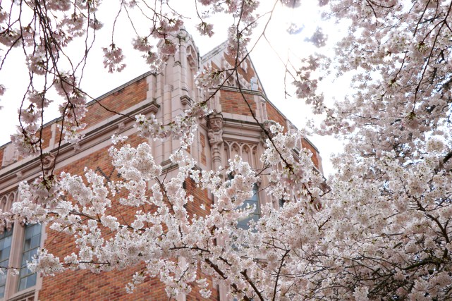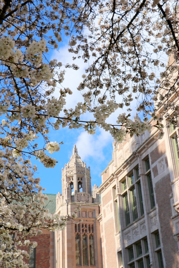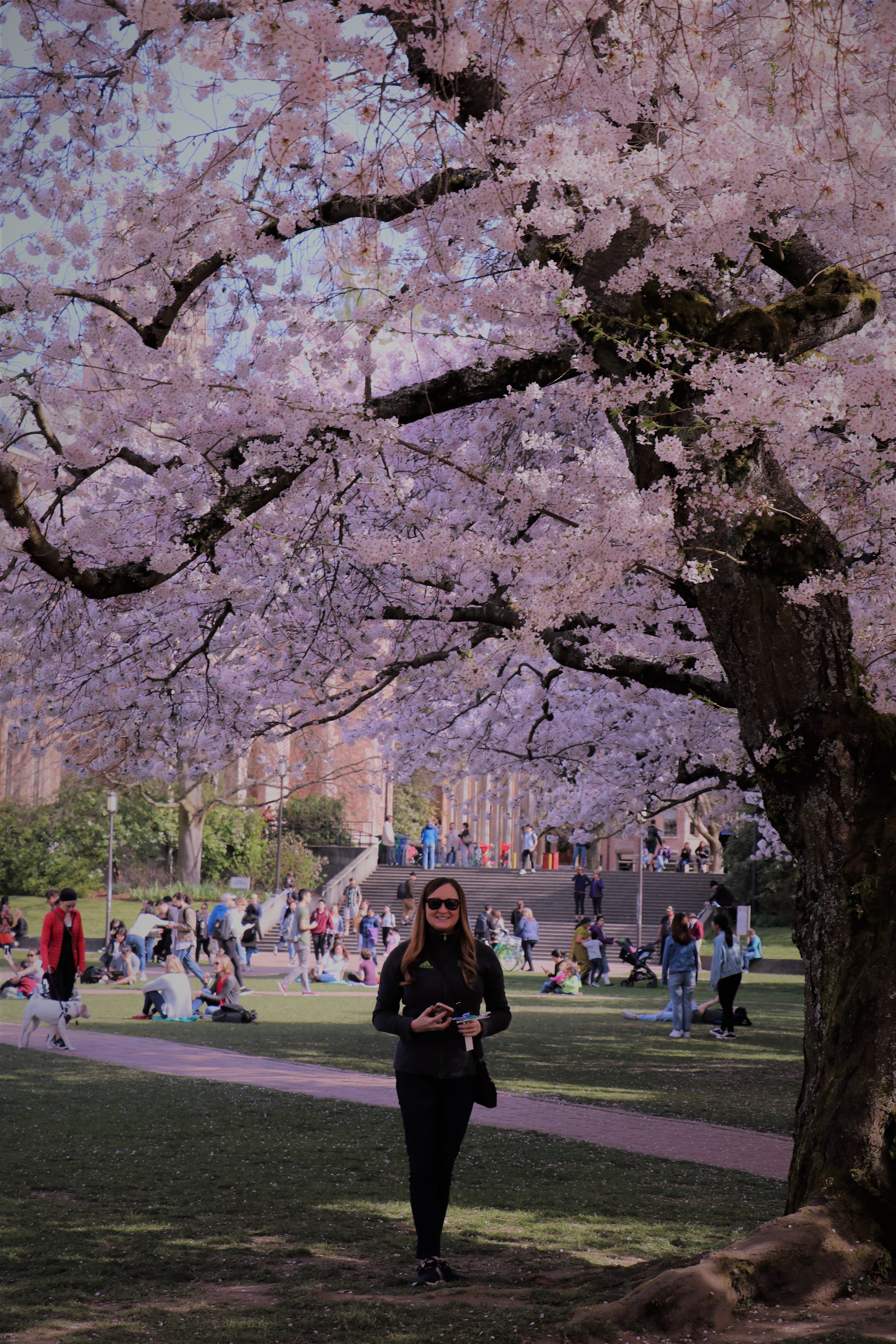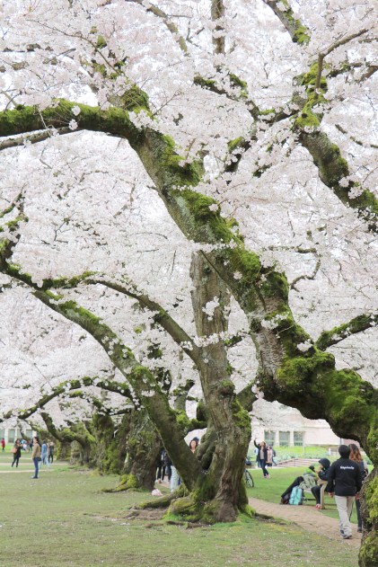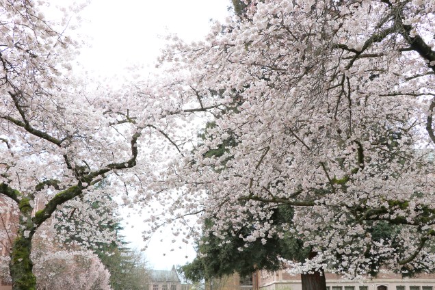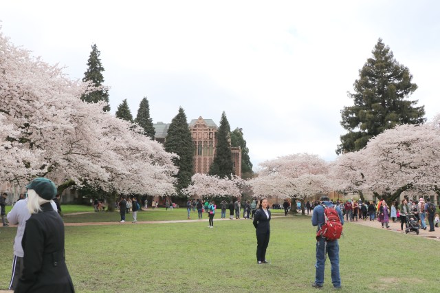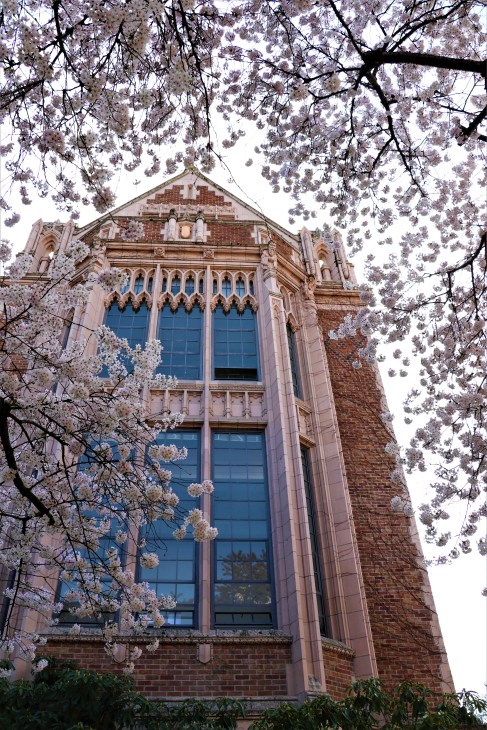 When we were done with the blossoms and headed back to the parking garage, Rainier was hiding but all the students were out in full force! I took a couple more photos on the way to the parking garage.
