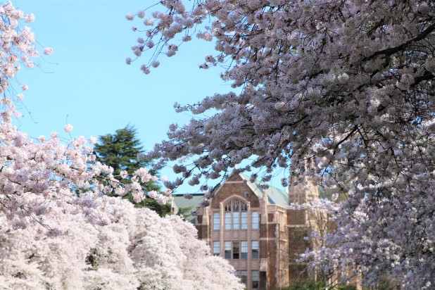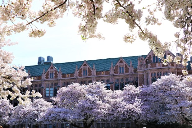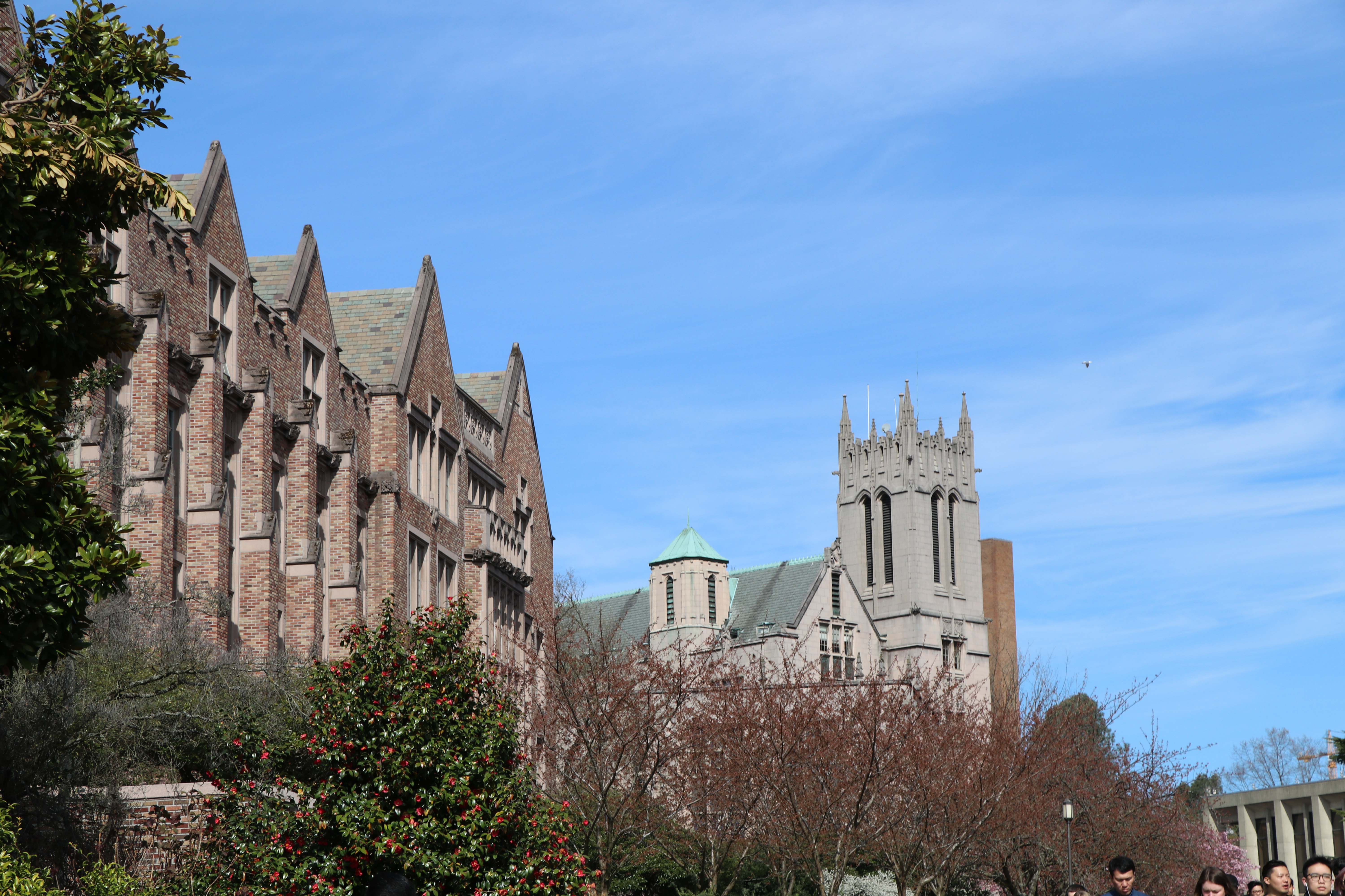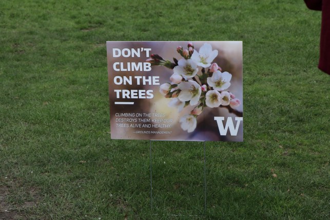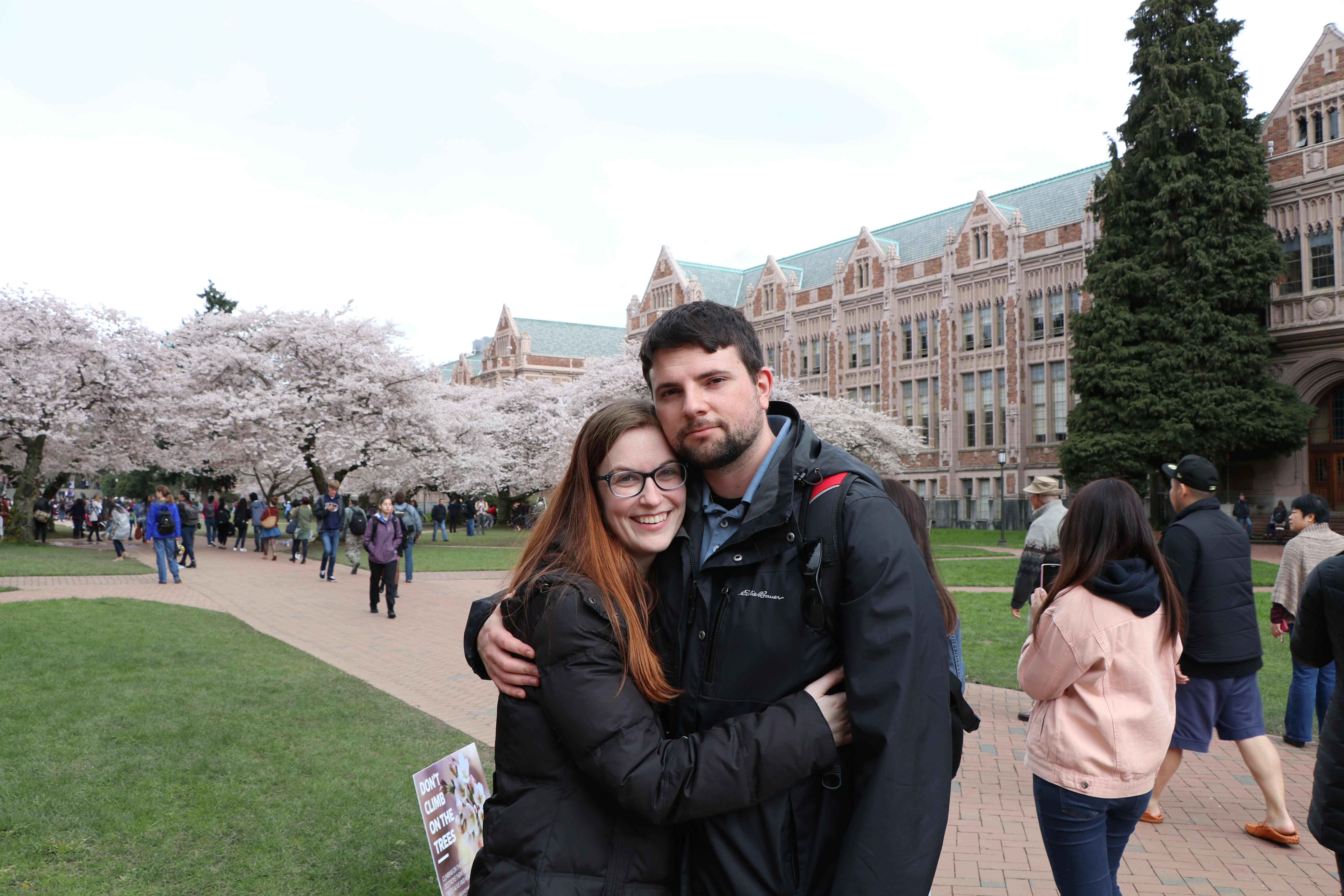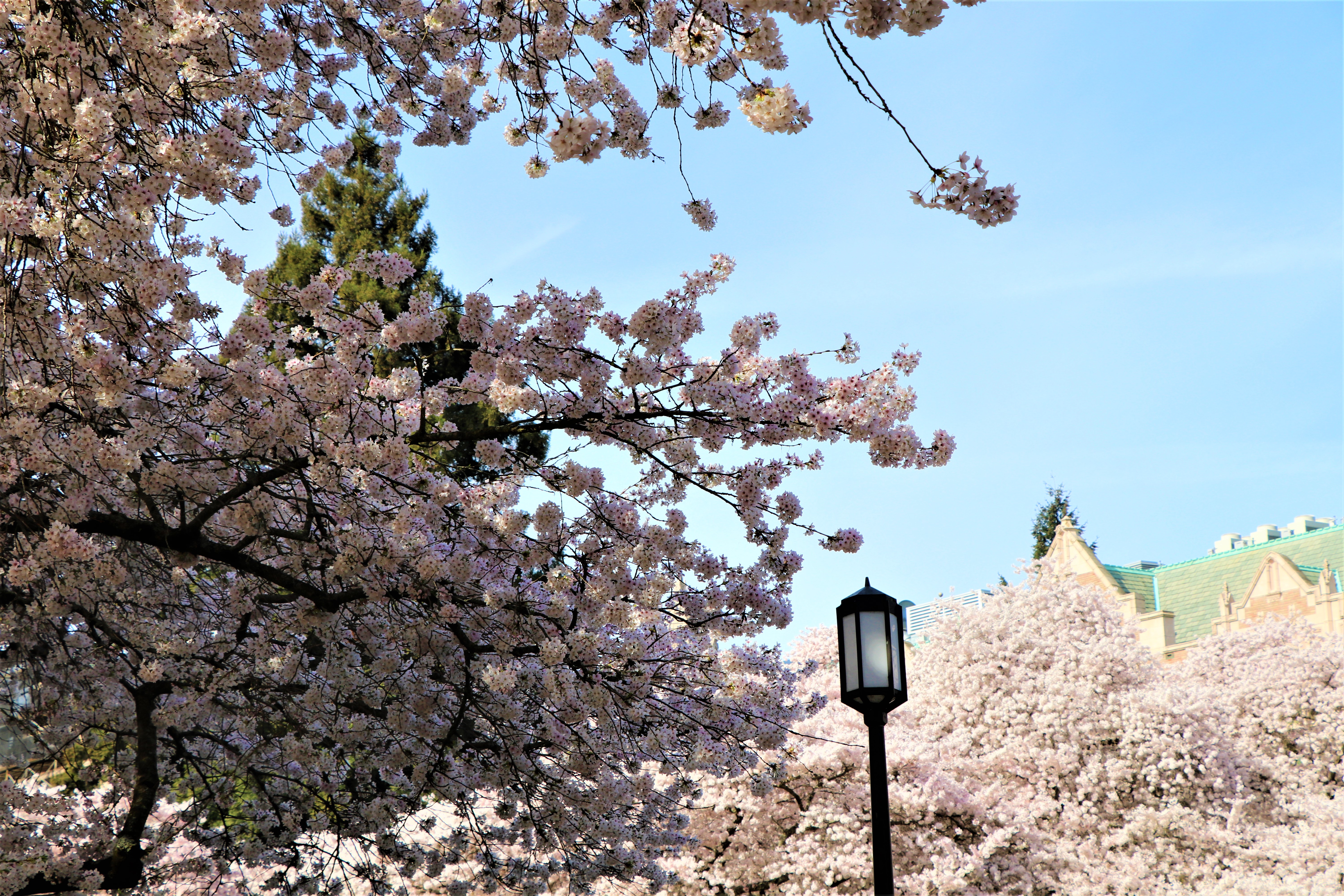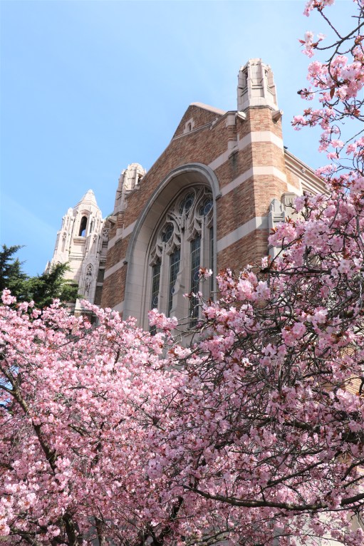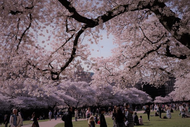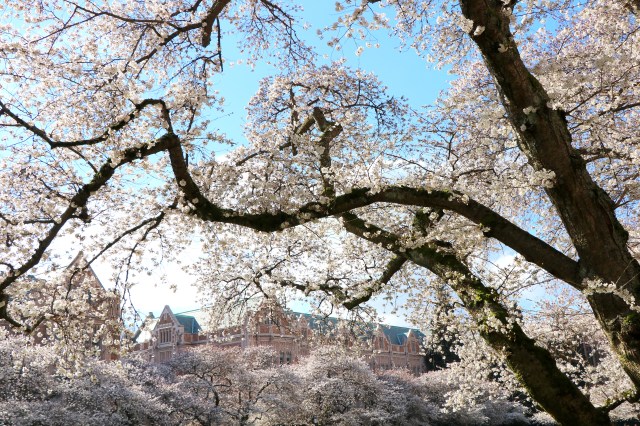 When we were done with the blossoms and headed back to the parking garage, Rainier was hiding but all the students were out in full force! I took a couple more photos on the way to the parking garage.