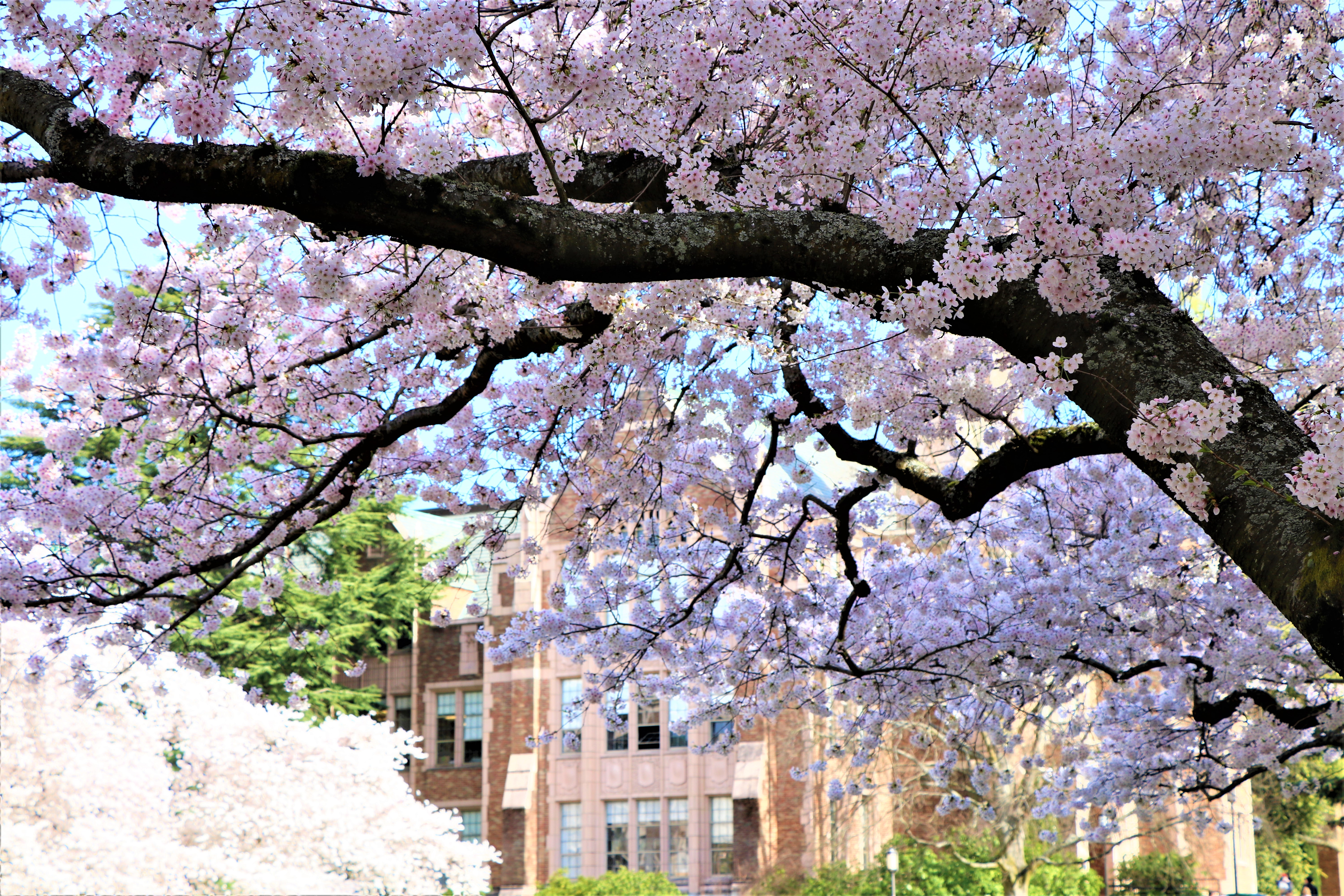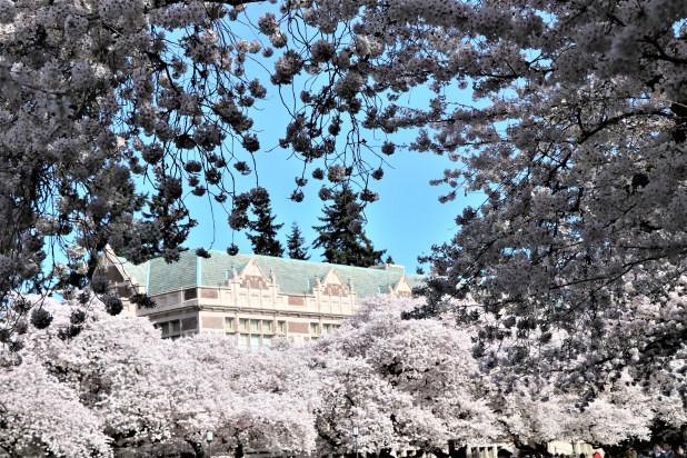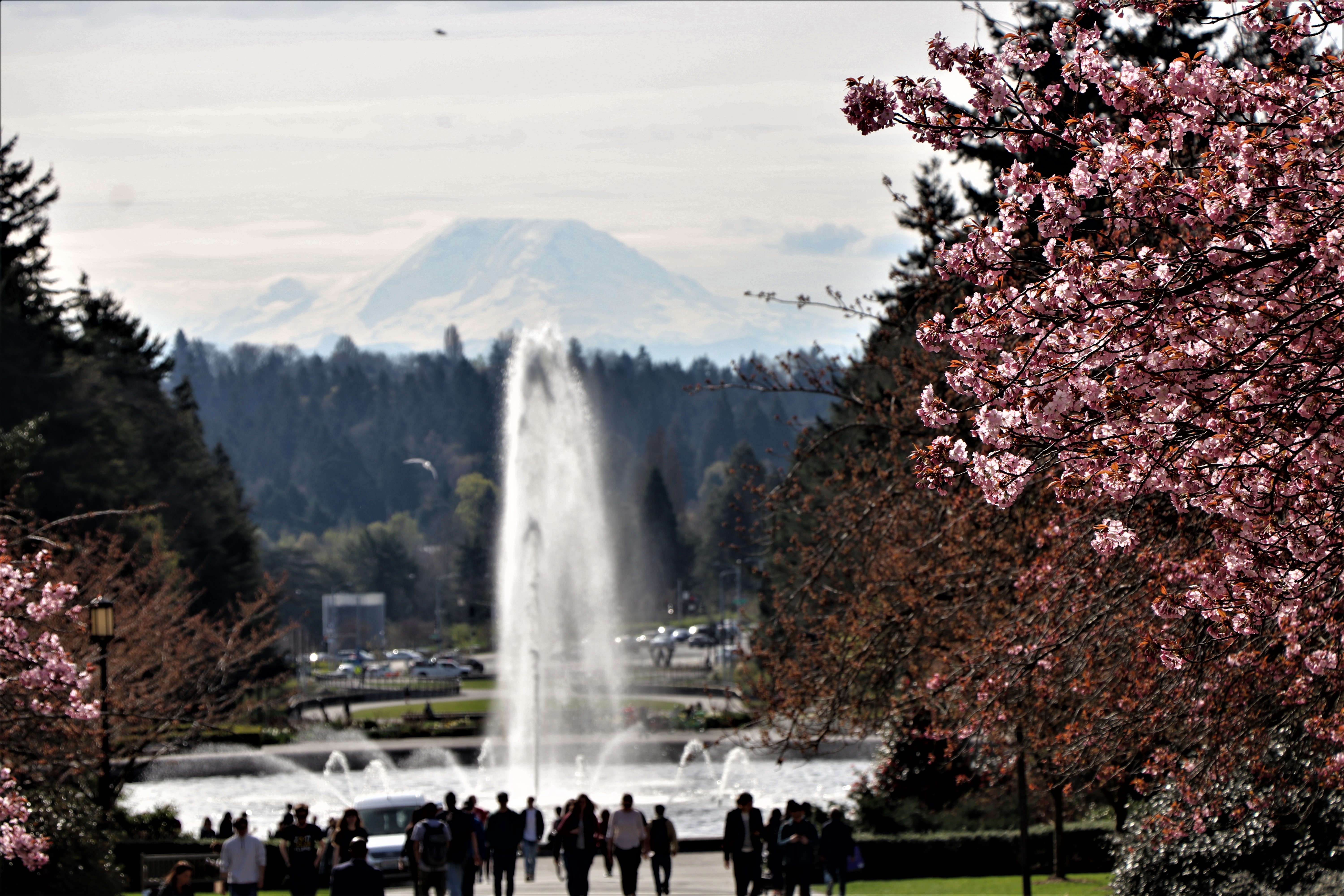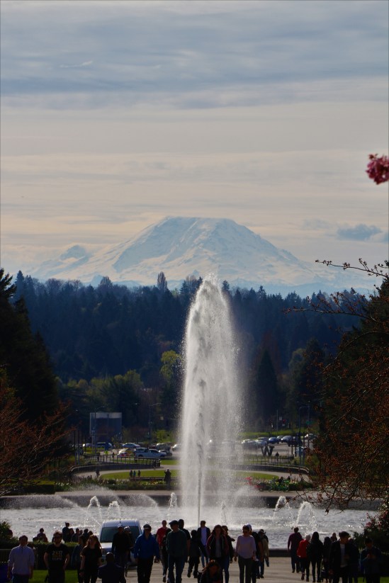 When our daughter-in-law and I arrived at the University of Washington a couple of weeks ago to see the cherry blossoms we first looked towards the Drumheller Fountain and the Rainier Vista beyond it. We were very excited to see that Mount Rainier was not shrouded in clouds as is the case on many days.