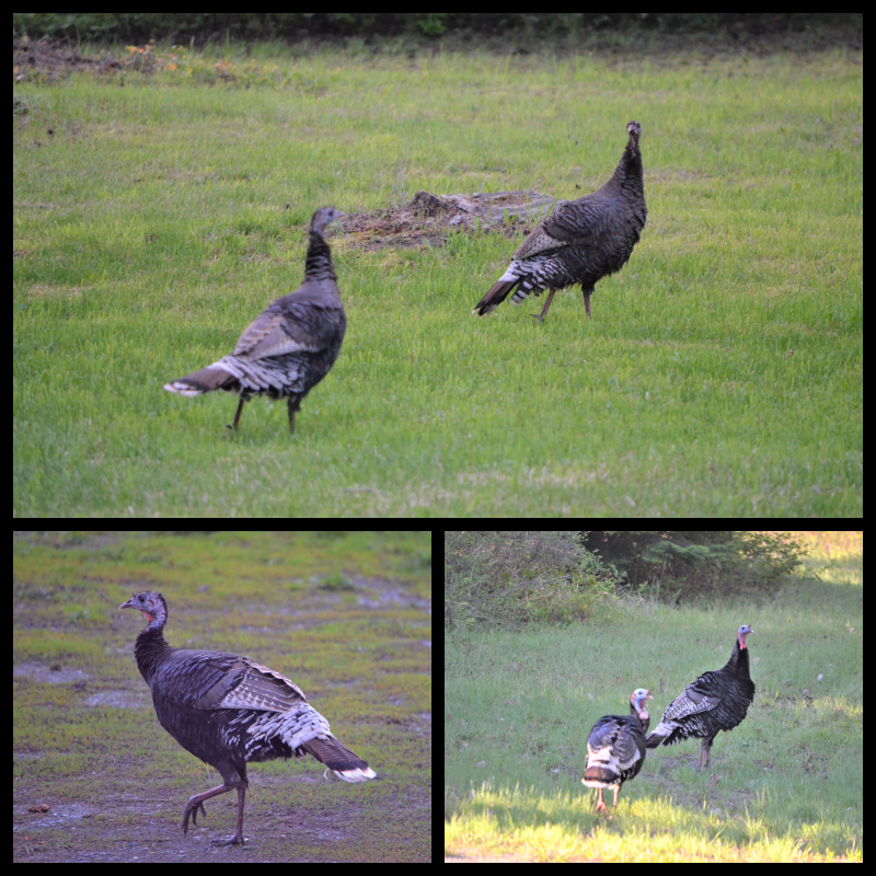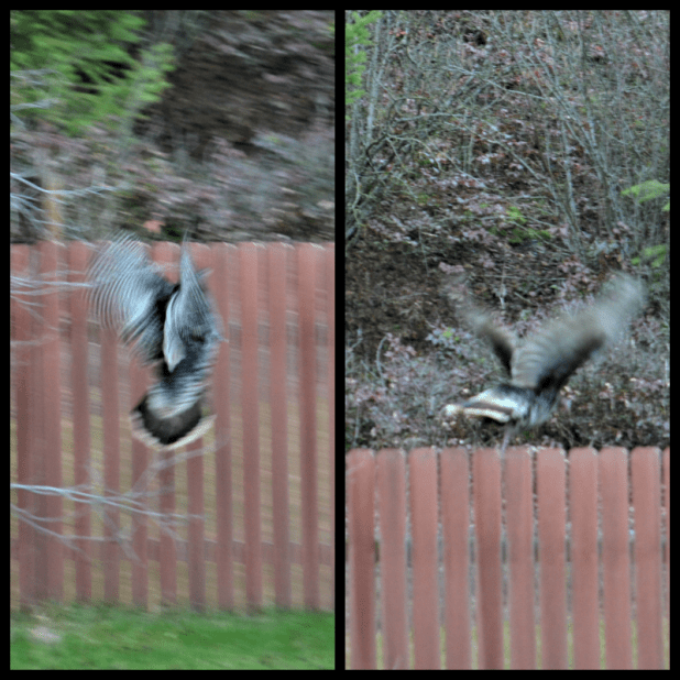 This turkey kept pacing our side fence and it seemed like it’s bird brain could not figure out how to get out of our backyard. Dear went on the deck and made some noise and it finally realized it could fly over the fence.
