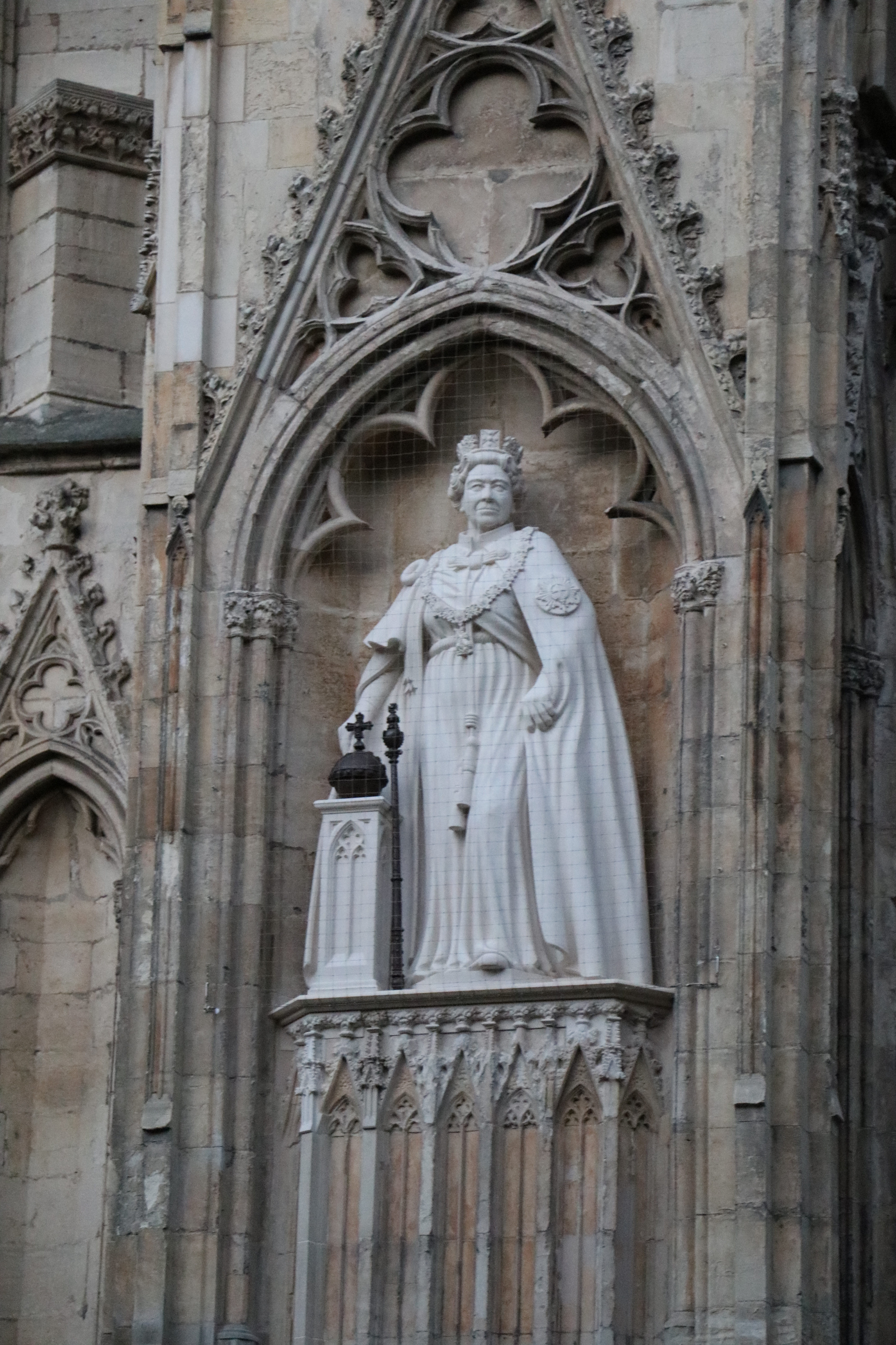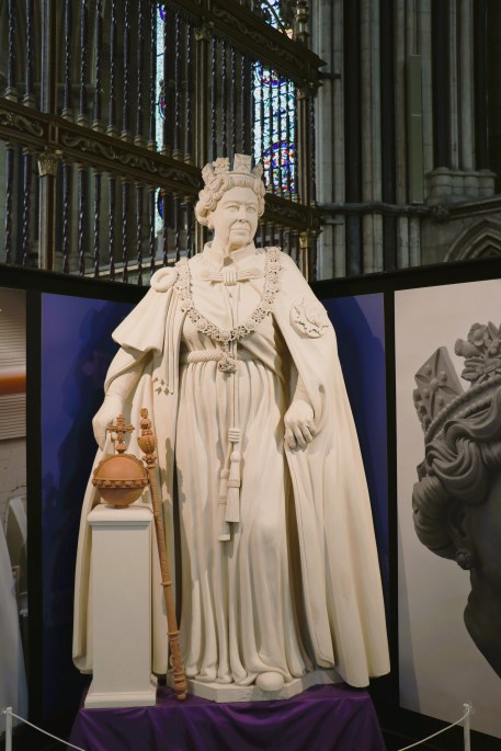 This statue of Queen Elizabeth is a new addition in a niche at the front of York Minster. The full story and progress of the creation of the statue was on display inside the Cathedral.