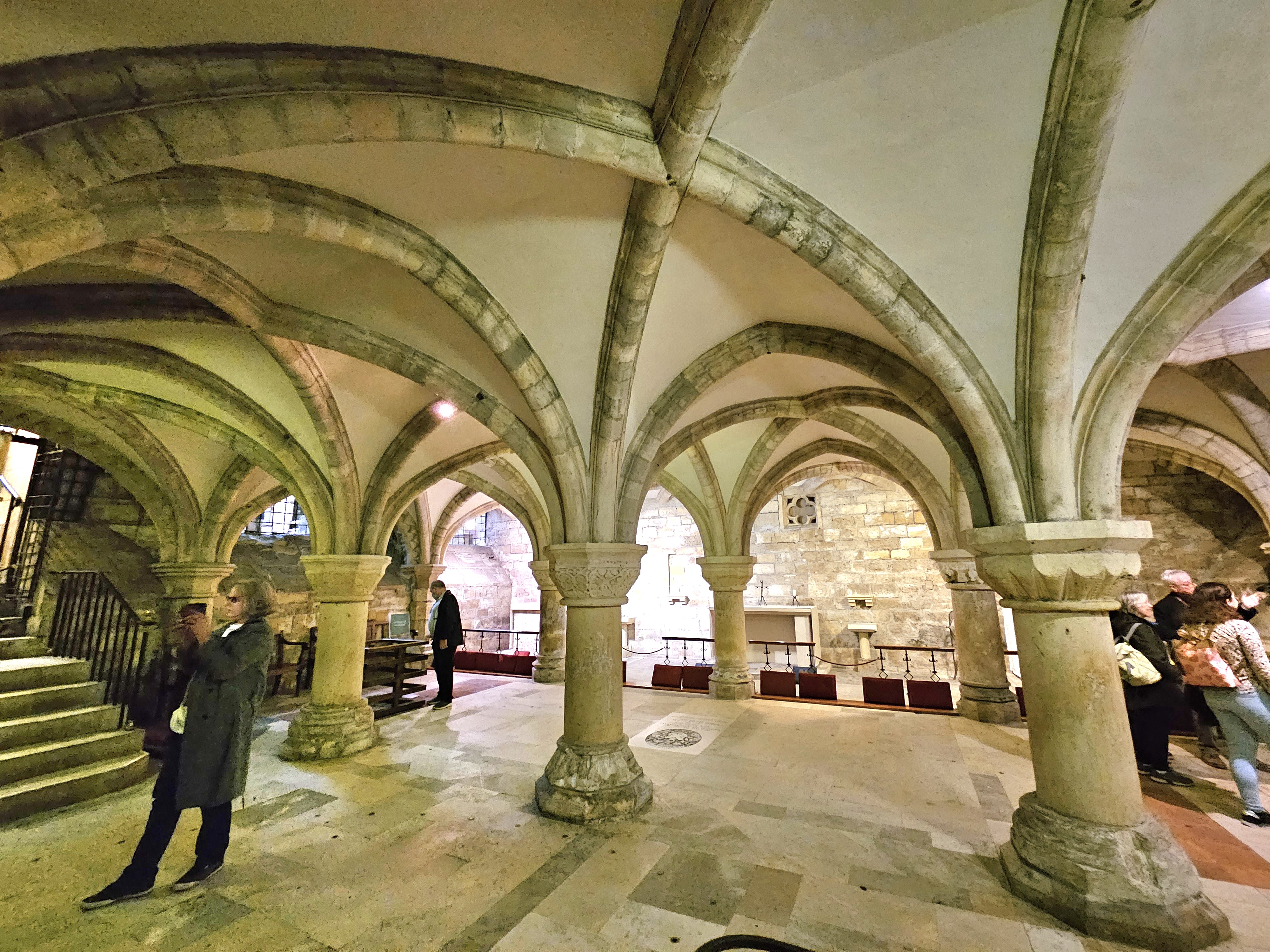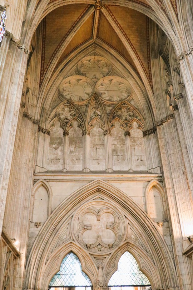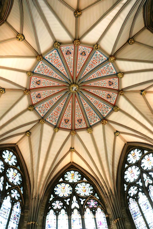 The ribbed wooden roof is truly a masterpiece of medieval architecture, with colourfully painted panels and a profusion of gilded bosses . Unlike other chapter houses, such as that of Wells Cathedral, there is no central column to support the roof vaulting; the ceiling is “free-standing” if you will, seeming almost to hang in space.